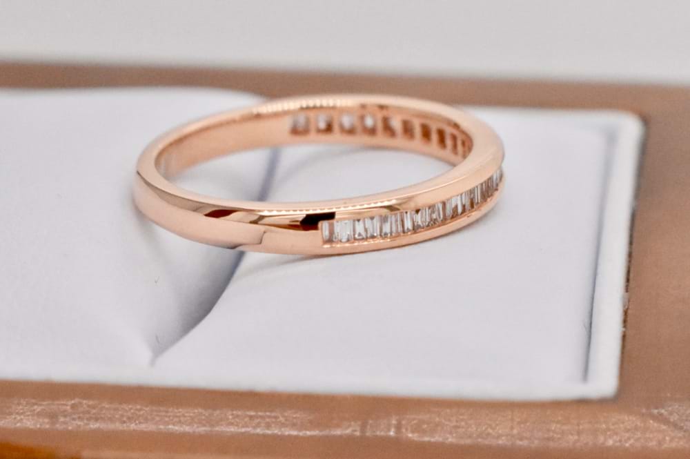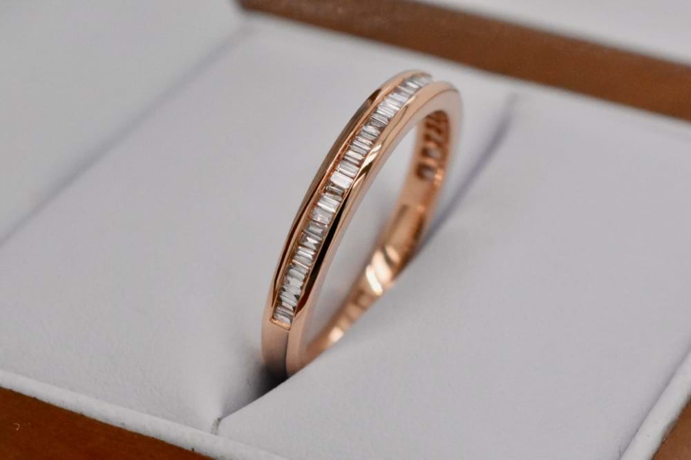 18ct Rose Gold ring featuring 42 baguette cut diamond, channel set across the band totaling 0.20ct (GH/VS). Independent Valuation Supplied. Finger size M