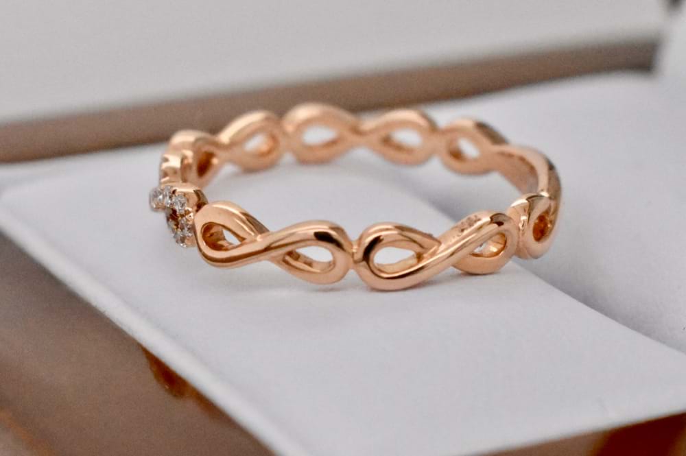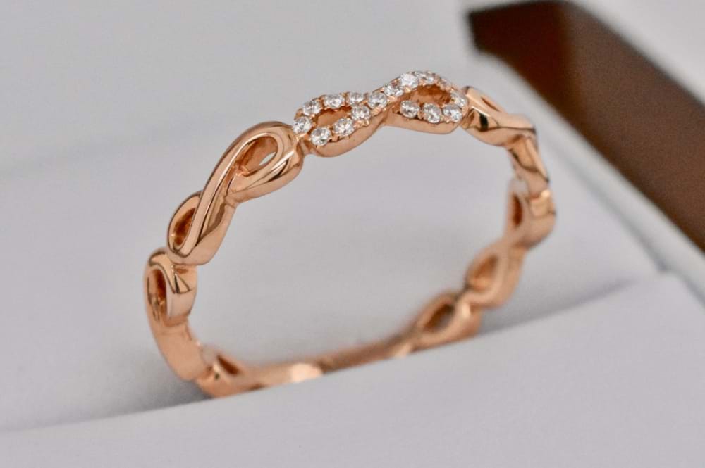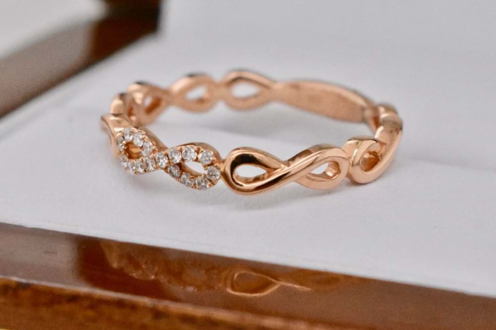 Beautiful, delicate, dress ring crafted in18ct rose gold infinity ring encrusted with diamonds. 16 diamonds = 0.07ct. Finger Size M 1/2