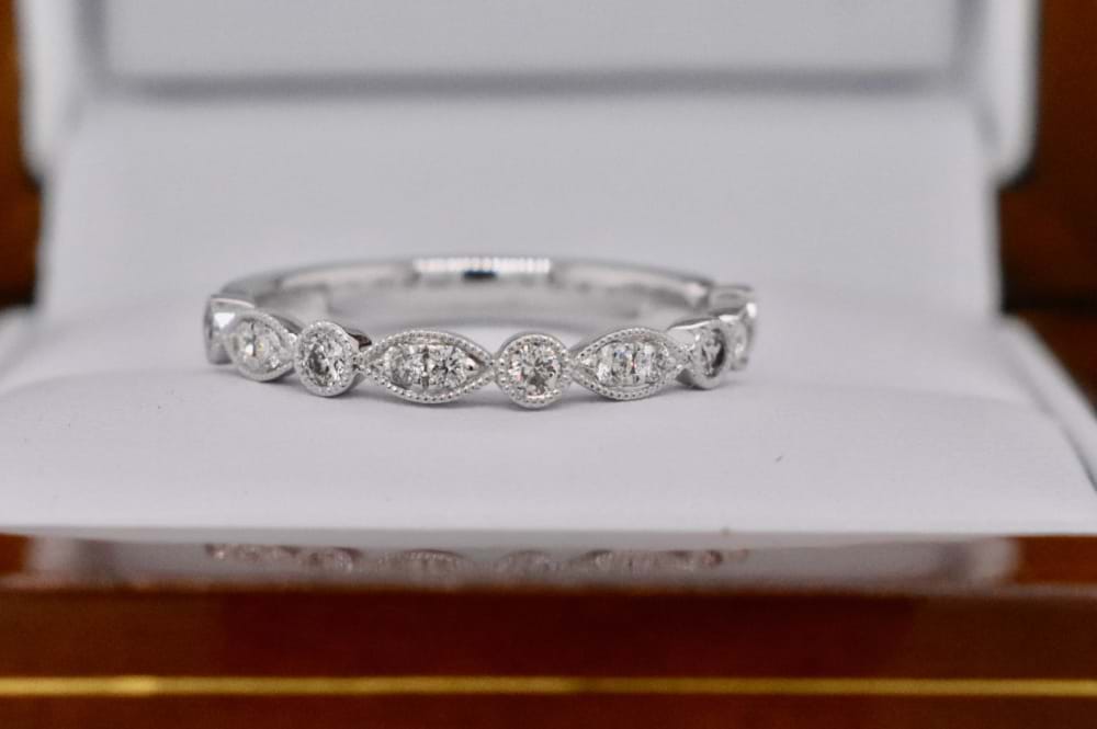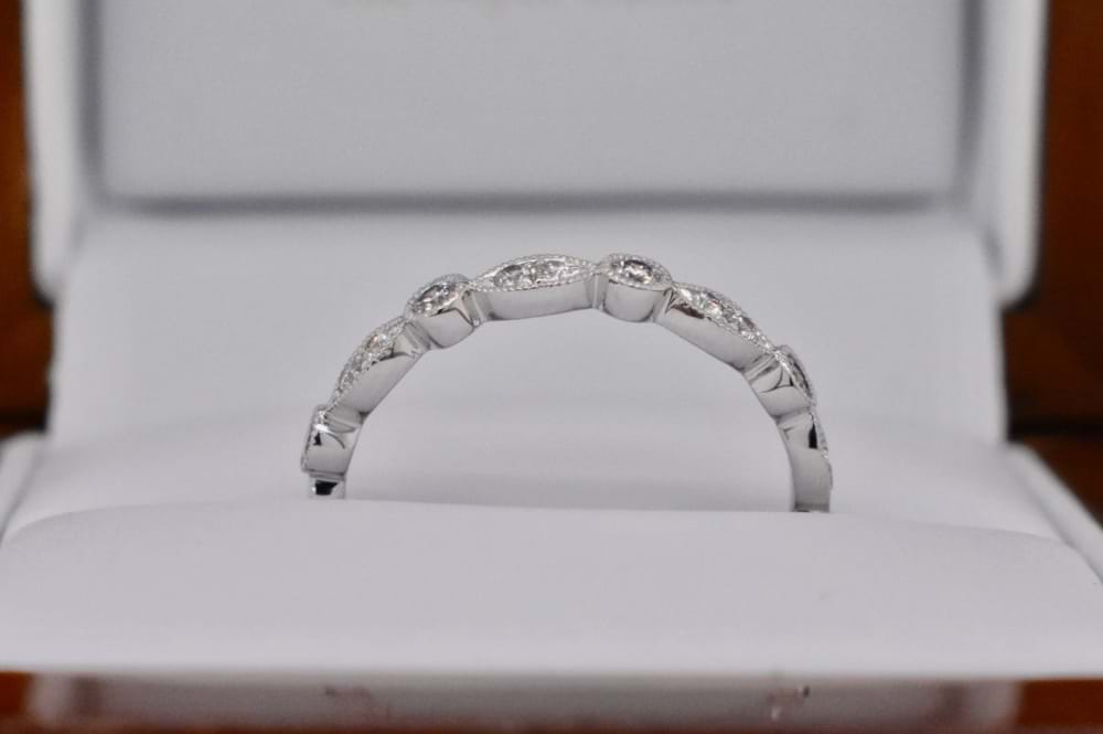 Made in 18ct white gold this Art Deco Style band contains 13 white, round brilliant cut diamonds set in an alternative marquise/round setting framed by a mill grain edge. Priced individually but available as a set. These make a stunning ring by themselves, as a set or as a part of any stackable ring collection. Independent Valuation Supplied
