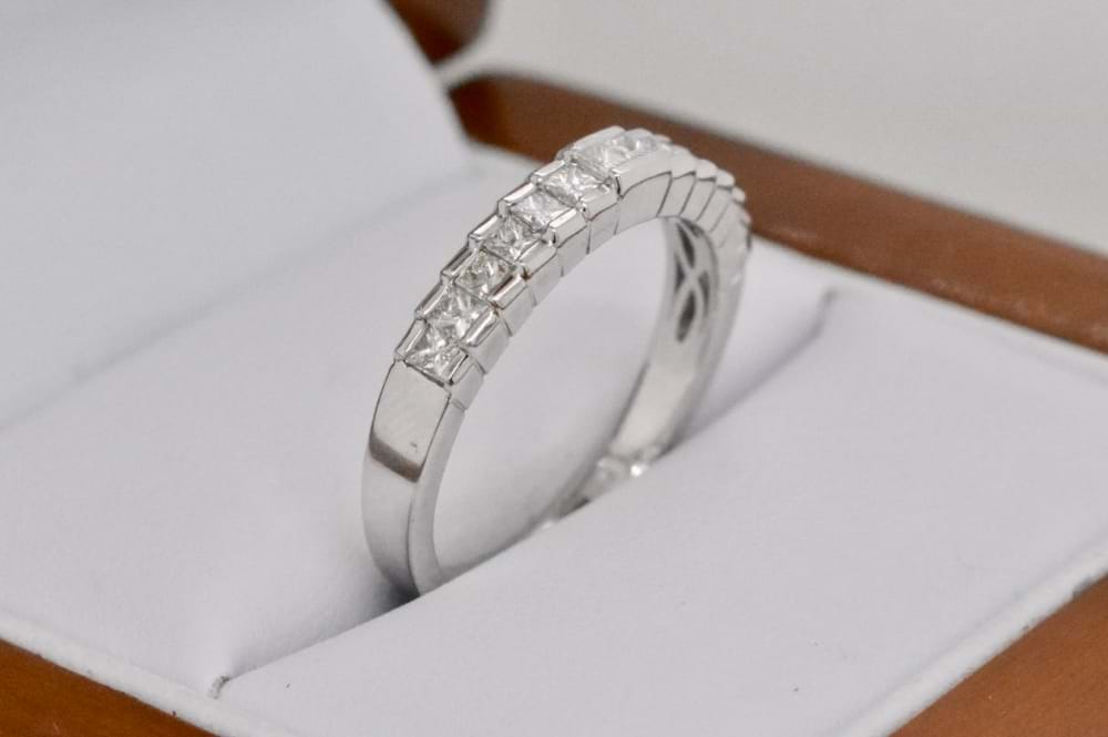 This unusual design diamond band features 14 glistening princess cut diamonds tapering in size from the centre. With the centre diamond set at the highest point and each side diamond set slightly lower, the step effect of this ring makes it ideal as a piece on its own or matched with an engagement ring. In 18ct white gold the diamond total is 0.53cts. Independent Valuation Supplied