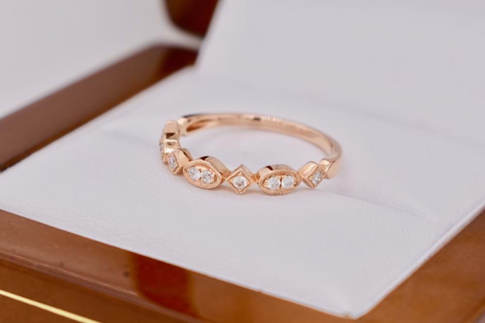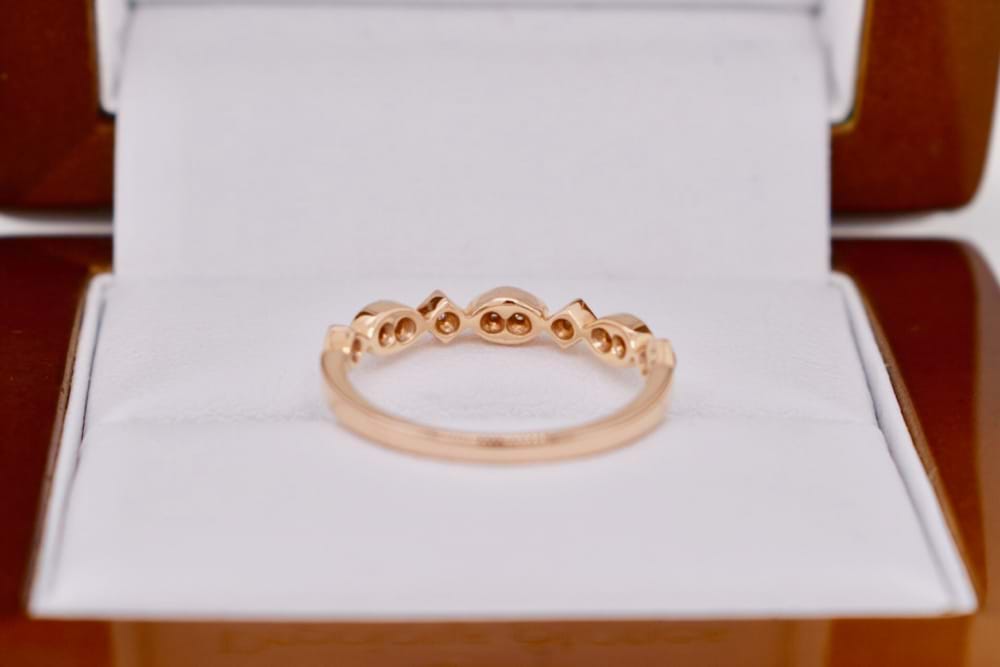 Pretty 18ct rose gold stacking band in an Art Deco inspired design featuring 10 round brilliant cut diamonds grain set into alternating oval and diamond shape bezels totaling 0.11cts (GH/SI). Ideal for a dress ring, worn as is or paired with other stackable bands
