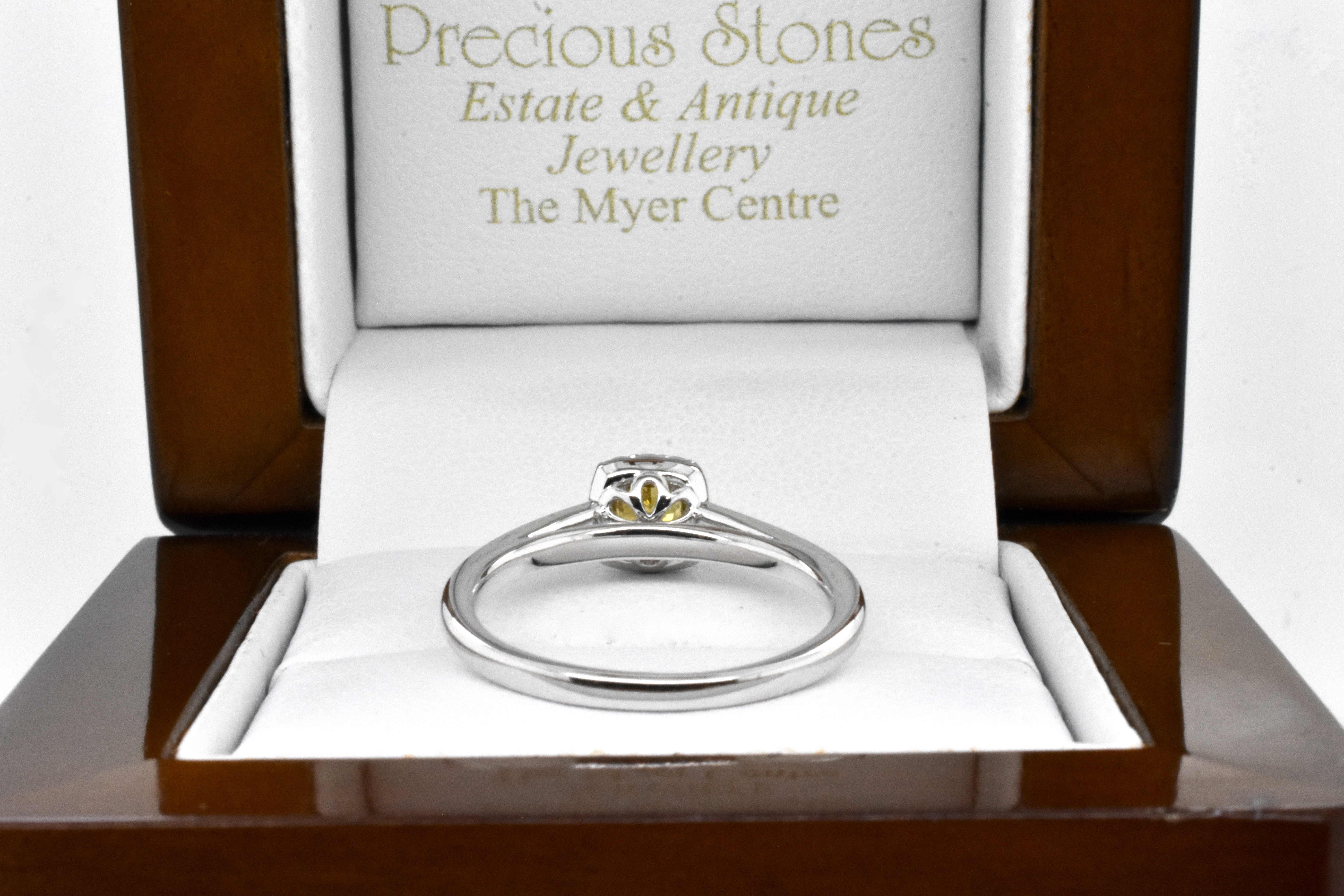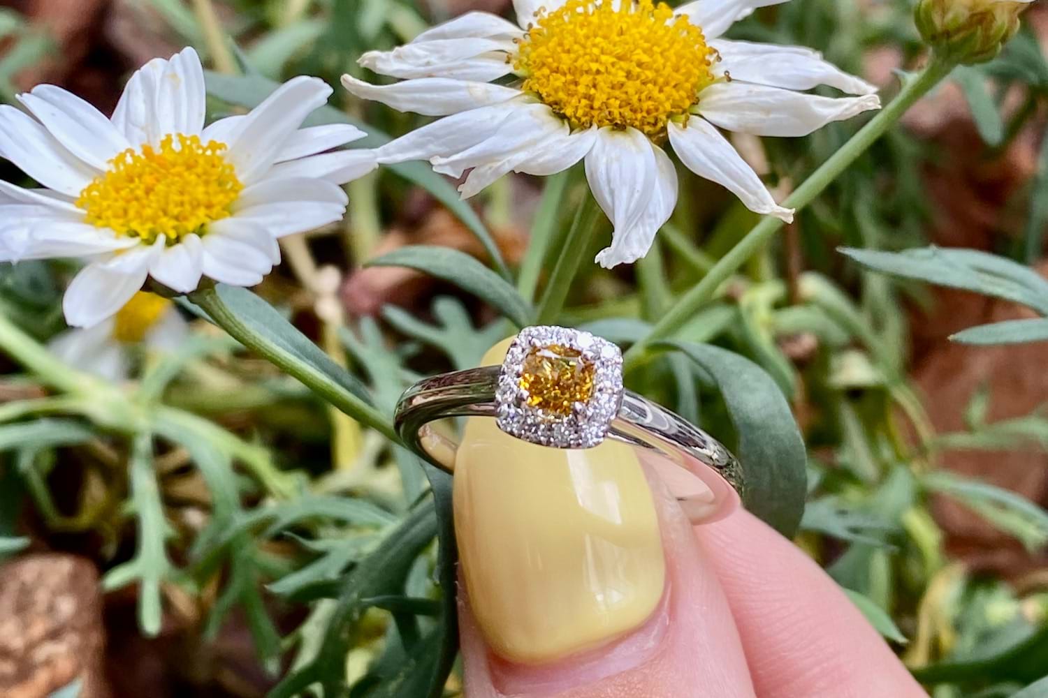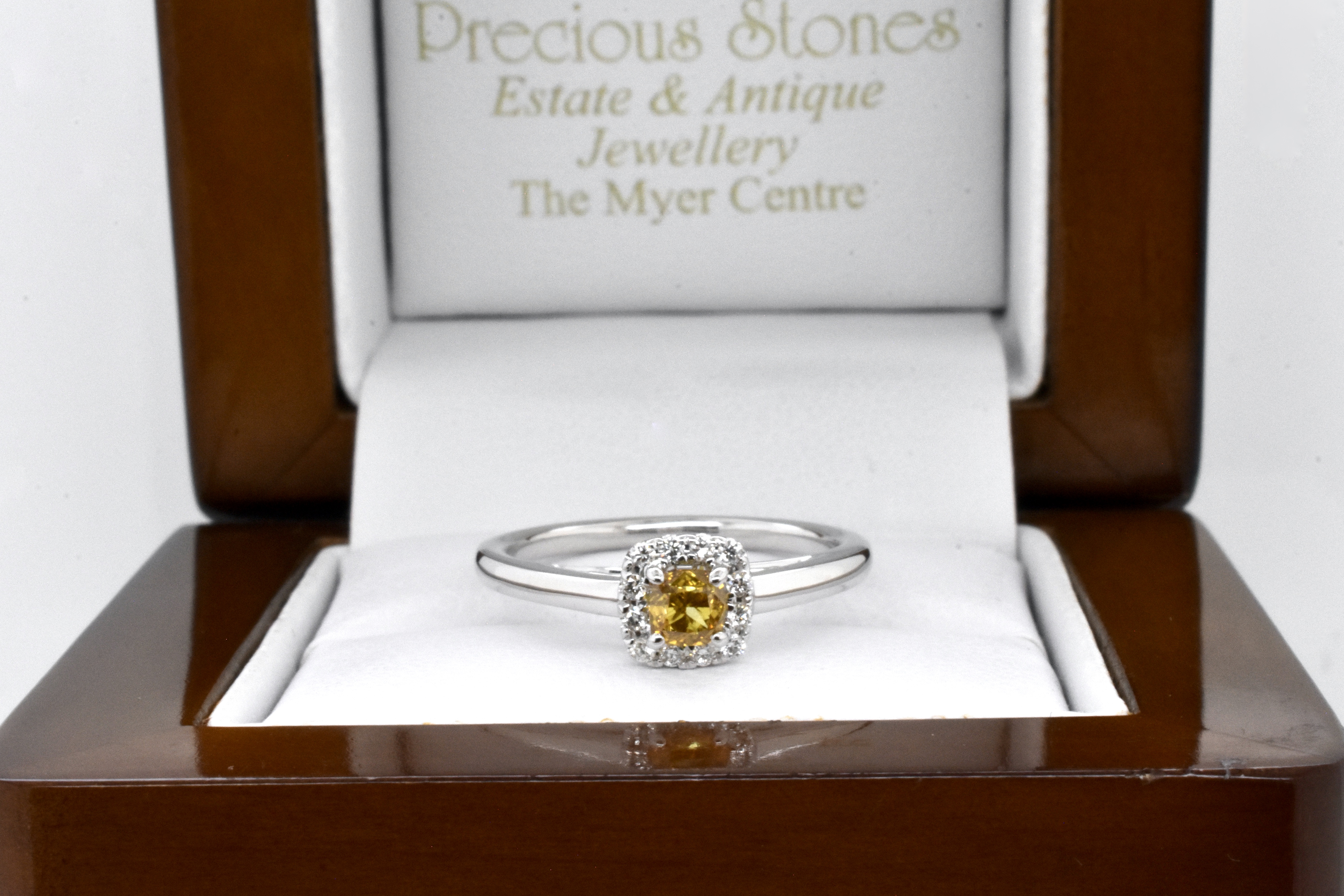 A stunning, fancy deep yellow natural diamond is the centre of this simple and dainty ring, 0.34ct round in 4 claws with a halo of 12 equalling 0.12ct sparkling, white FG/VS-SI diamonds, all set in 18ct white gold with a plain slightly tapered band. Finger size M+. This ring has been designed to be worn by itself and also sit flush with other bands