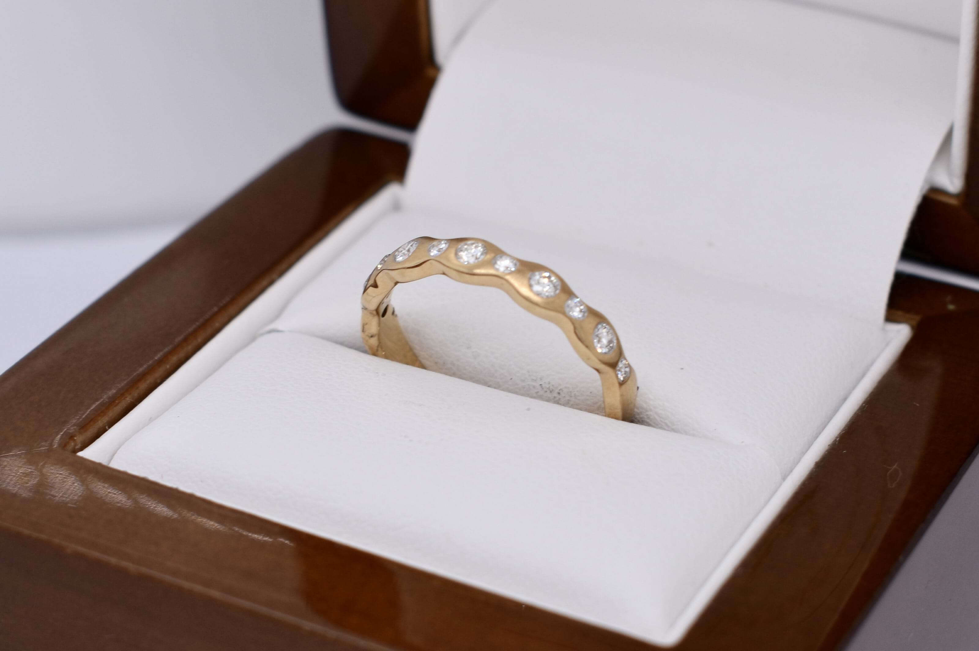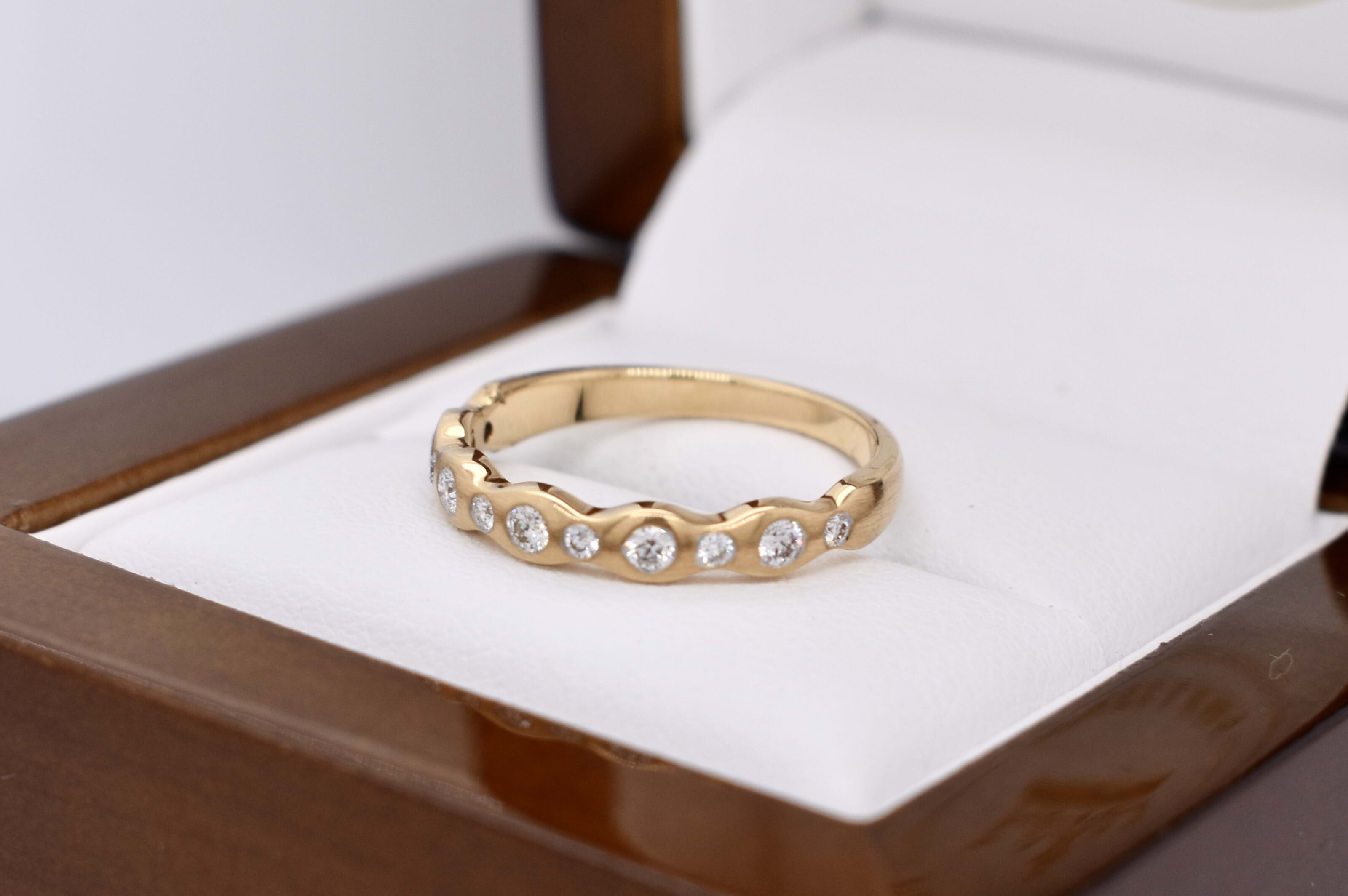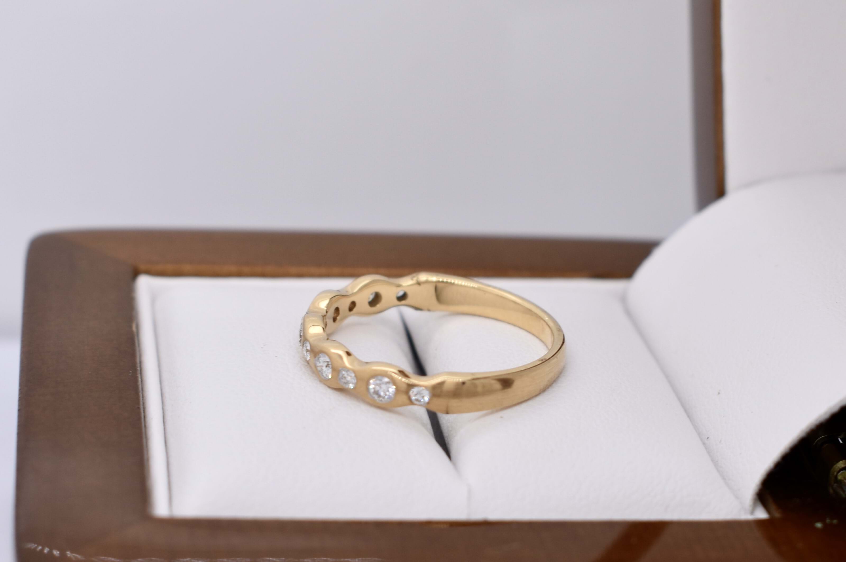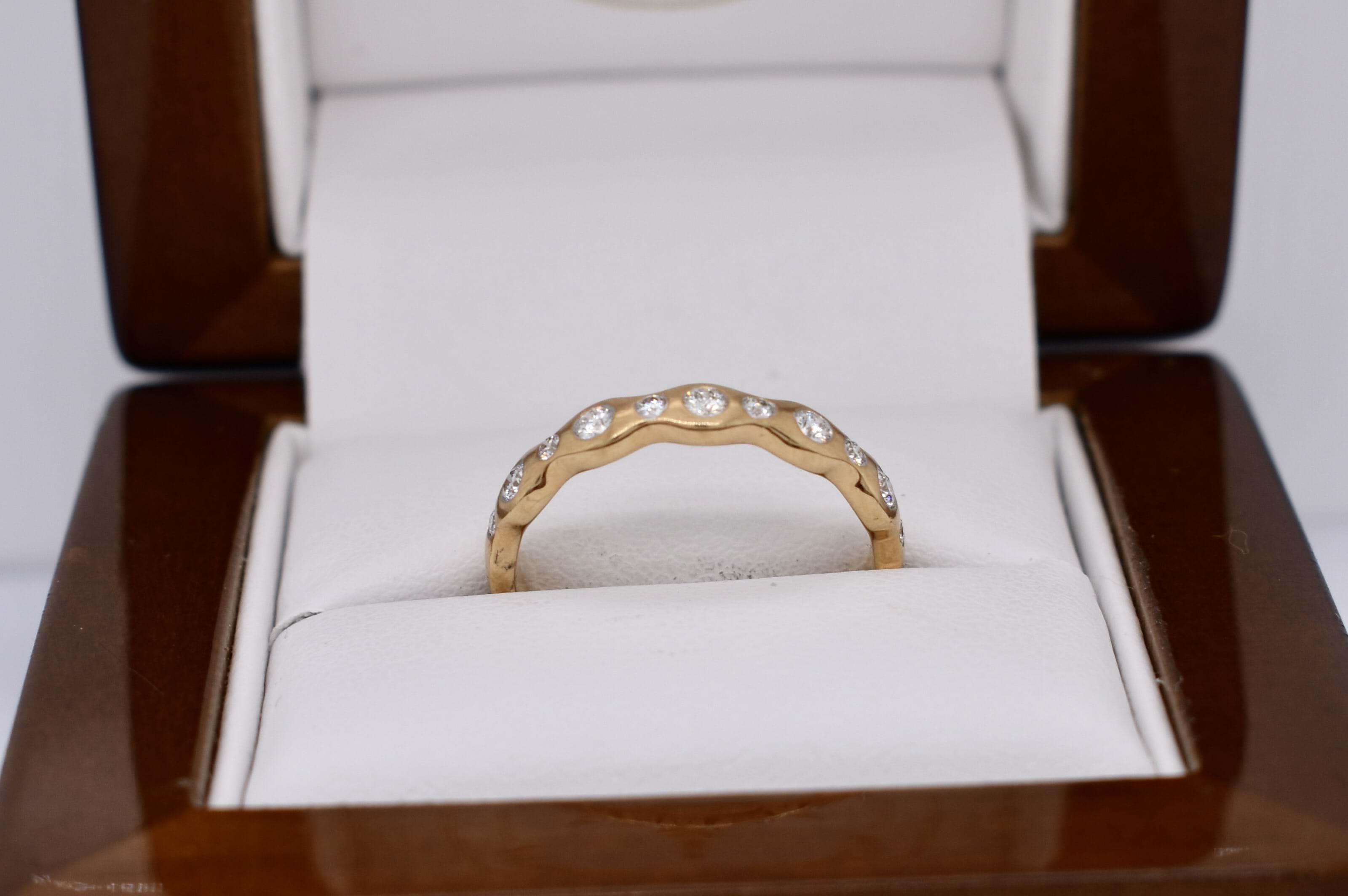 This pretty 18ct yellow gold band features a total of 11 round brilliant cut diamonds pressure set into a wave design band, with brushed finish. Total diamond content equals 0.21ct G SI. Finger size M. Independent Valuation available upon purchase.
