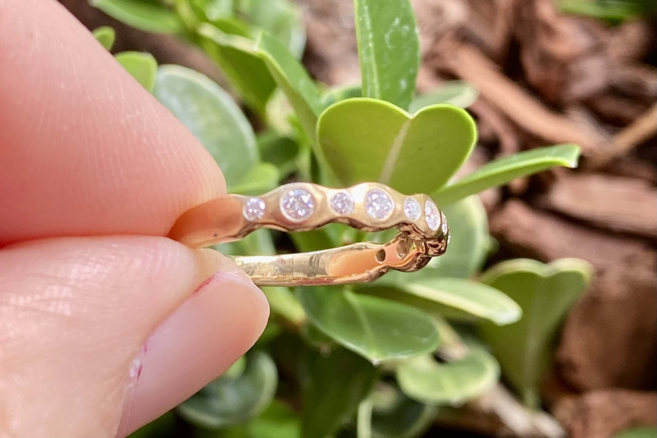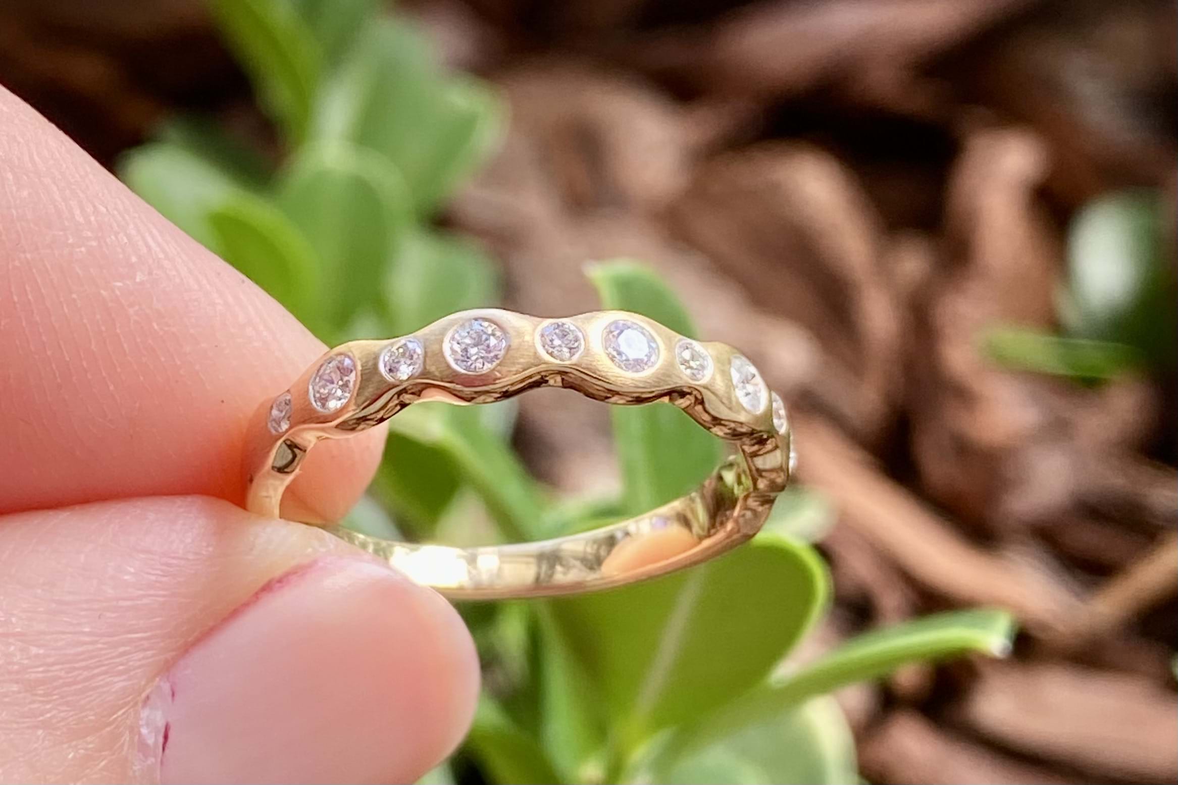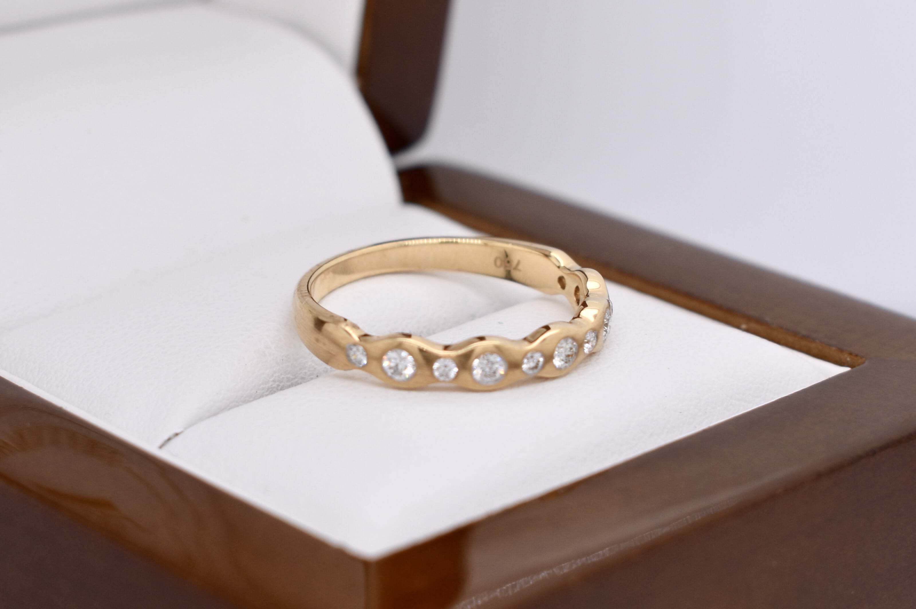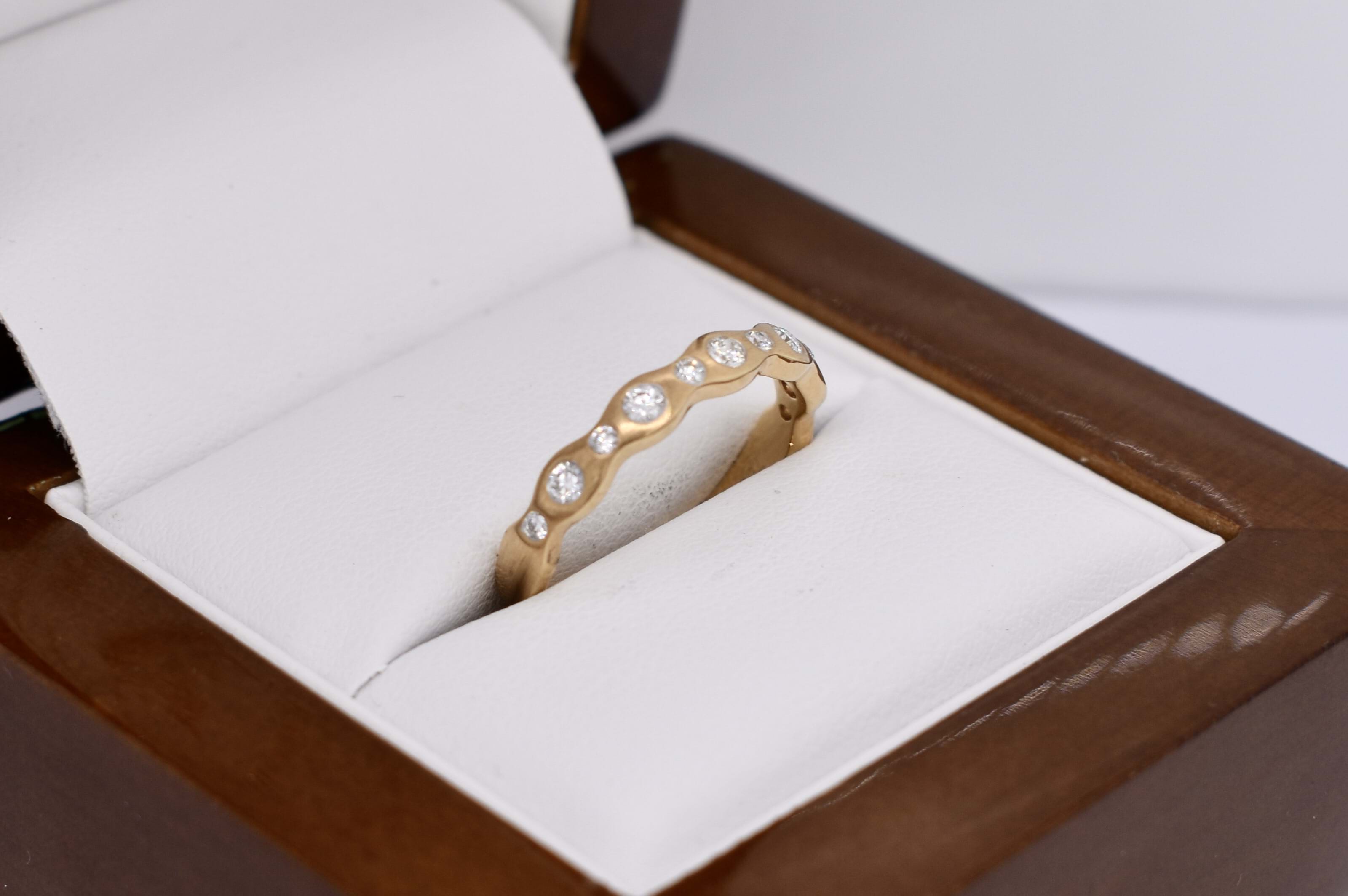 This pretty 18ct yellow gold band features a total of 11 round brilliant cut diamonds pressure set into a wave design band, with brushed finish. Total diamond content equals 0.21ct G SI. Finger size M. Independent Valuation available upon purchase.