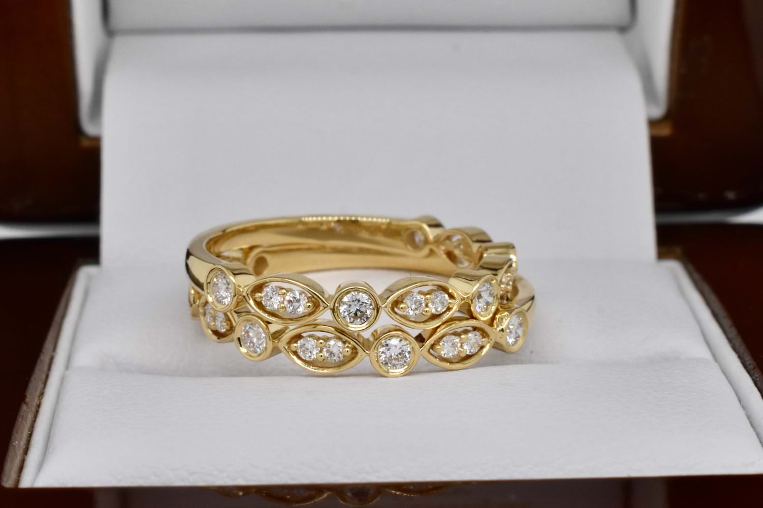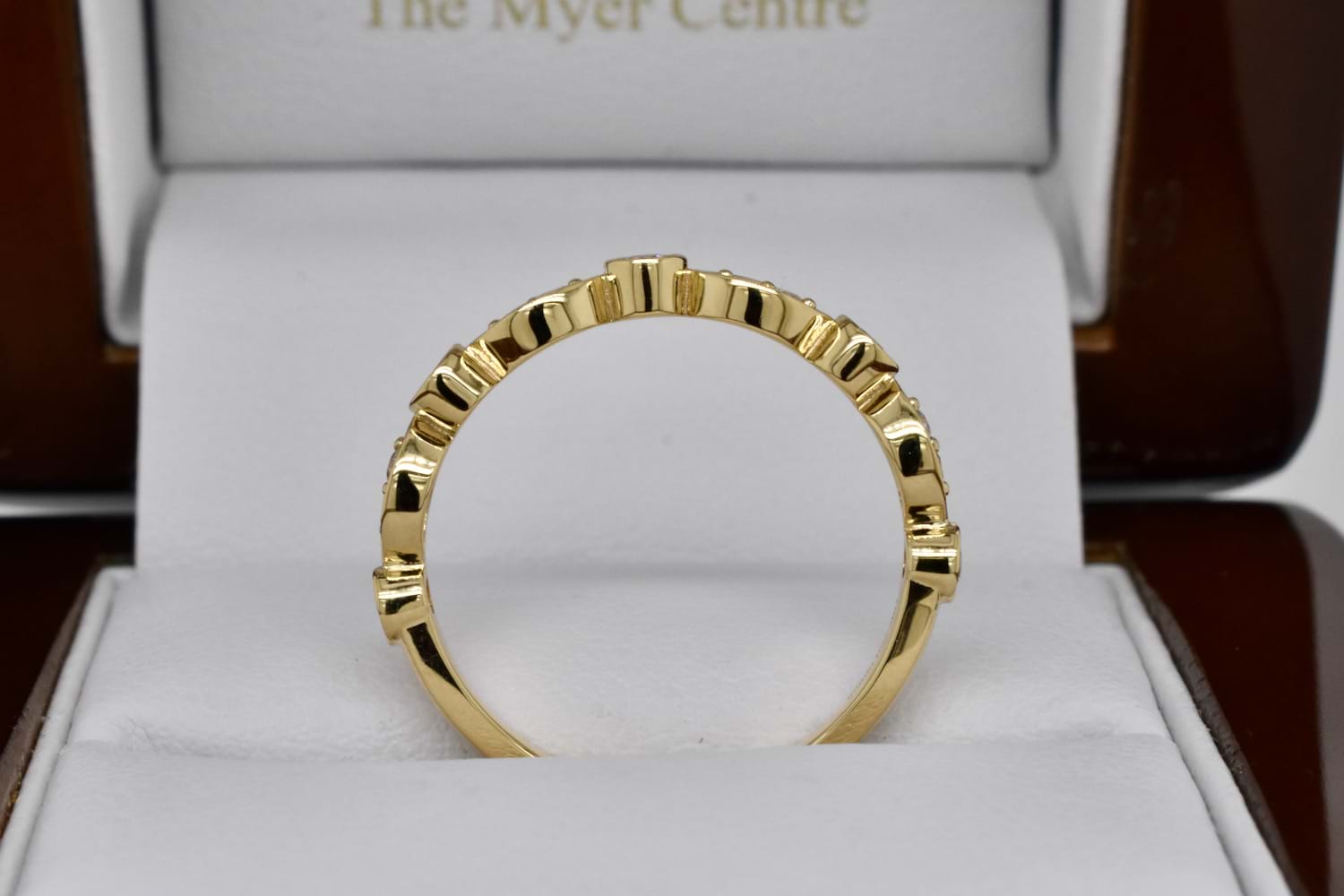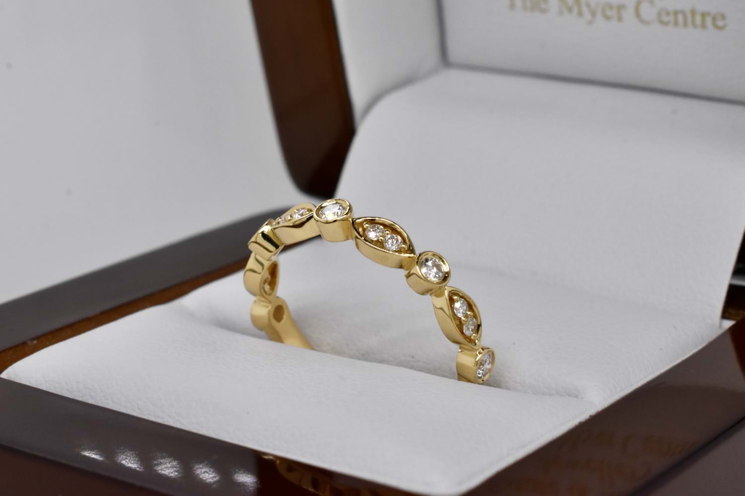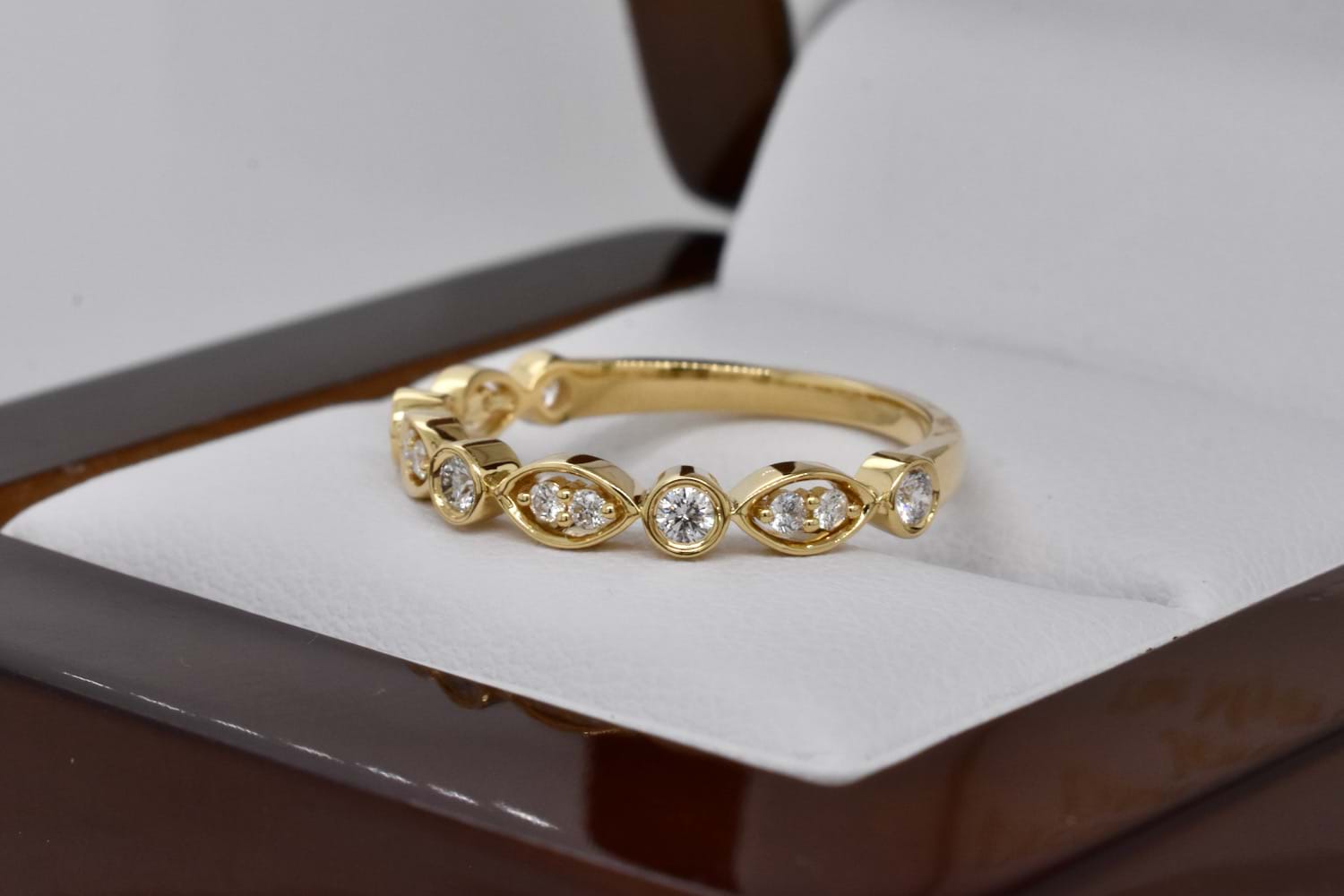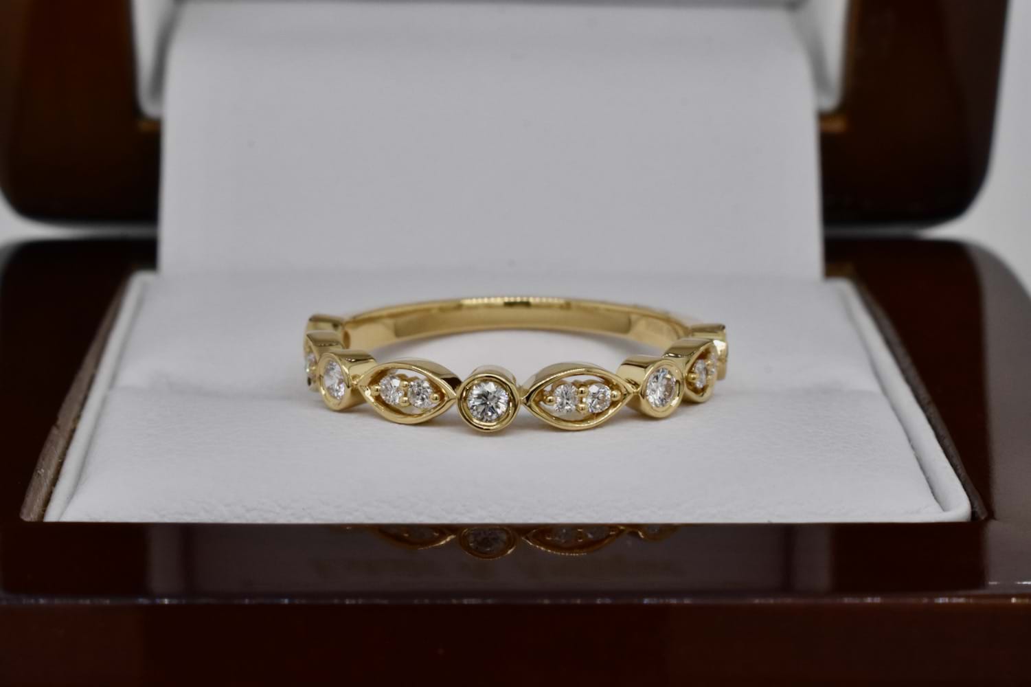 A pretty and feminine band crafted in 18ct yellow gold with shimmering round brilliant cut diamonds set into alternating round and marquise shape bezels to give an Art Deco inspired look. The band contains 13 diamonds equalling 0.25cts (GH/SI) and makes a stunning wedding, eternity or stacking ring. Finger size N. Independent Valuation Supplied