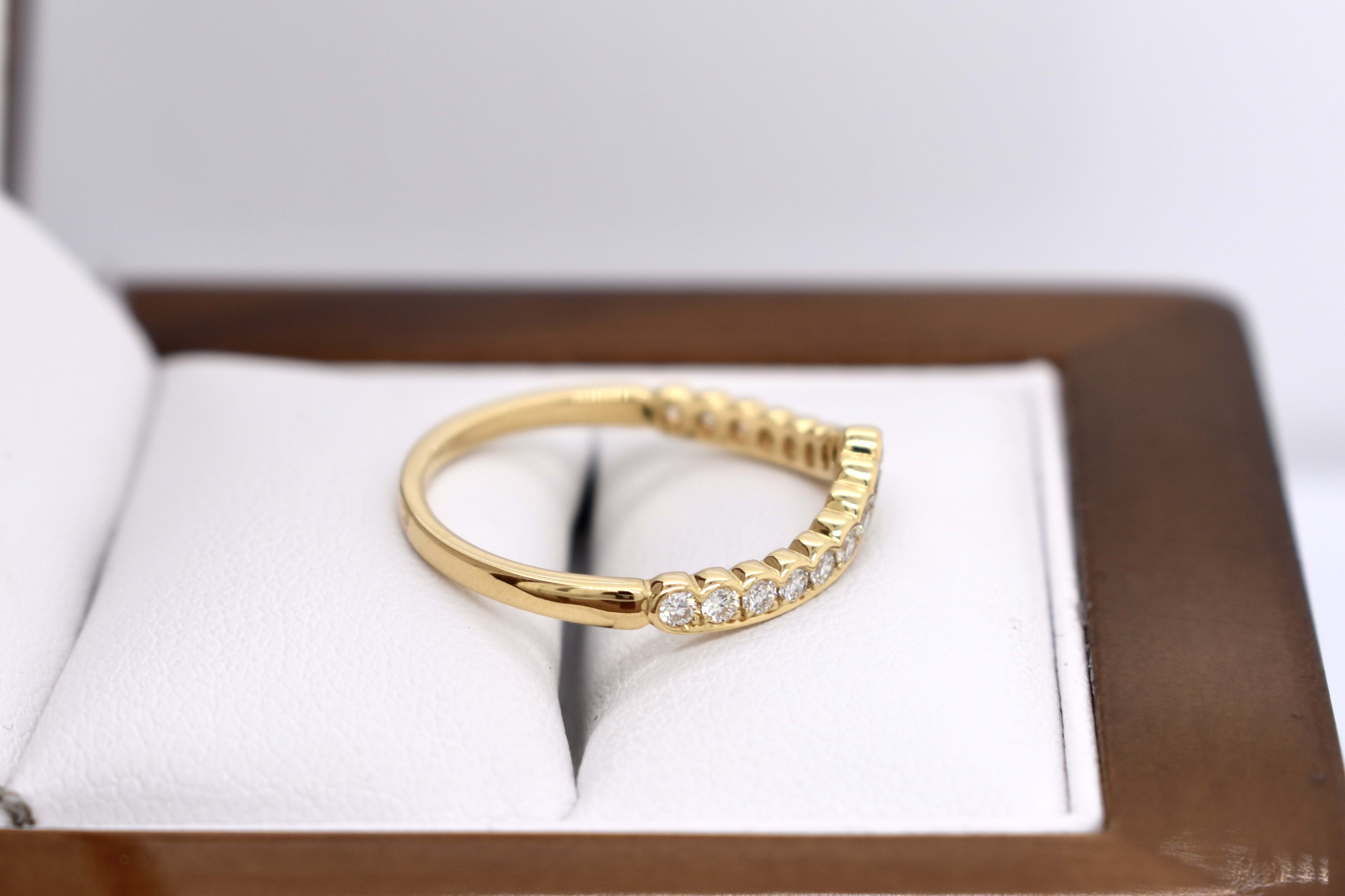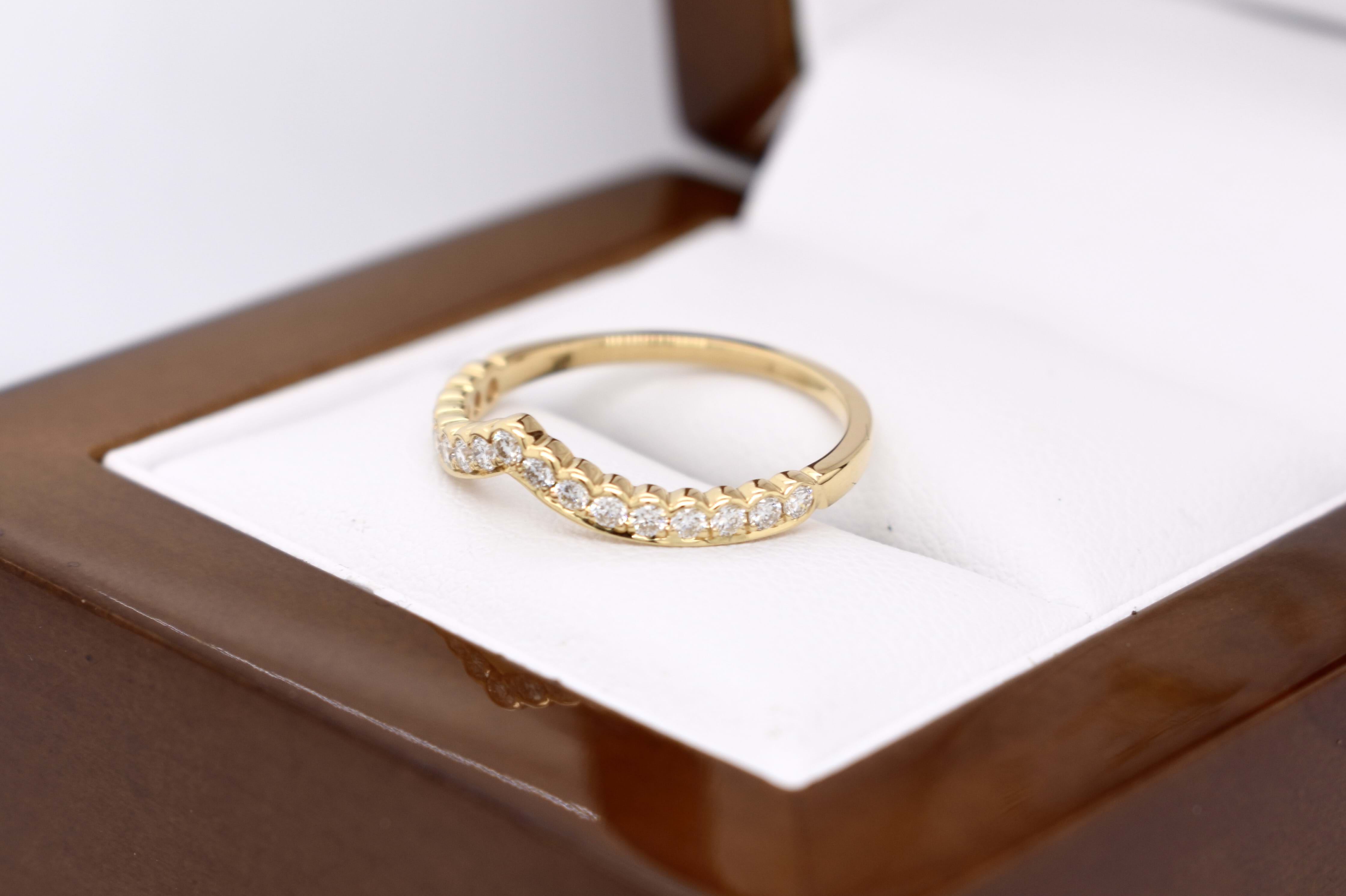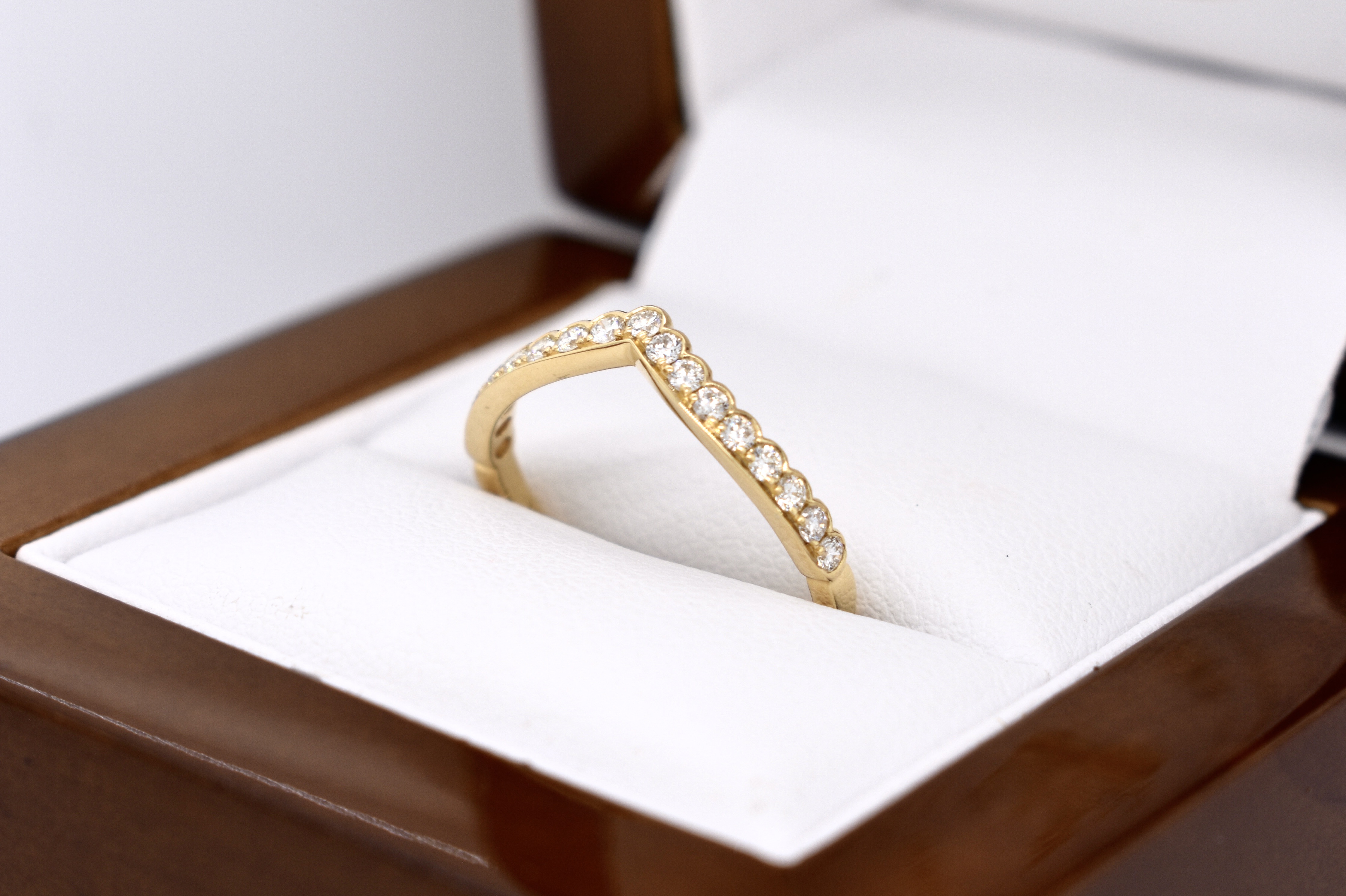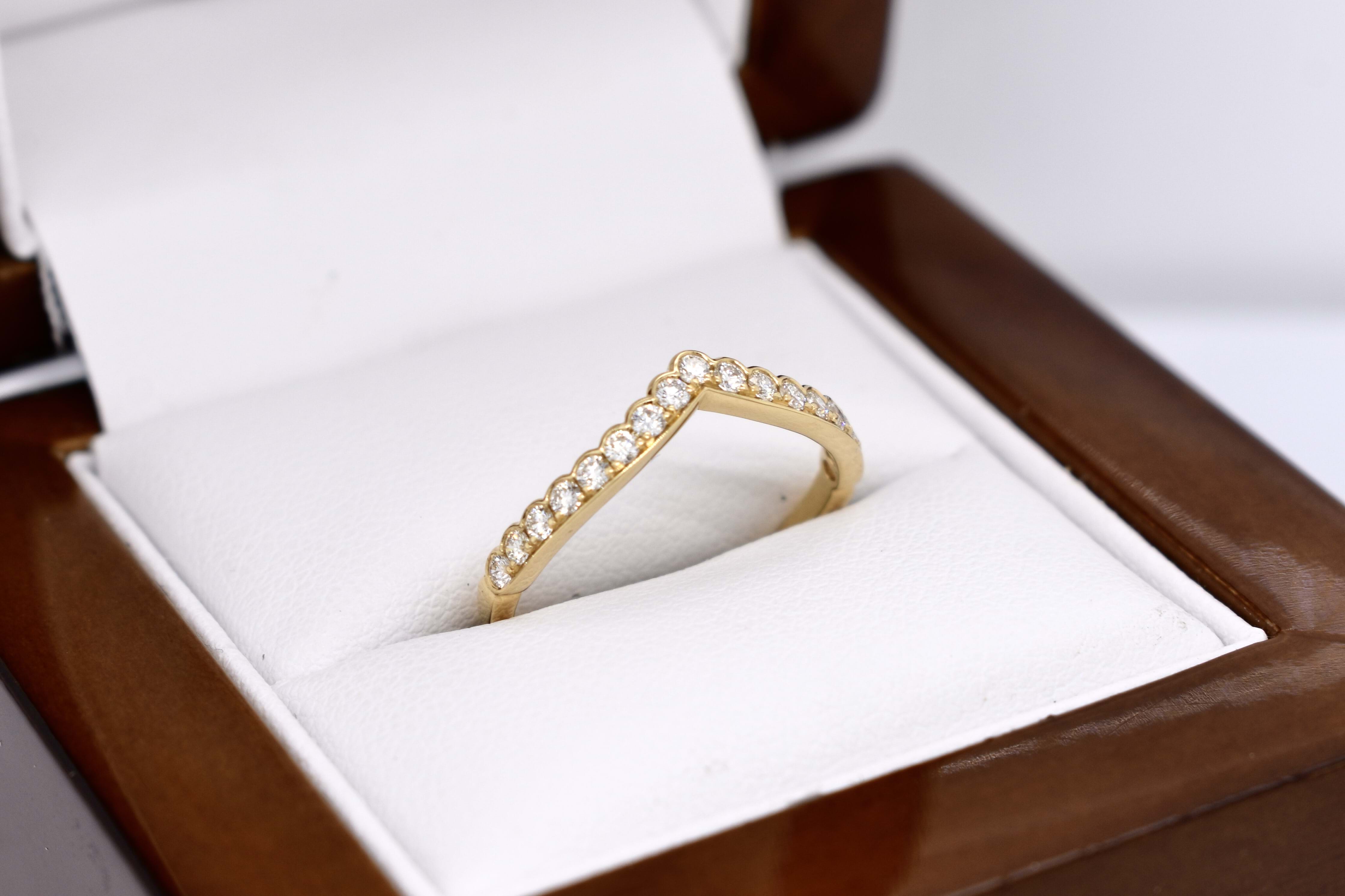 This shimmering v-shaped band is crafted in 18ct yellow gold and features 17 round brilliant cut diamonds, scalloped edge grain set, measuring from 1.70mm round and totalling 0.29ct FG VS-SI. The gorgeous diamonds are set in a 'V' shape on a 1.37mm band. Finger size M. Independent Valuation Supplied.