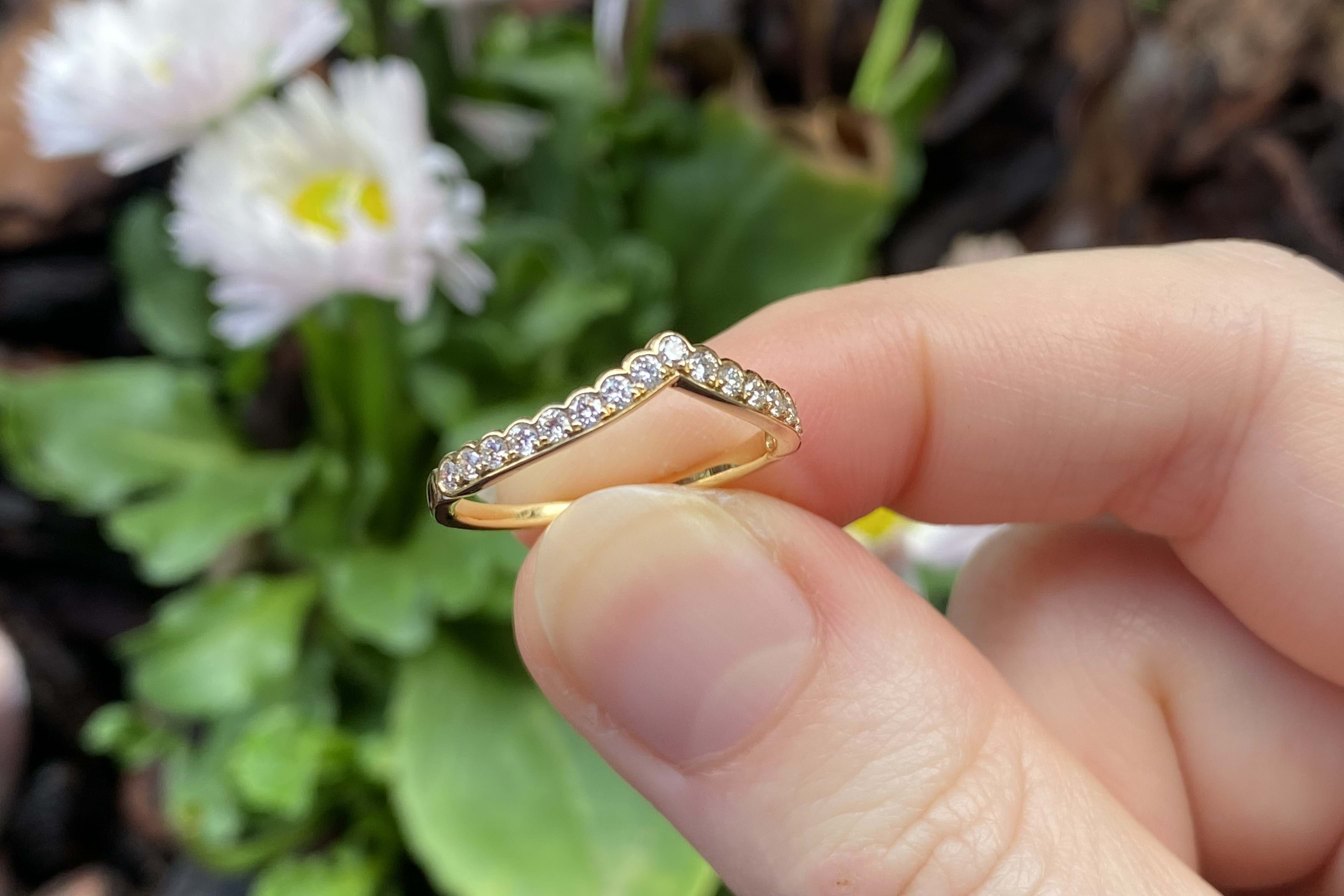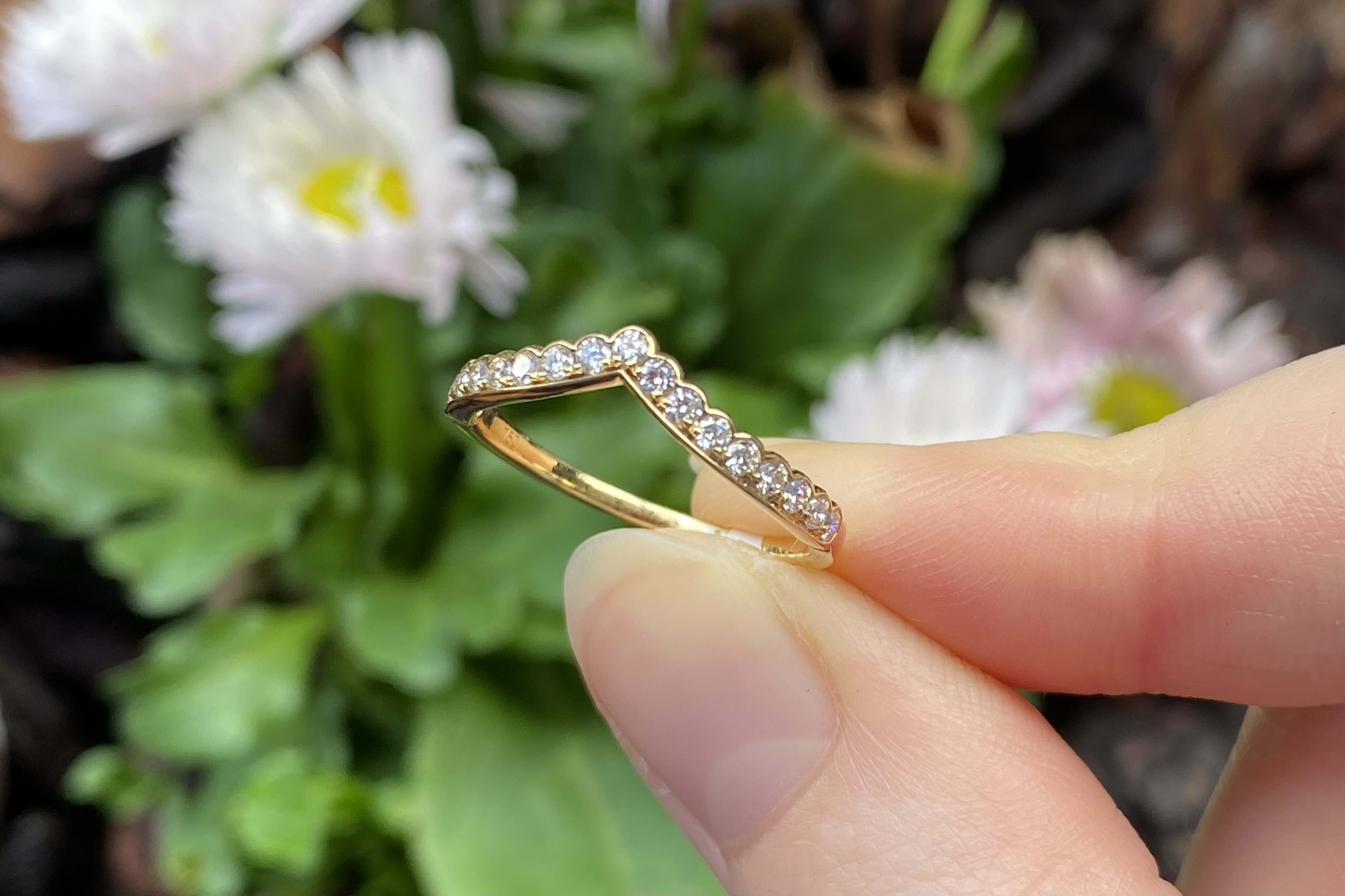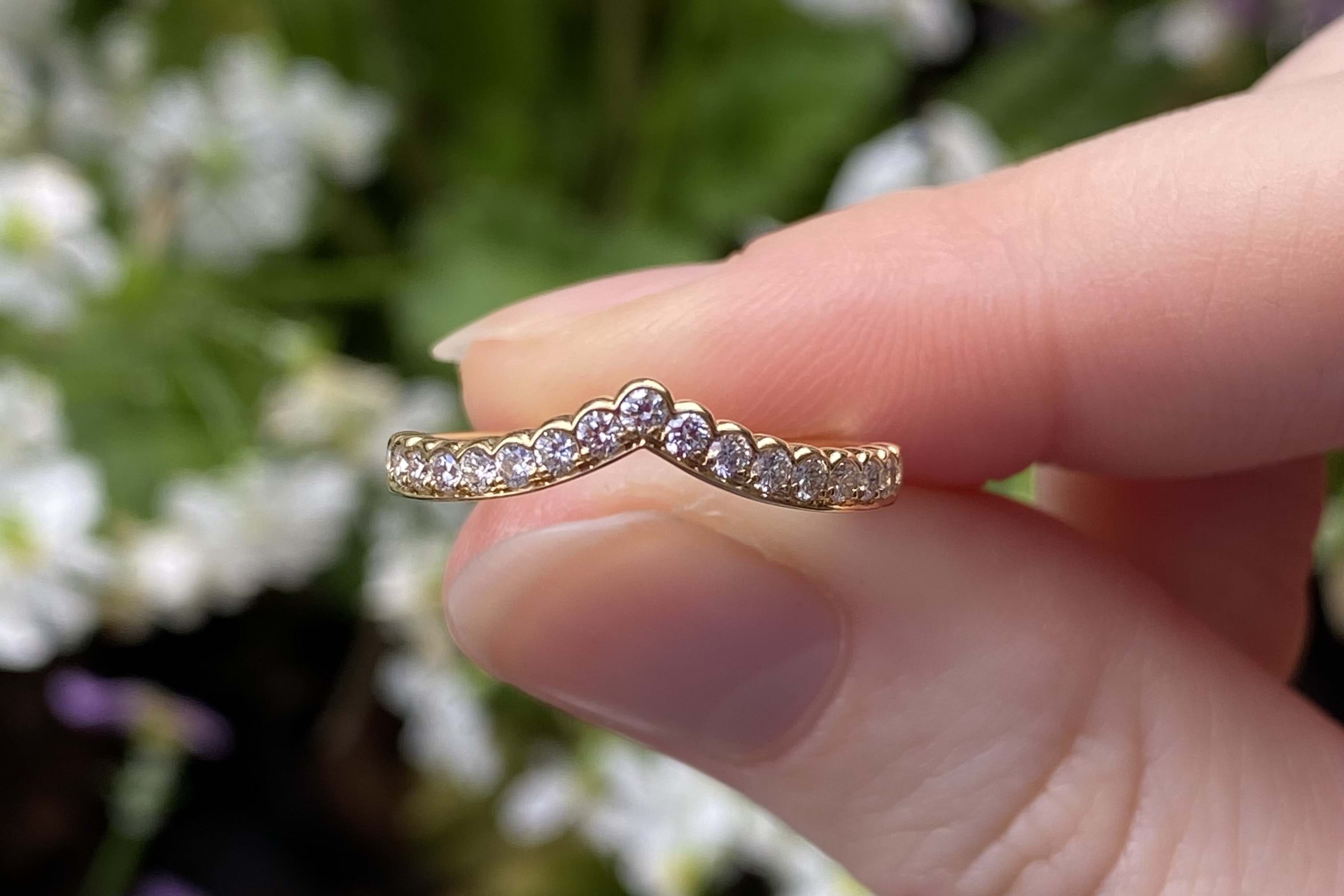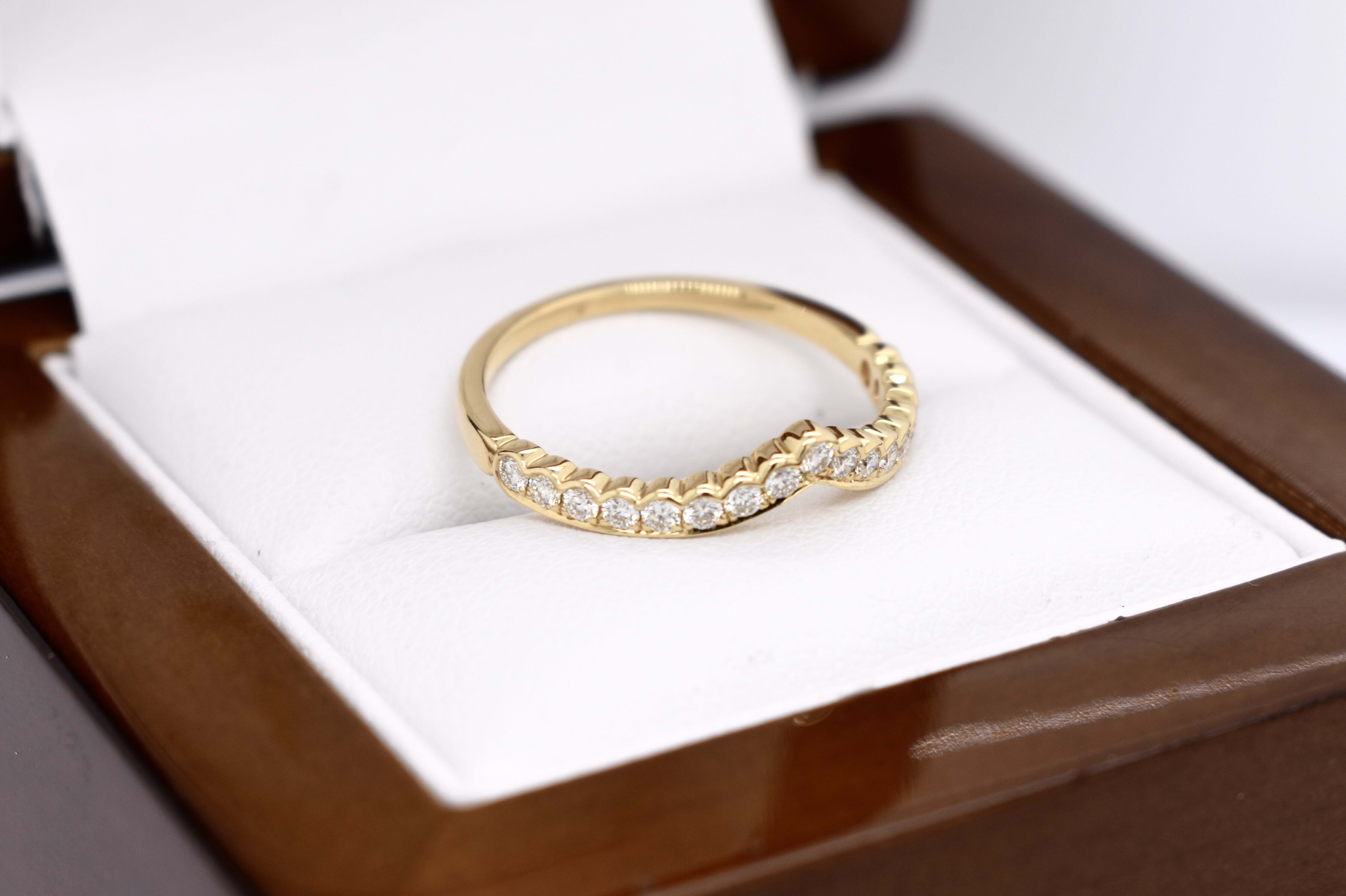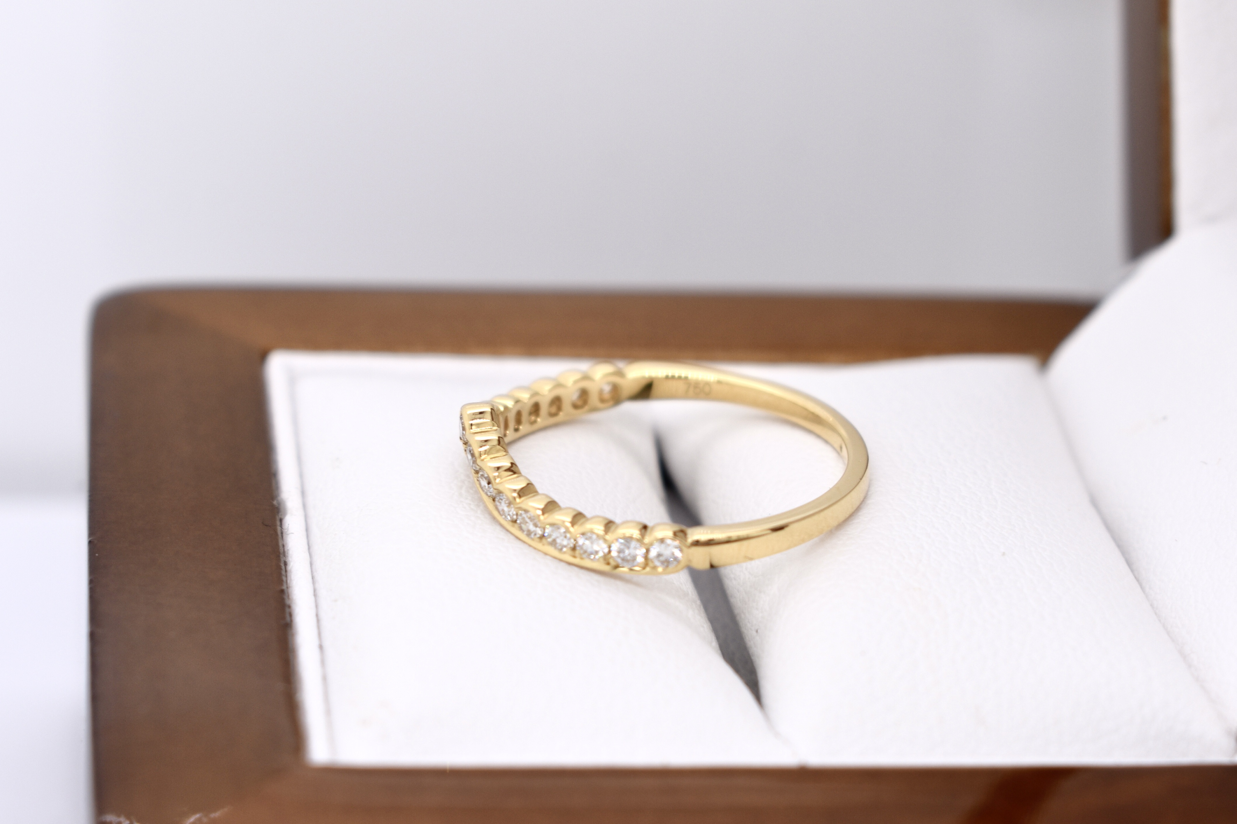 This shimmering v-shaped band is crafted in 18ct yellow gold and features 17 round brilliant cut diamonds, scalloped edge grain set, measuring from 1.70mm round and totalling 0.29ct FG VS-SI. The gorgeous diamonds are set in a 'V' shape on a 1.37mm band. Finger size M. Independent Valuation Supplied.