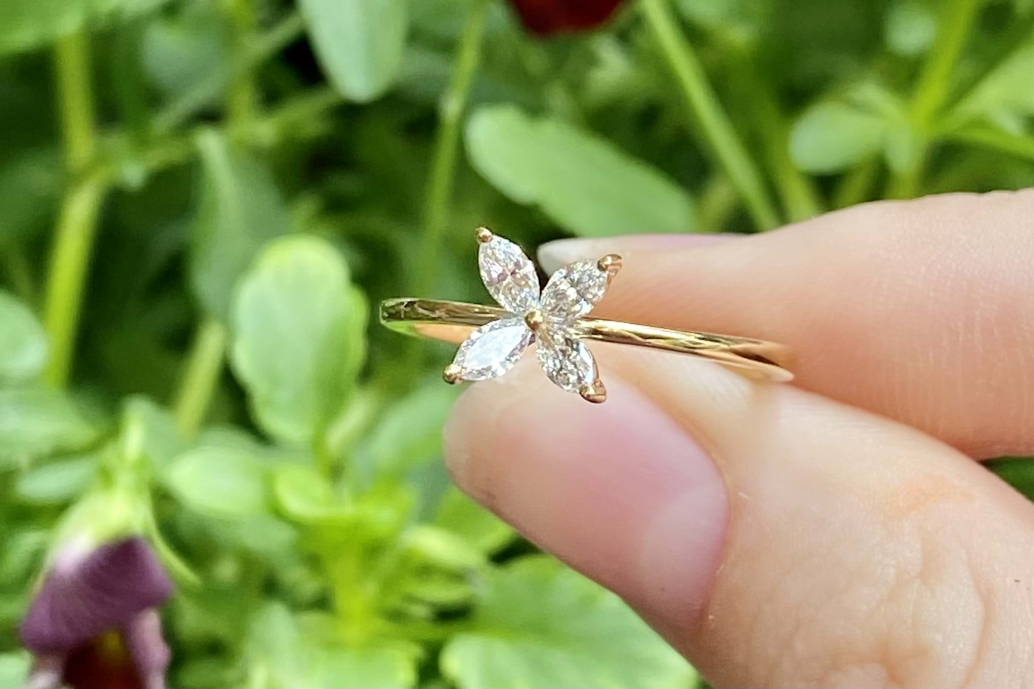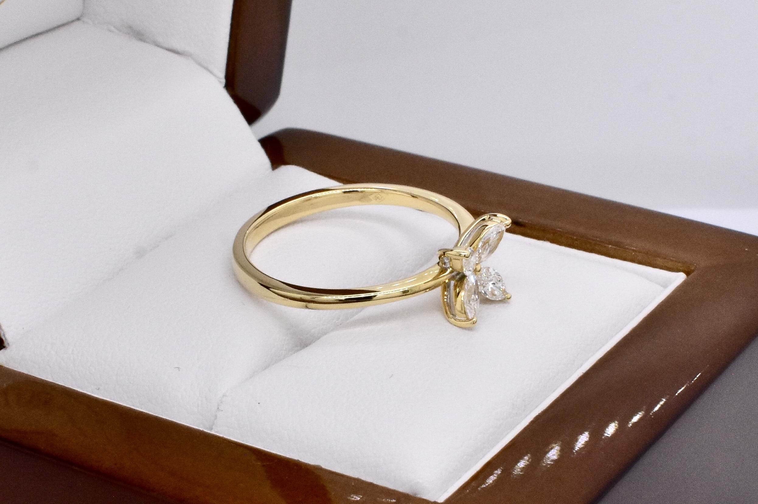 Simple and cute, this 18ct yellow gold four stone ring features four marquise cut 4.00x2.05mm diamonds set in a diagonal square 'butterfly' design. Set with an end claws and a centre bead, with a total weight of 0.34ct FG VS-SI. Finished on a half round 1.95mm band. Finger size M+. Independent Valuation Supplied.