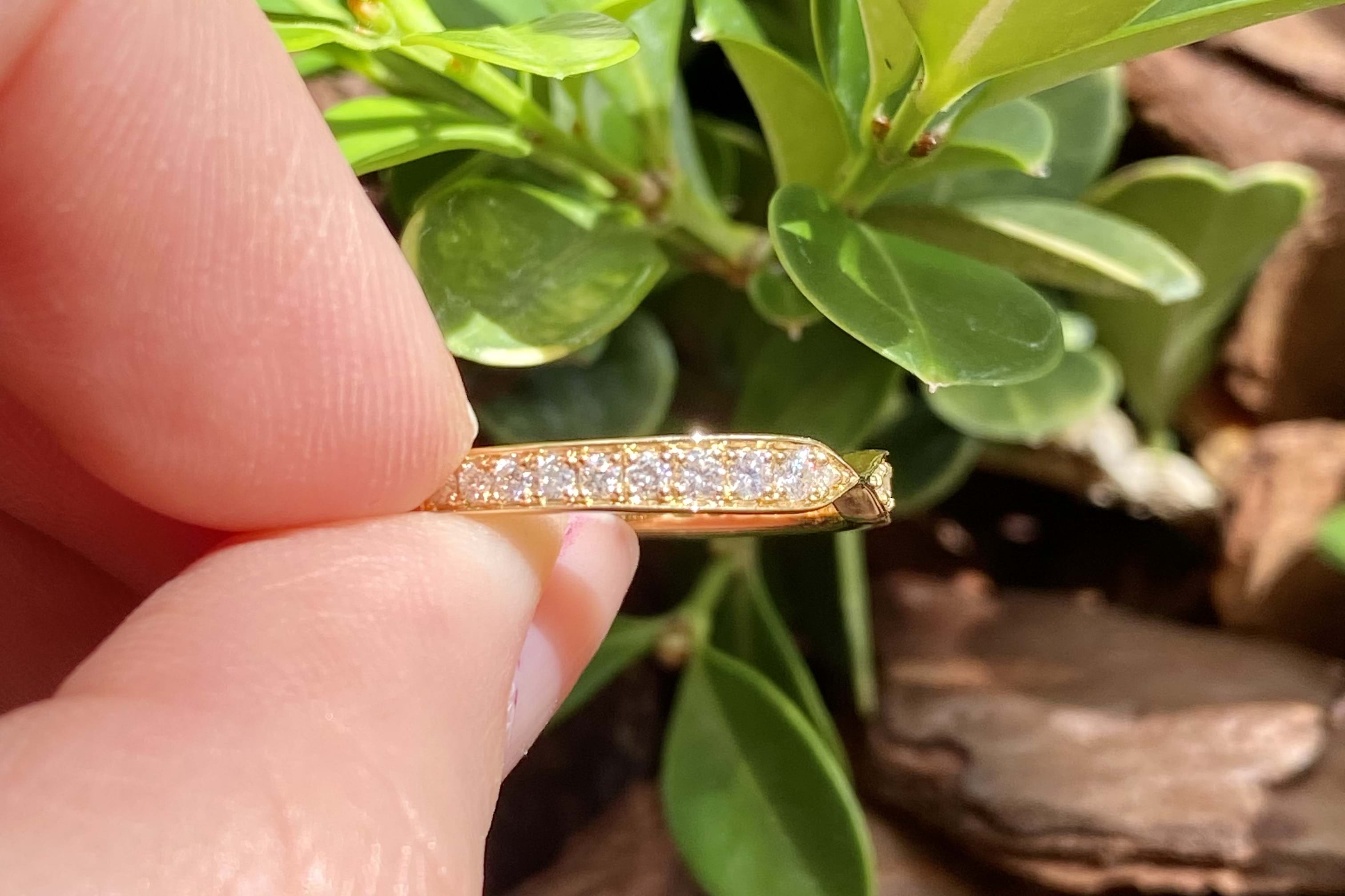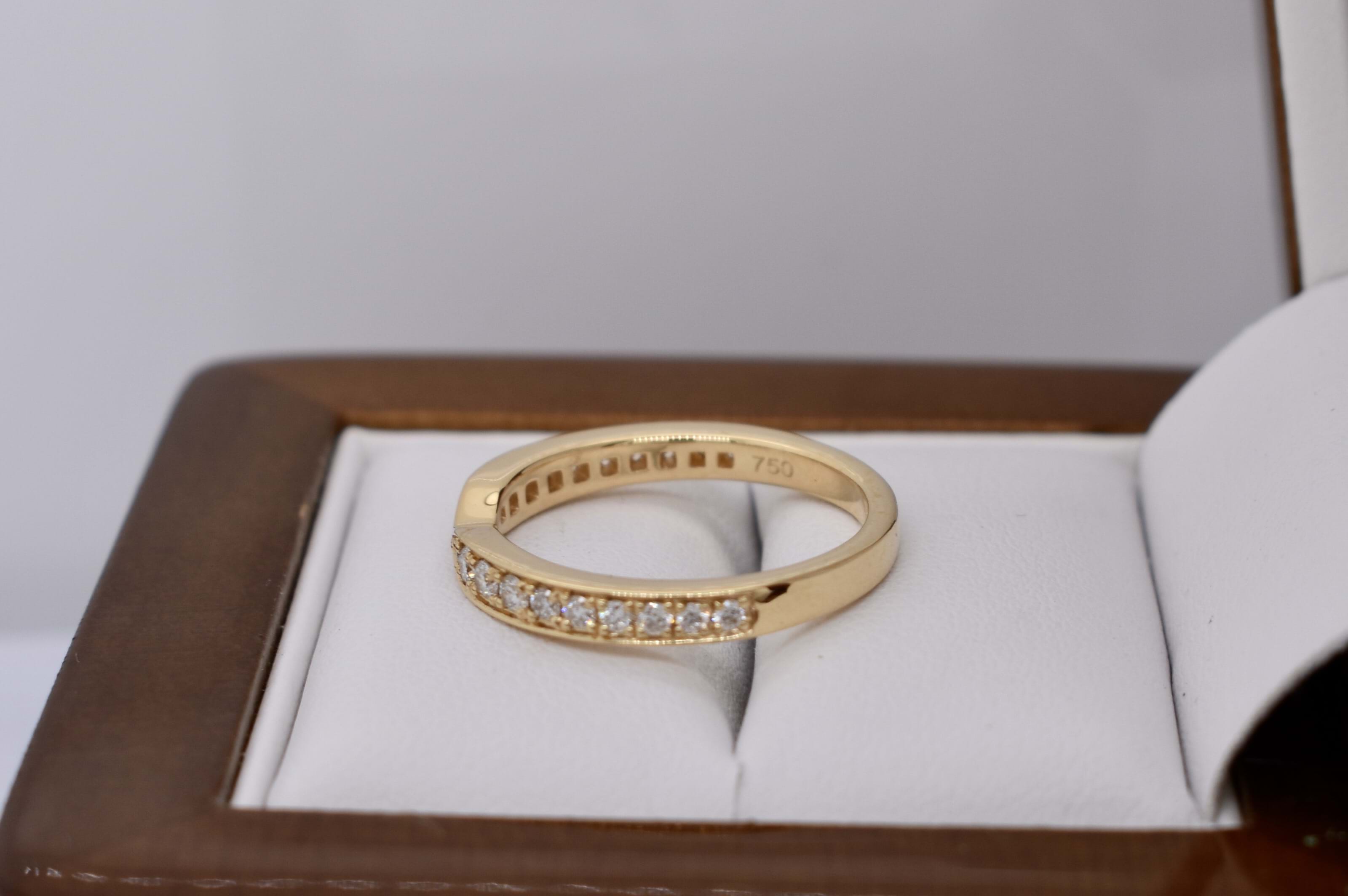 This cute 18ct yellow gold band features a total of 20 round brilliant cut diamonds, equalling 0.35t G SI1, grain set with a bow design at the front centre. Diamonds are set half way around the band. Finger size M+. Independent Valuation available upon purchase.