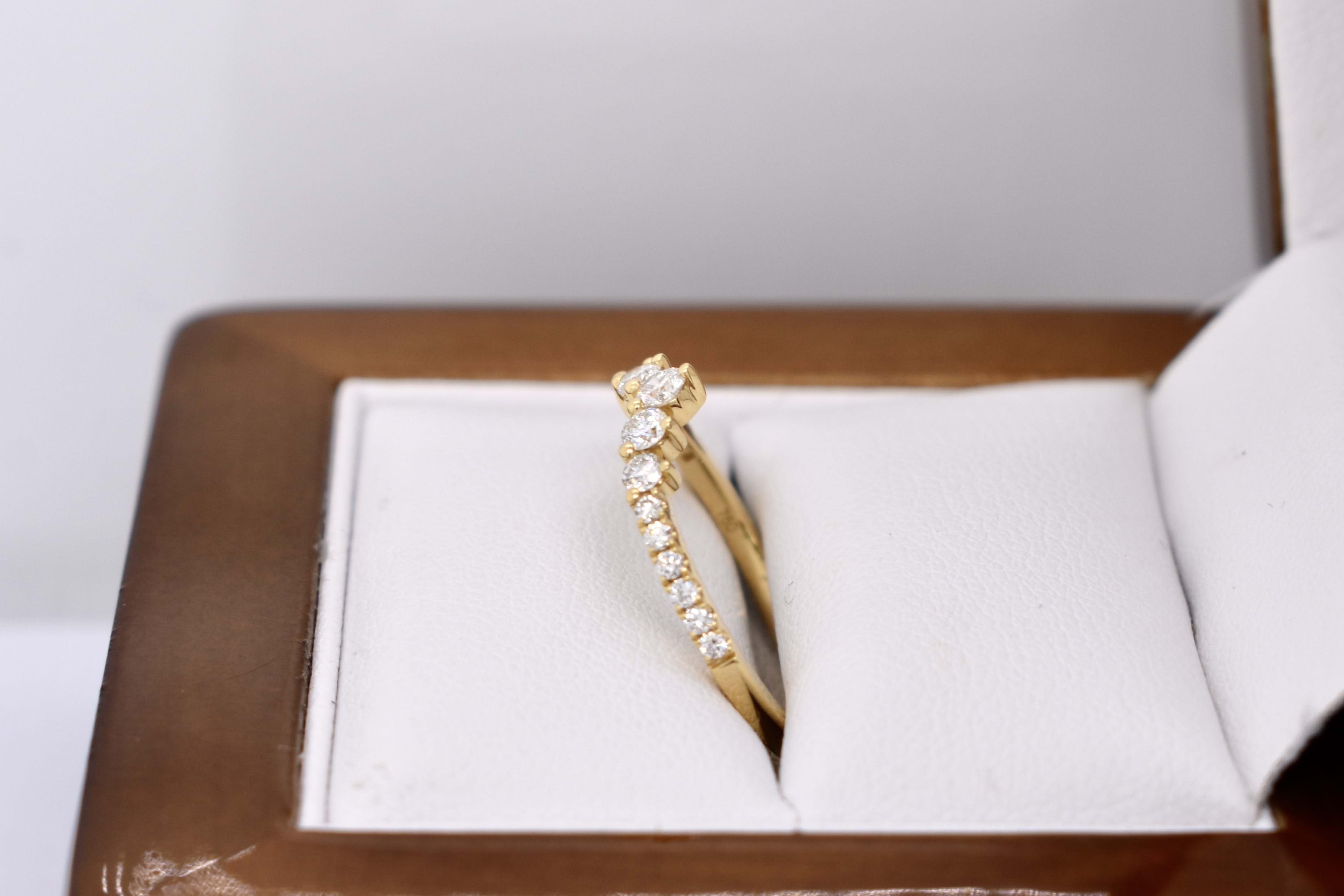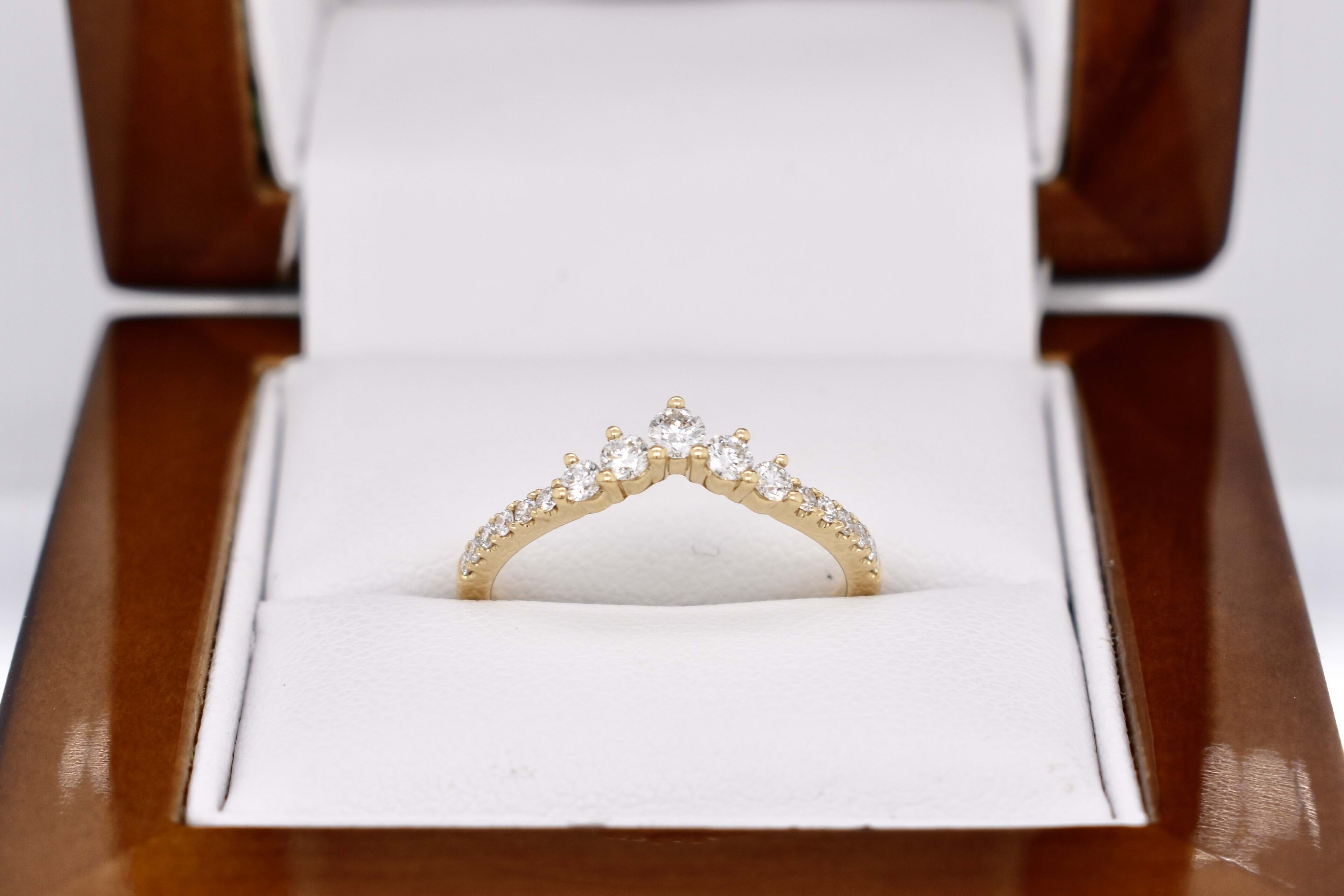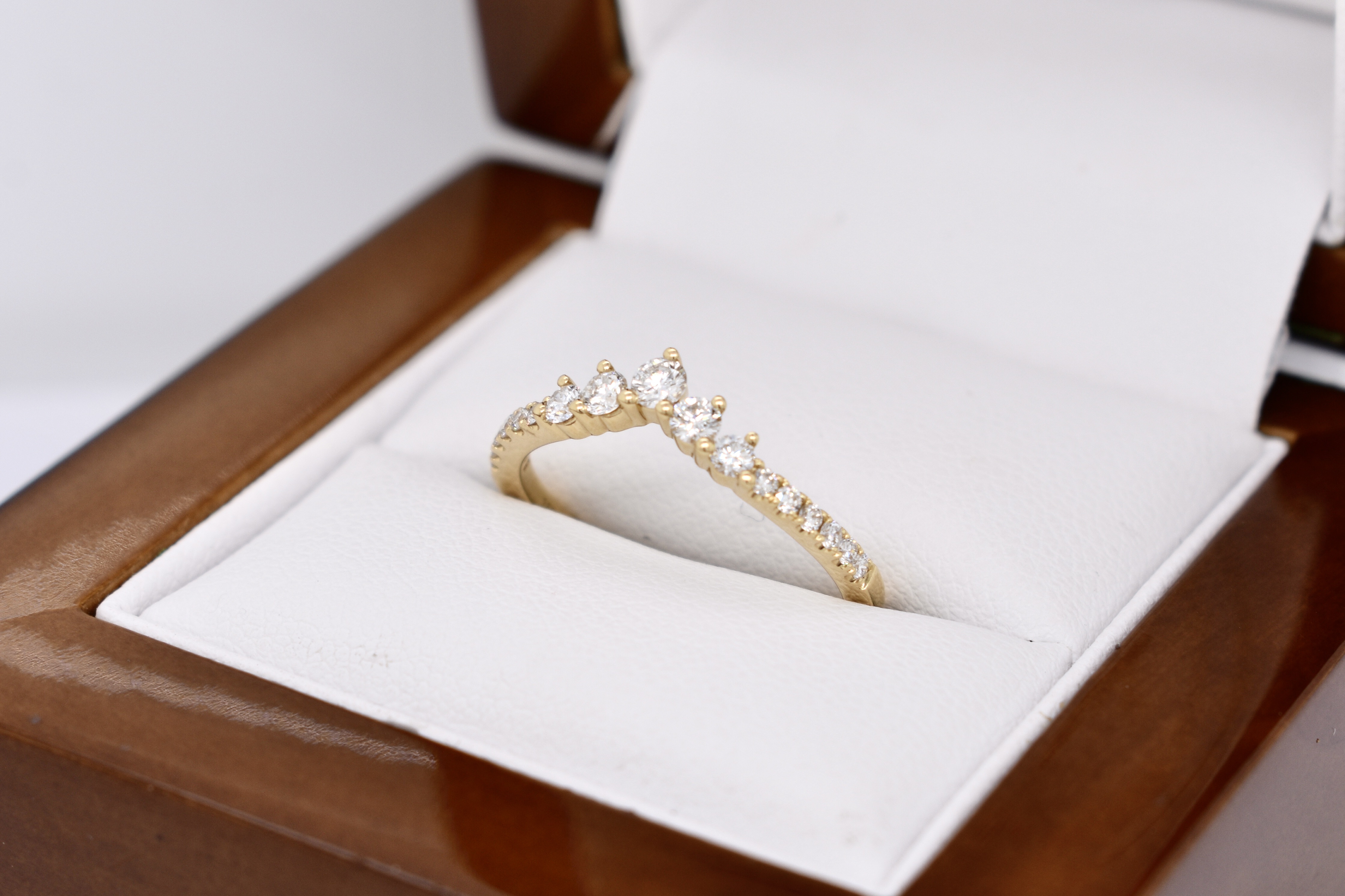 This stunning v-shaped band is crafted in 18ct yellow gold and features 17 round brilliant cut diamonds, shared claw set, measuring from 2.60-1.40mm and totalling 0.38ct FG VS-SI. The dazzling diamonds are set in a slight curved shape on a 1.38mm band. Finger size M. Independent Valuation Supplied.