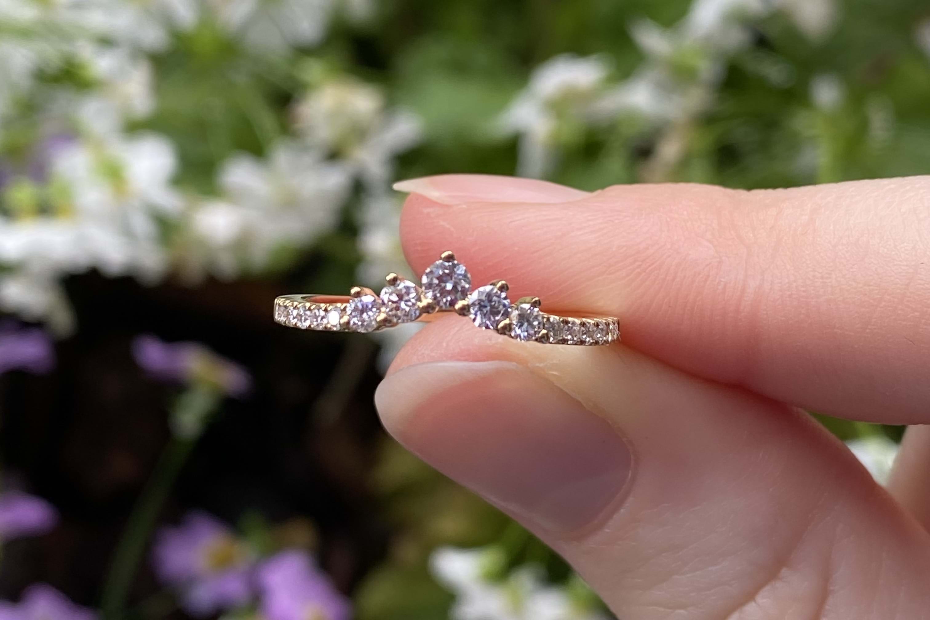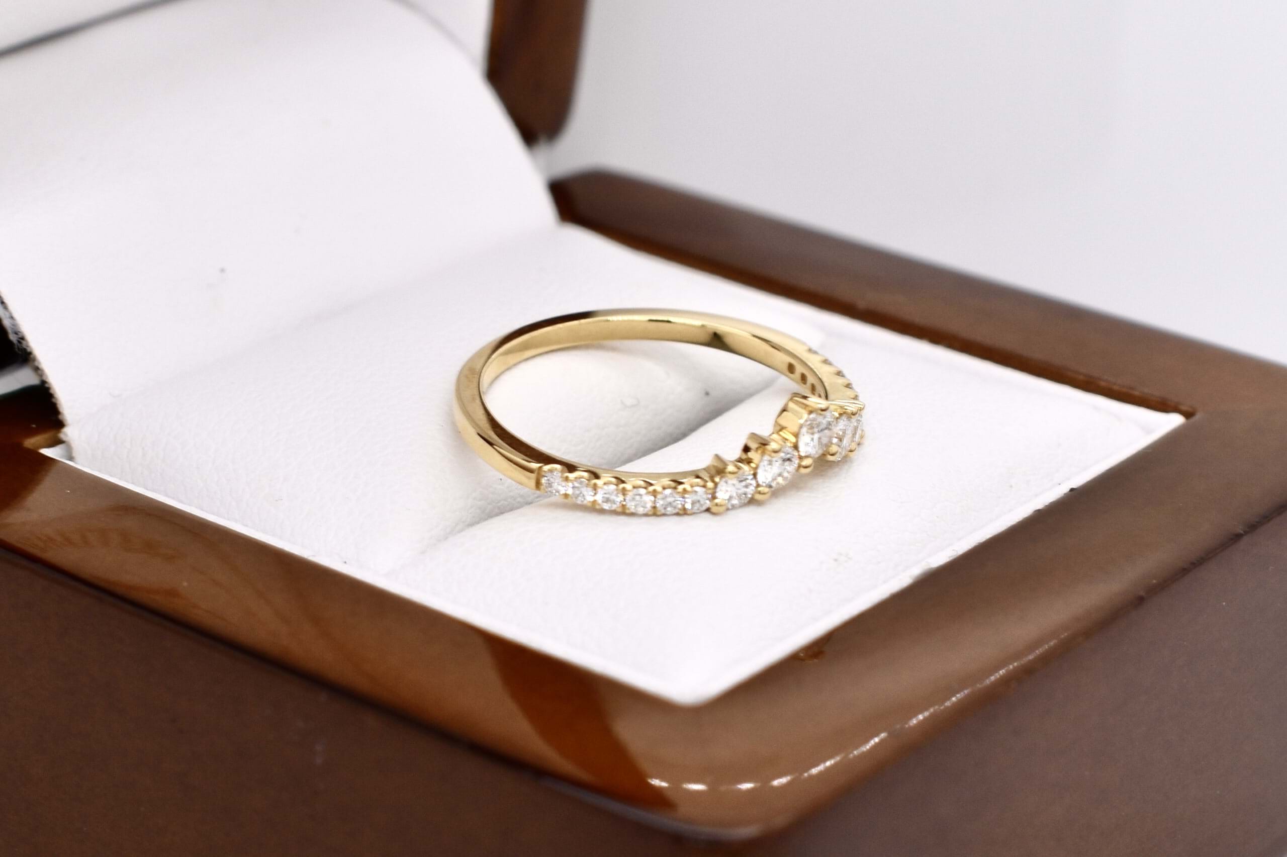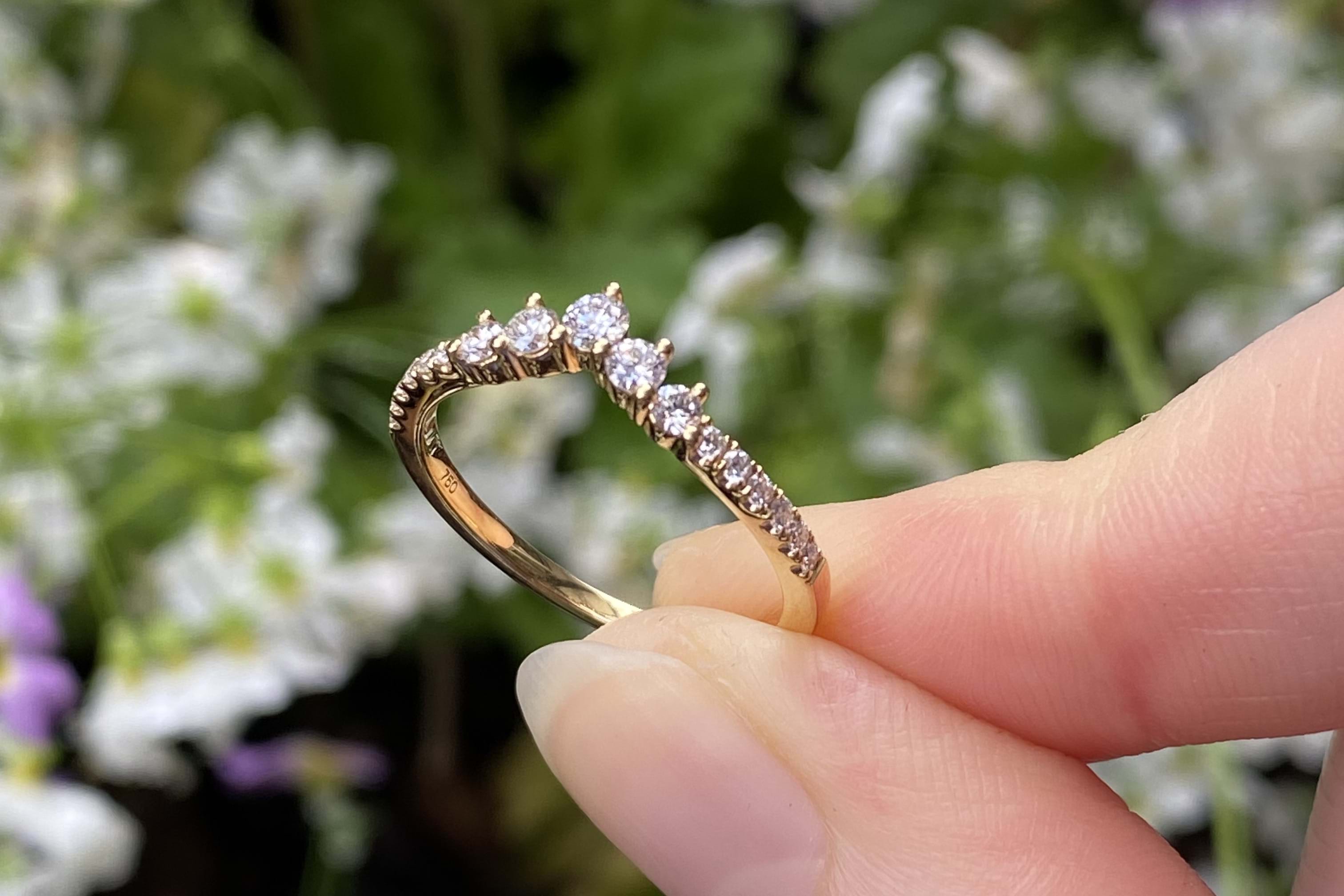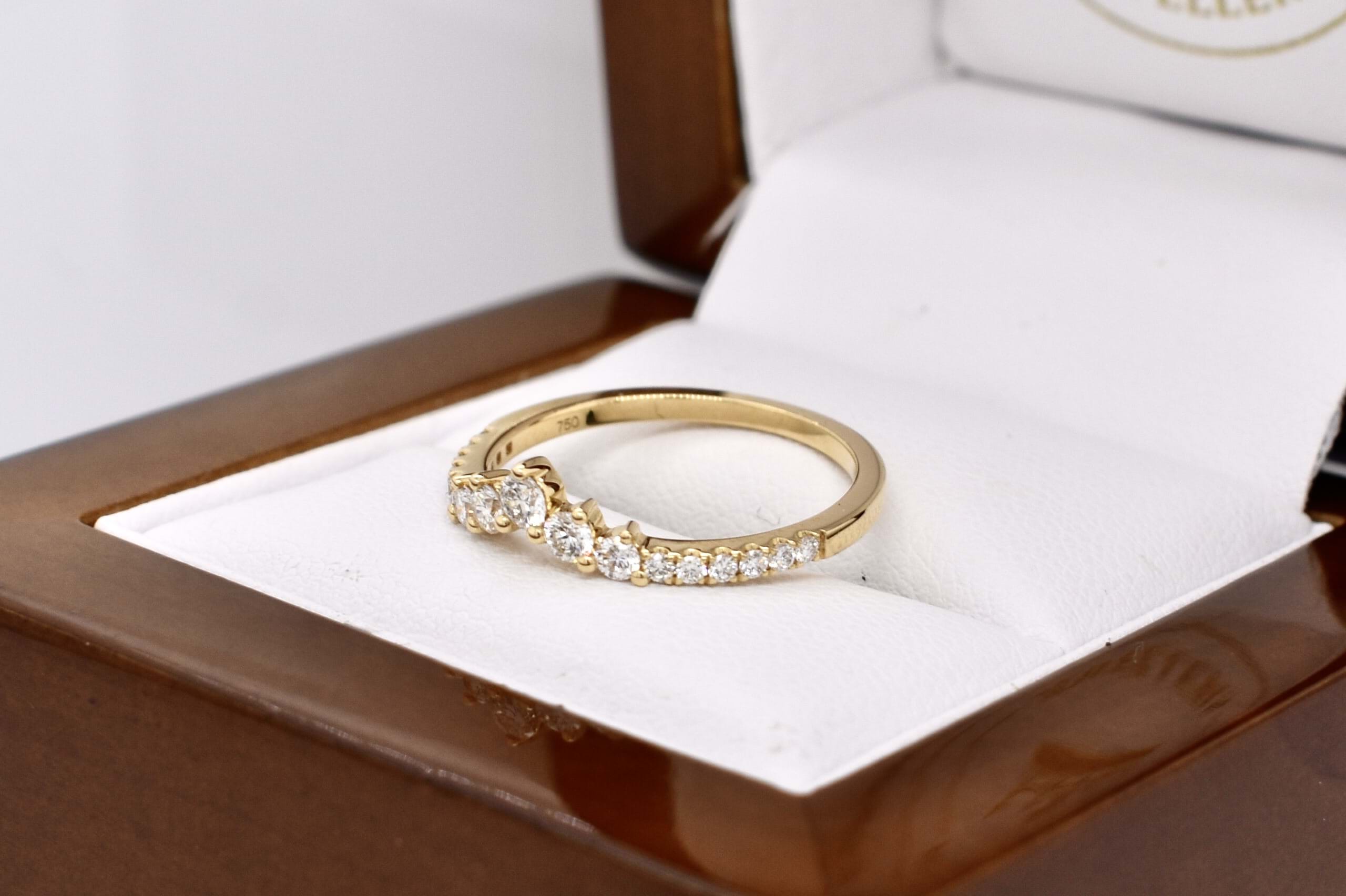 This stunning v-shaped band is crafted in 18ct yellow gold and features 17 round brilliant cut diamonds, shared claw set, measuring from 2.60-1.40mm and totalling 0.38ct FG VS-SI. The dazzling diamonds are set in a slight curved shape on a 1.38mm band. Finger size M. Independent Valuation Supplied.