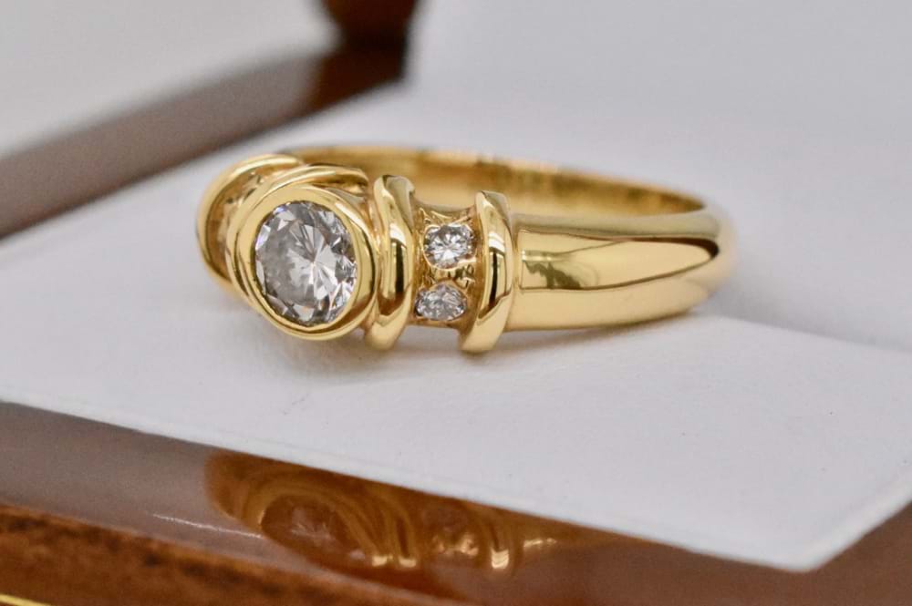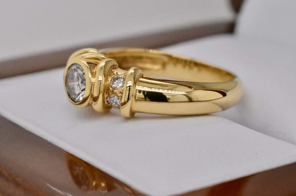 This 18ct yellow gold bezel set diamond ring contains a 0.40ct (H/VS) round brilliant cut diamond in the centre, with two smaller diamonds set vertically on either side totalling 0.12cts (HI/SI-P1). Perfect for someone who wants a low set, practical, & understated ring. Independent Valuation Supplied. Finger size L