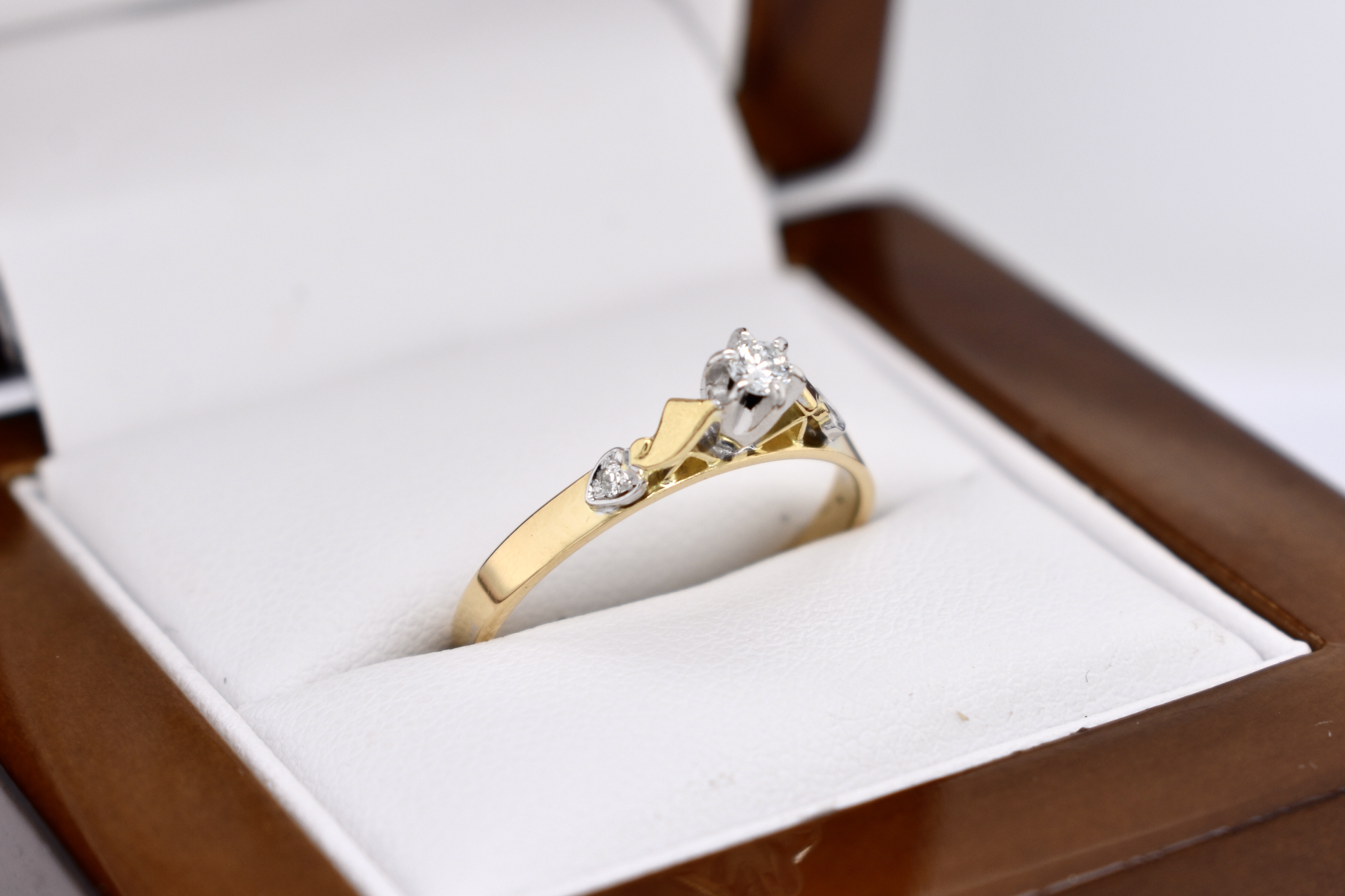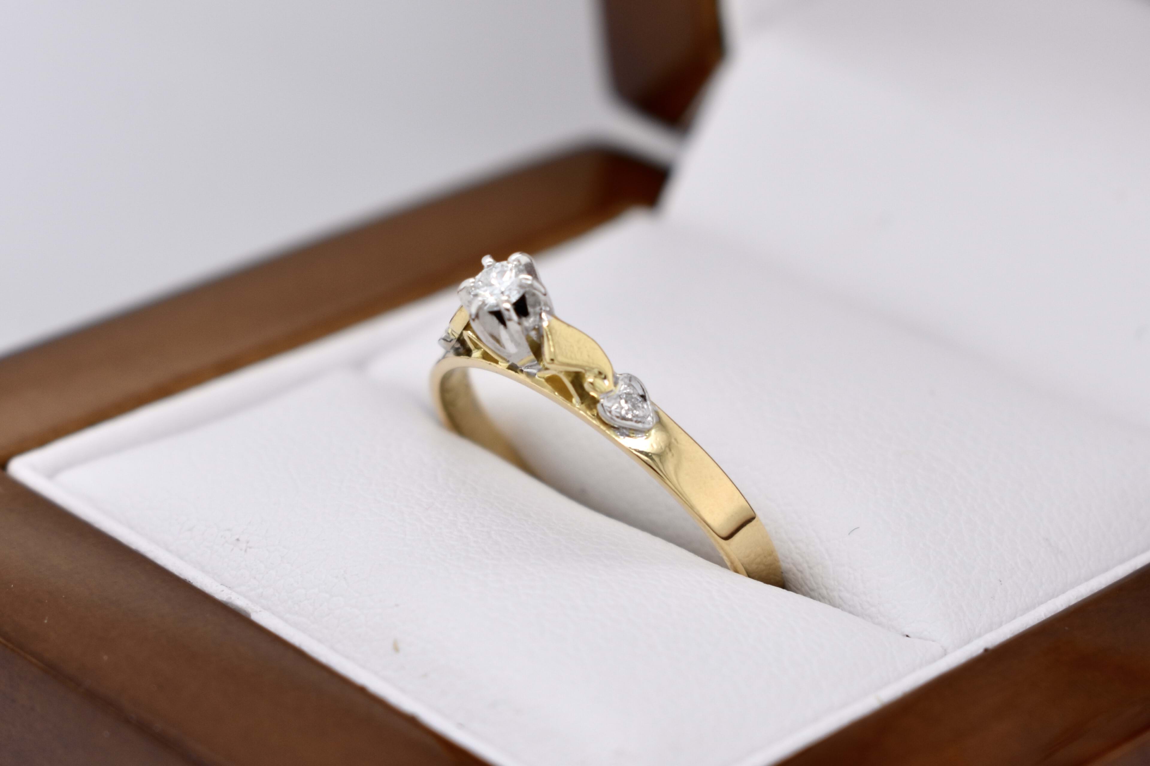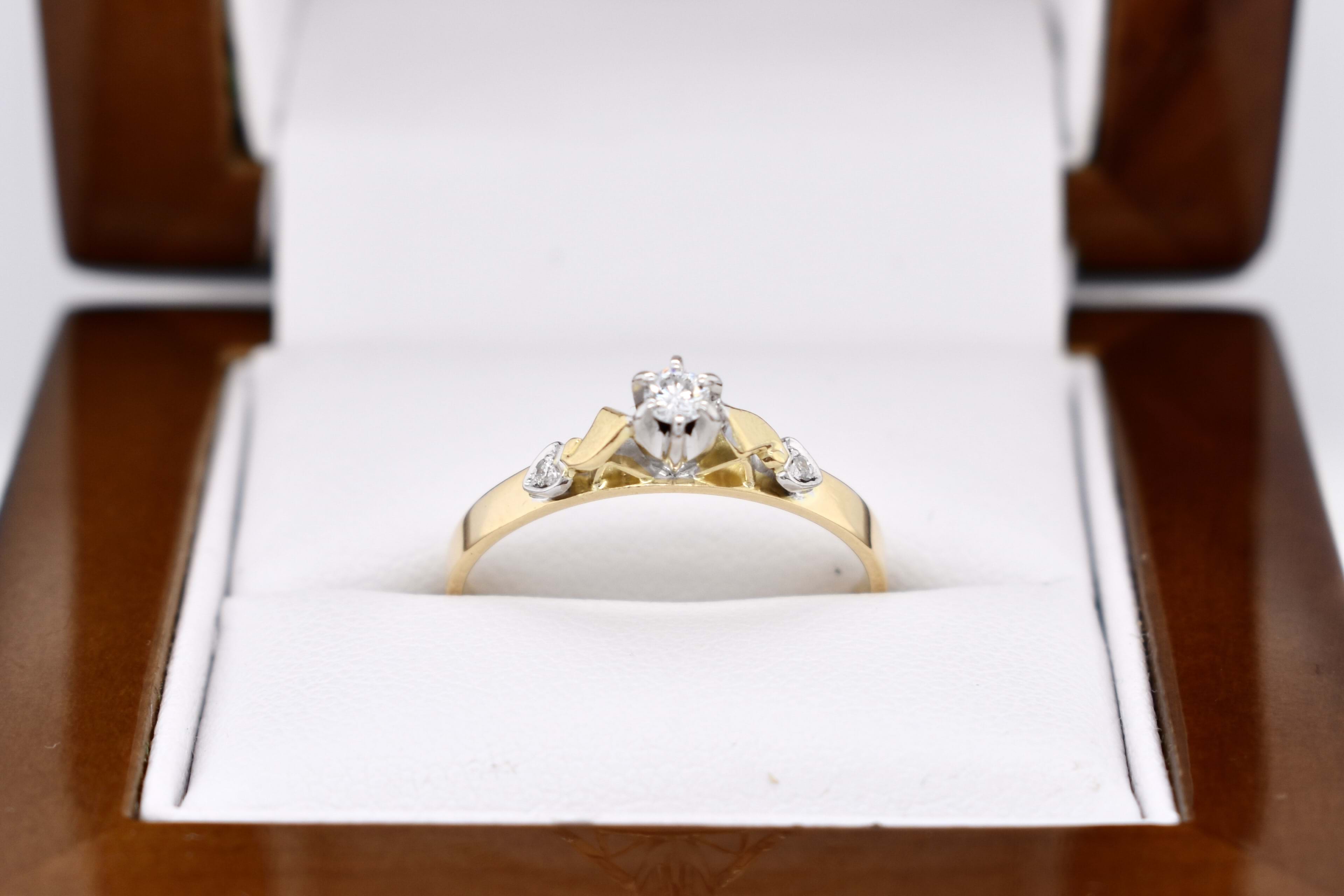 The sweetest vintage ring, featuring a round 2.8mm diamond with tall raised claws, set in 18ct yellow gold and white gold detailing. The ring also has two small diamonds, one set into each shoulder, completed on a plain flat band. 2.27 grams. Finger size O+.