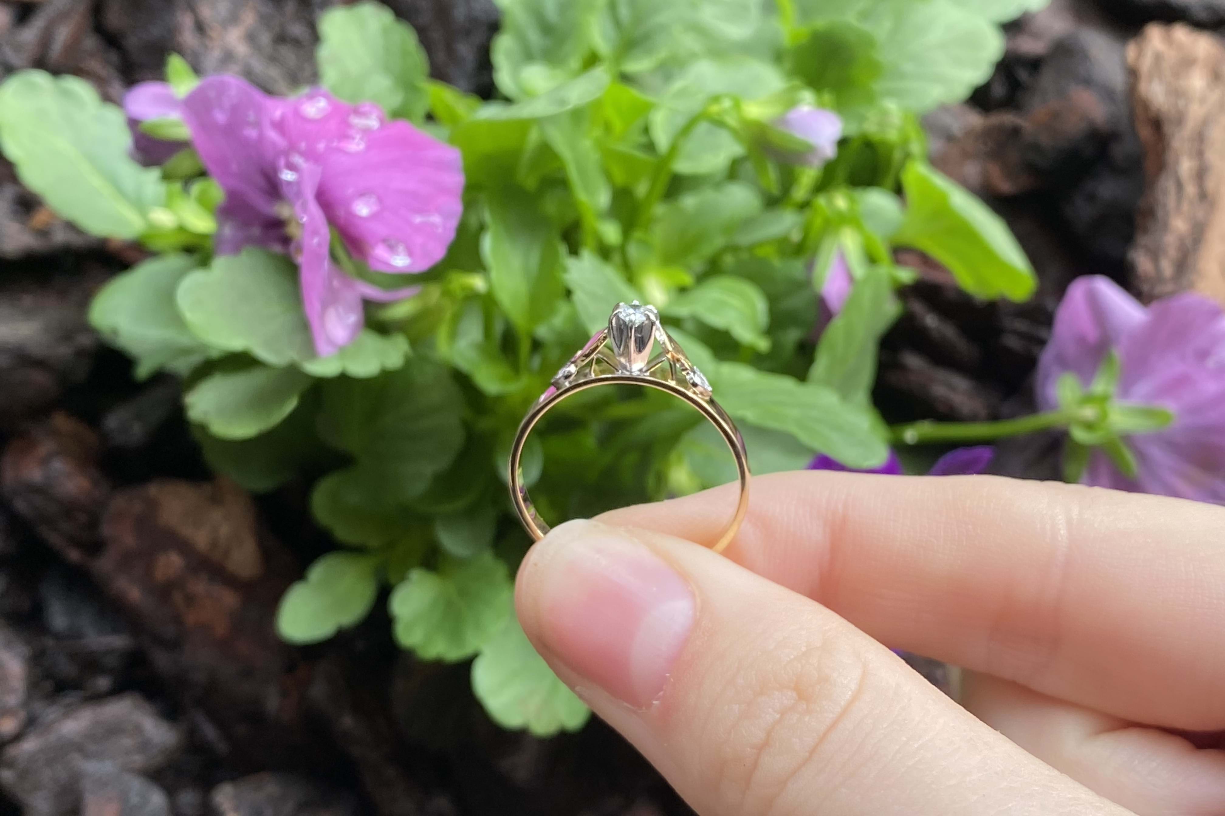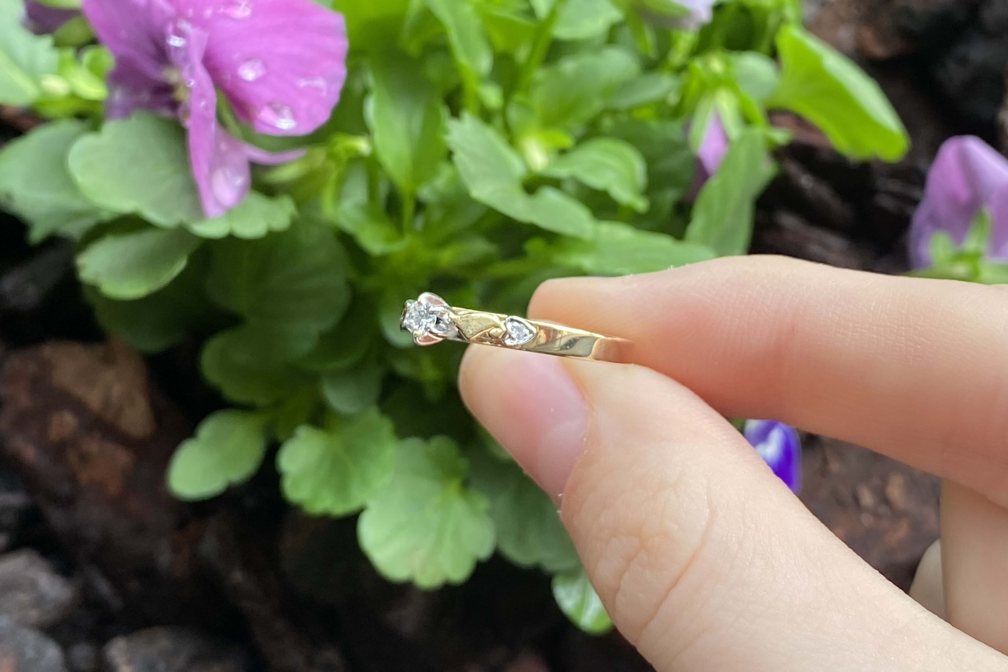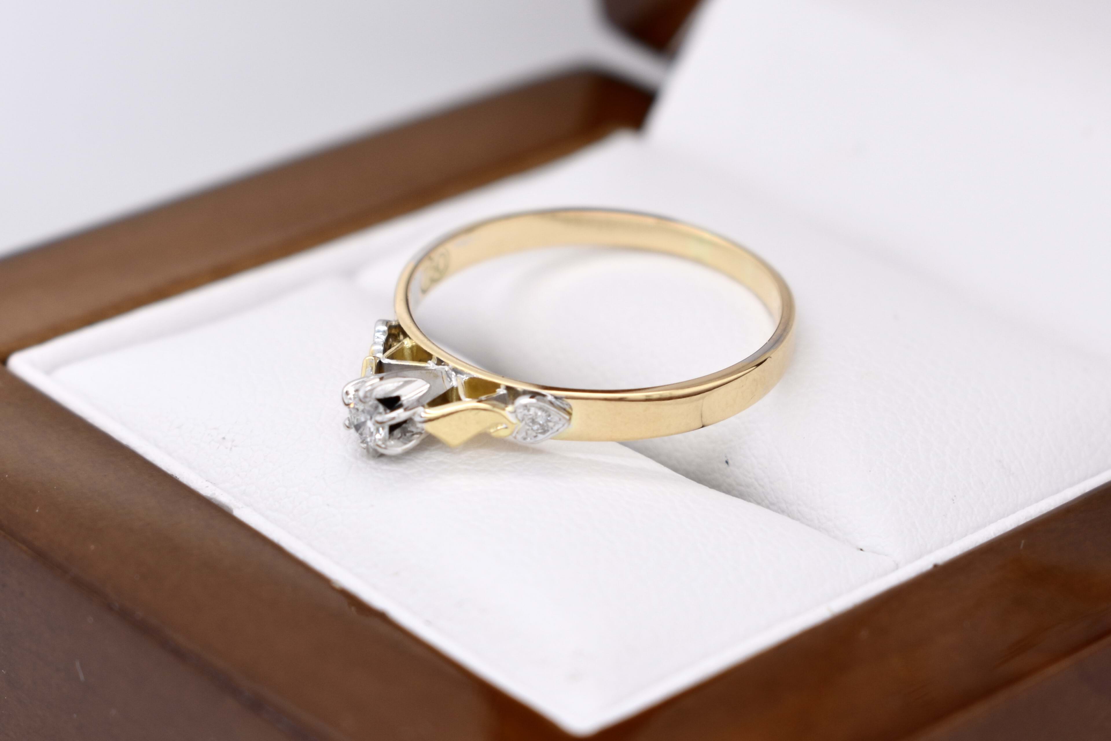 The sweetest vintage ring, featuring a round 2.8mm diamond with tall raised claws, set in 18ct yellow gold and white gold detailing. The ring also has two small diamonds, one set into each shoulder, completed on a plain flat band. 2.27 grams. Finger size O+.
