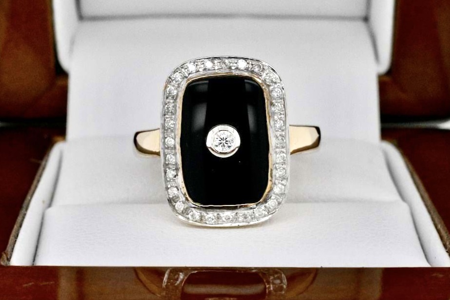 SOLD 9ct Yellow & White Gold Cushion Onyx & Diamond Ring (N+)