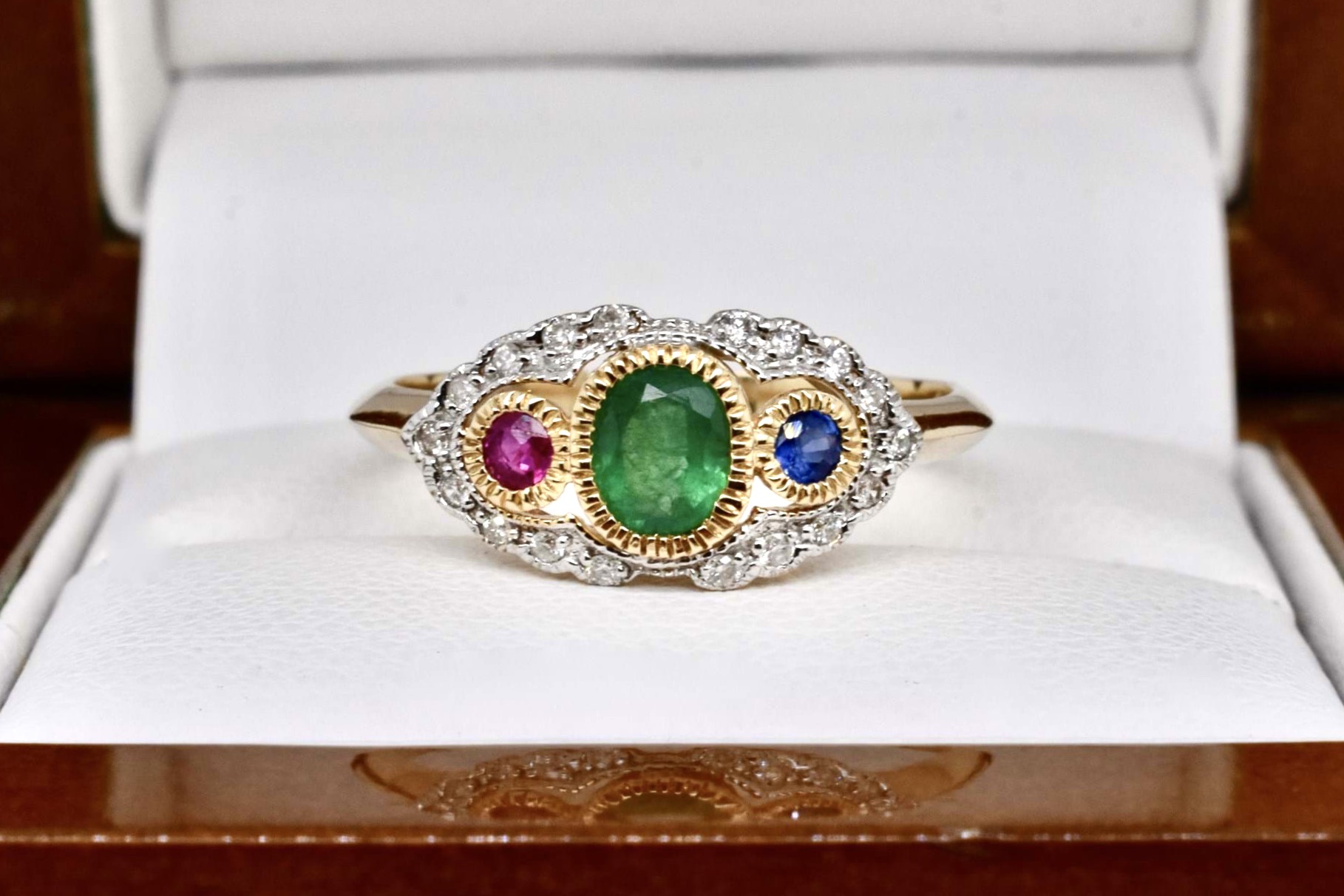 SOLD 9ct Yellow Gold Emerald, Ruby, Sapphire & Diamond Bridge Ring