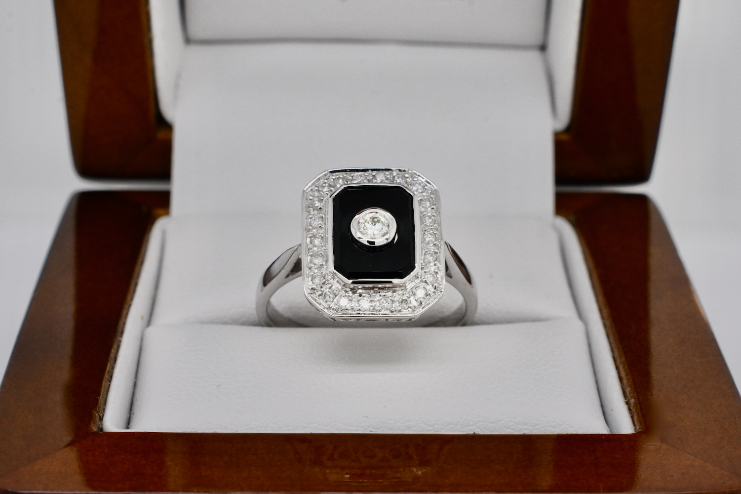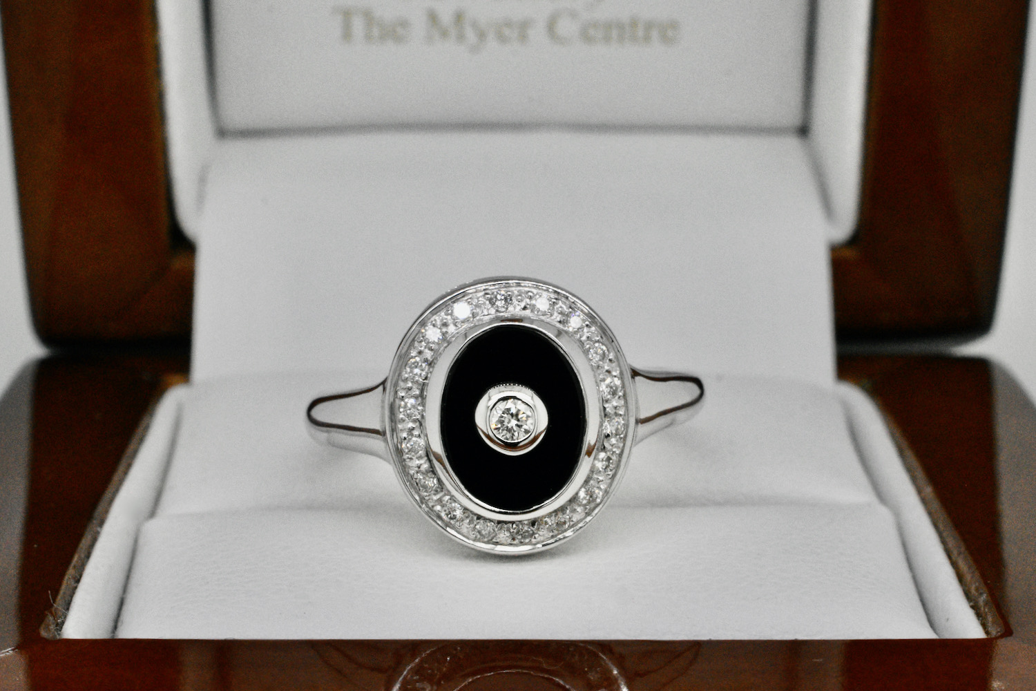 SOLD 18ct White Gold Onyx & Diamond Deco Style Ring