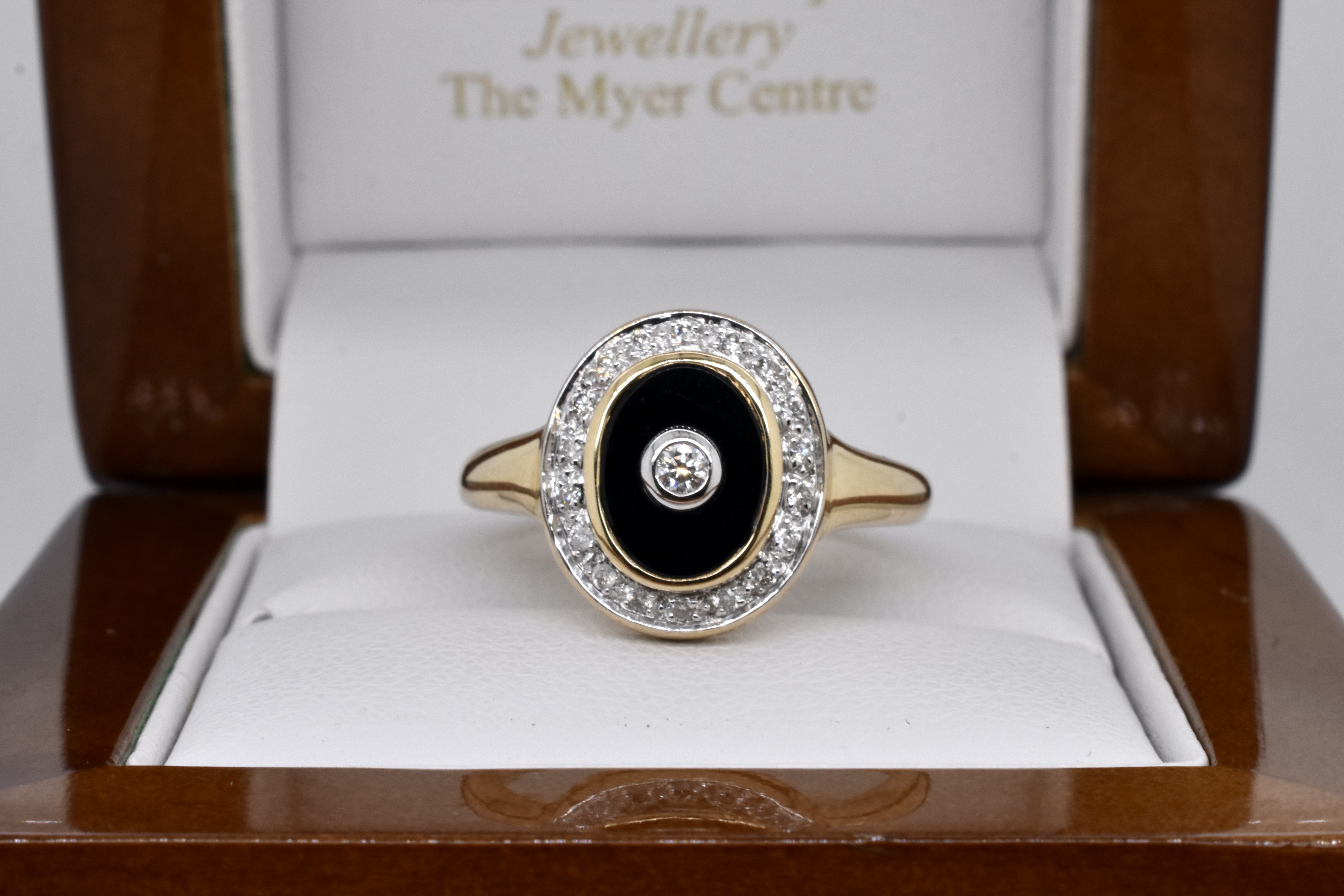 SOLD 9ct Yellow Gold Oval Onyx & Diamond Ring (O+)