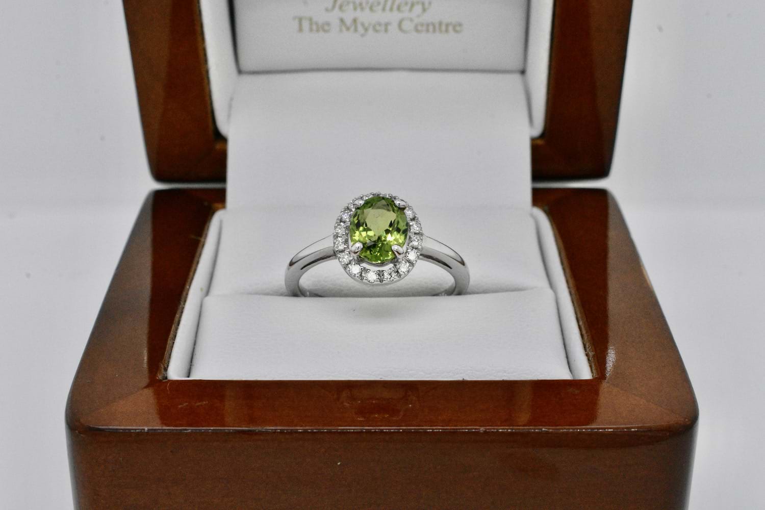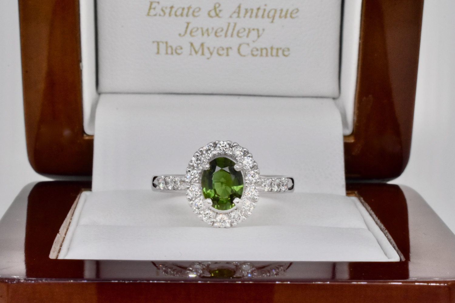 SOLD 9ct White Gold 1.14ct Green Tourmaline & Diamond Halo Ring