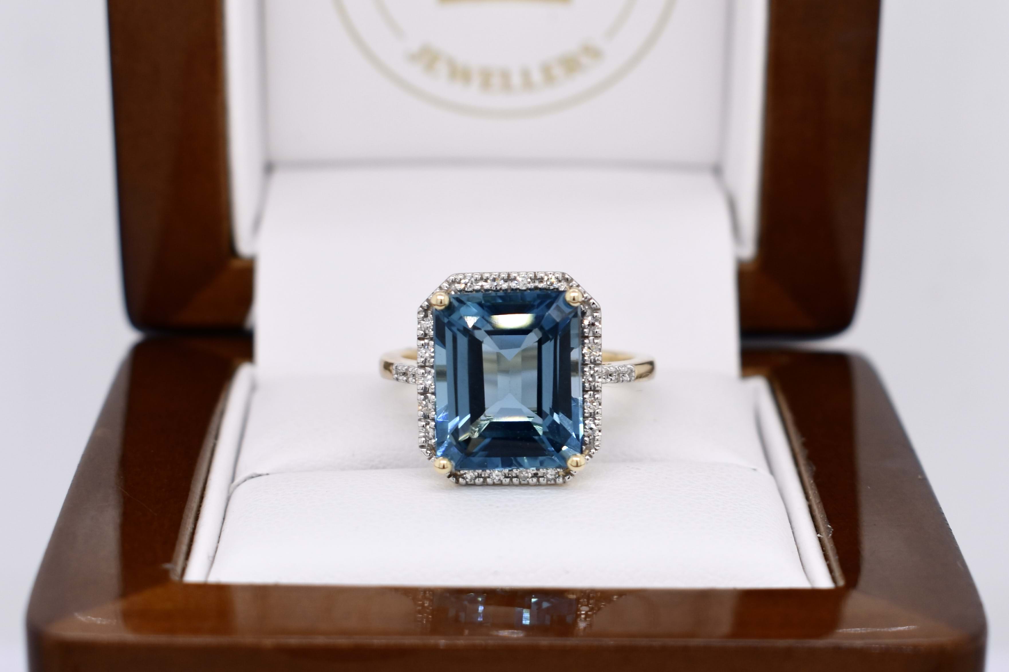 SOLD 9ct Yellow Gold Emerald Cut London Blue Topaz & 0.12ct Diamond Ring (N)