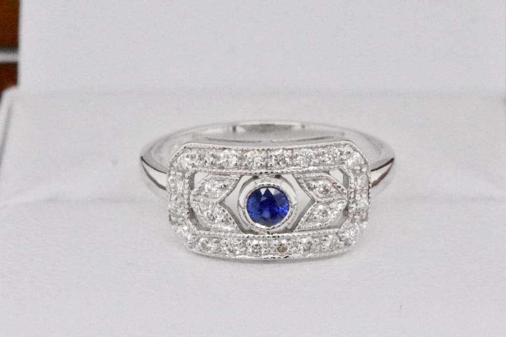 SOLD 9ct White gold Sapphire & Diamond Art Deco Style Ring