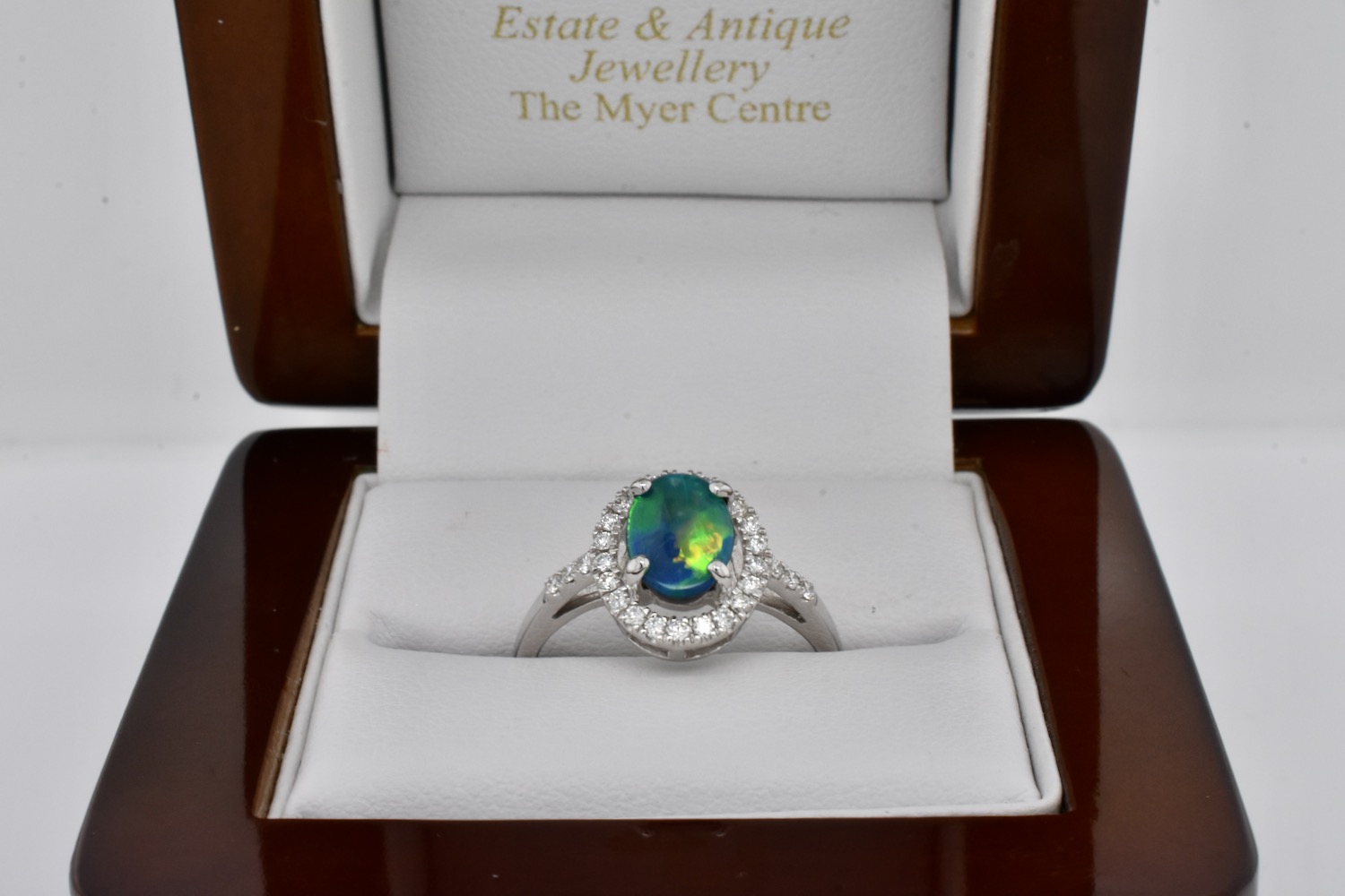 SOLD 9ct White Gold Opal Doublet & Diamond Ring (N)