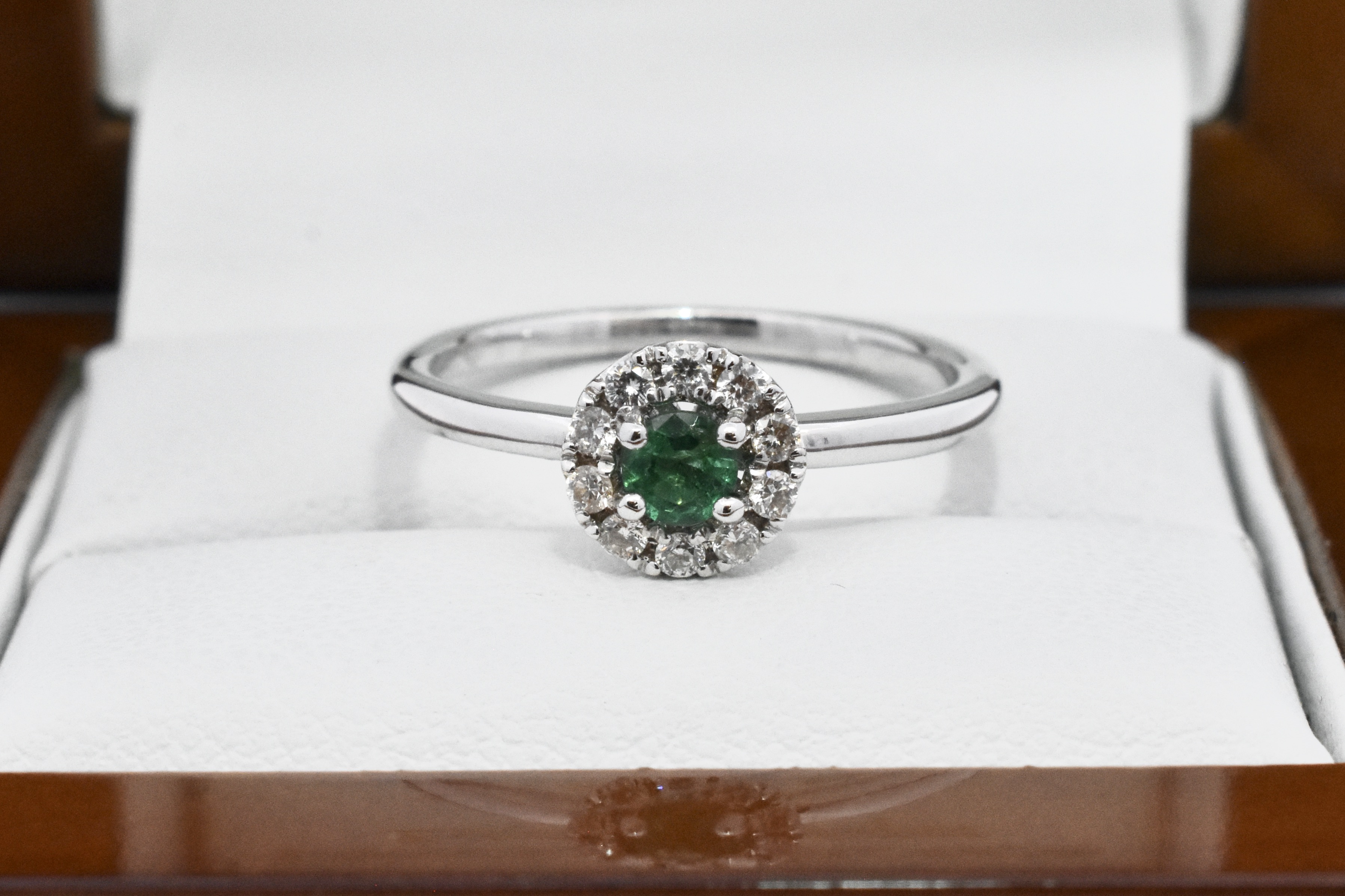 SOLD 18ct White Gold 0.16ct Emerald & Diamond Halo Ring