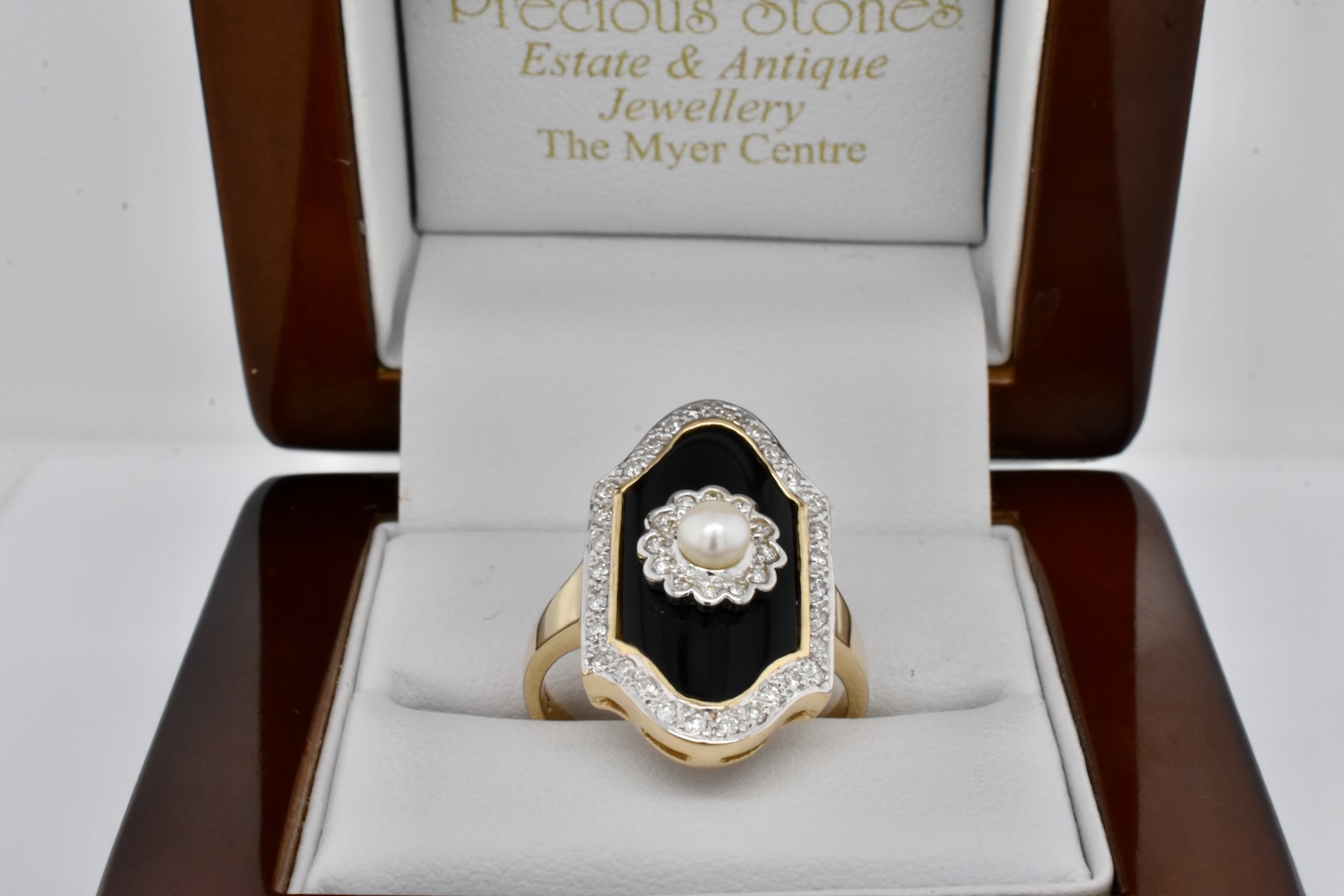 SOLD 9ct Yellow Gold Art Deco Style Onyx, Pearl & Diamond Ring