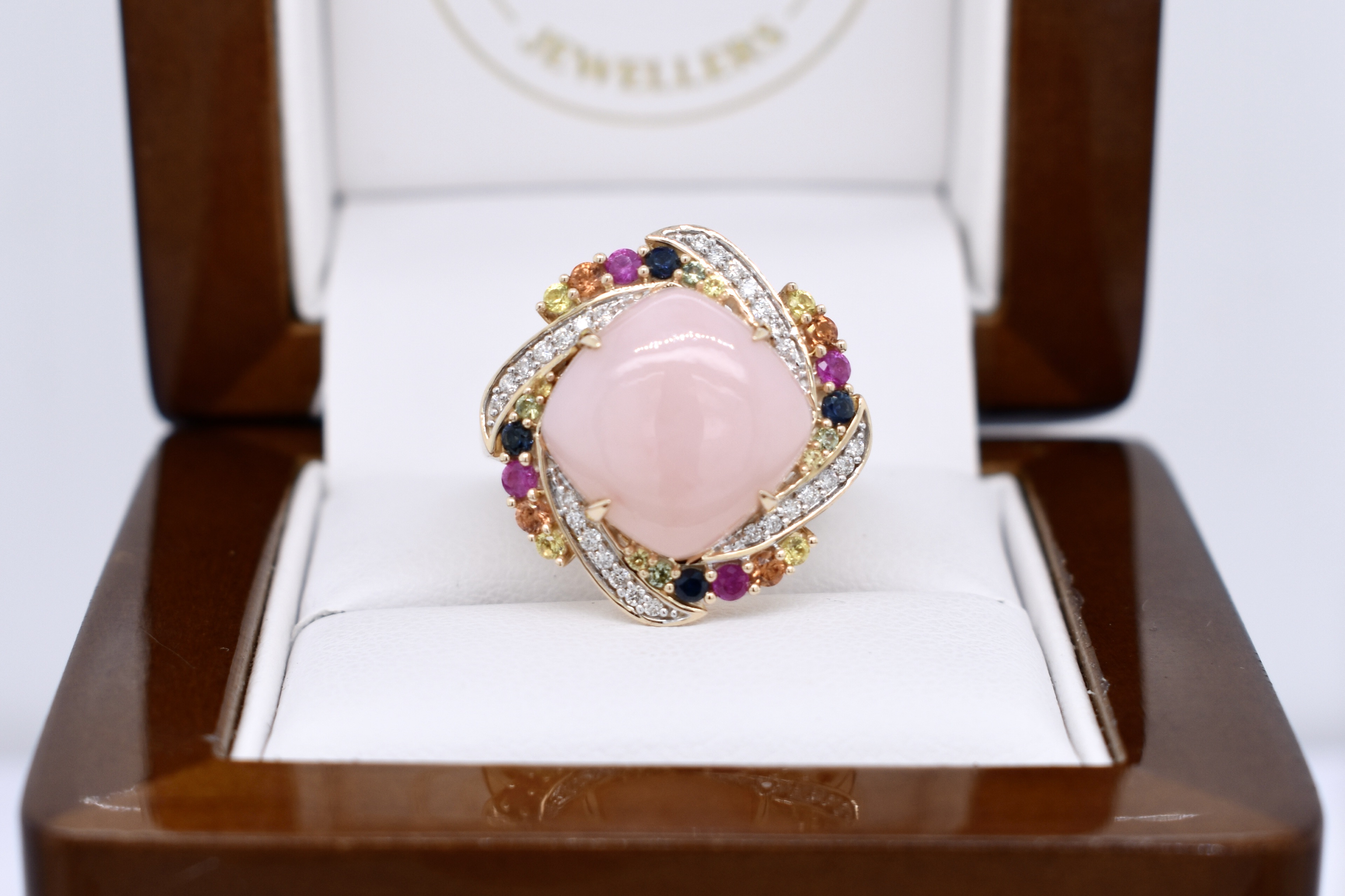 SOLD 9ct Yellow Gold Pink Opal, Multi Coloured Sapphire & 0.16ct Diamond Ring (N)