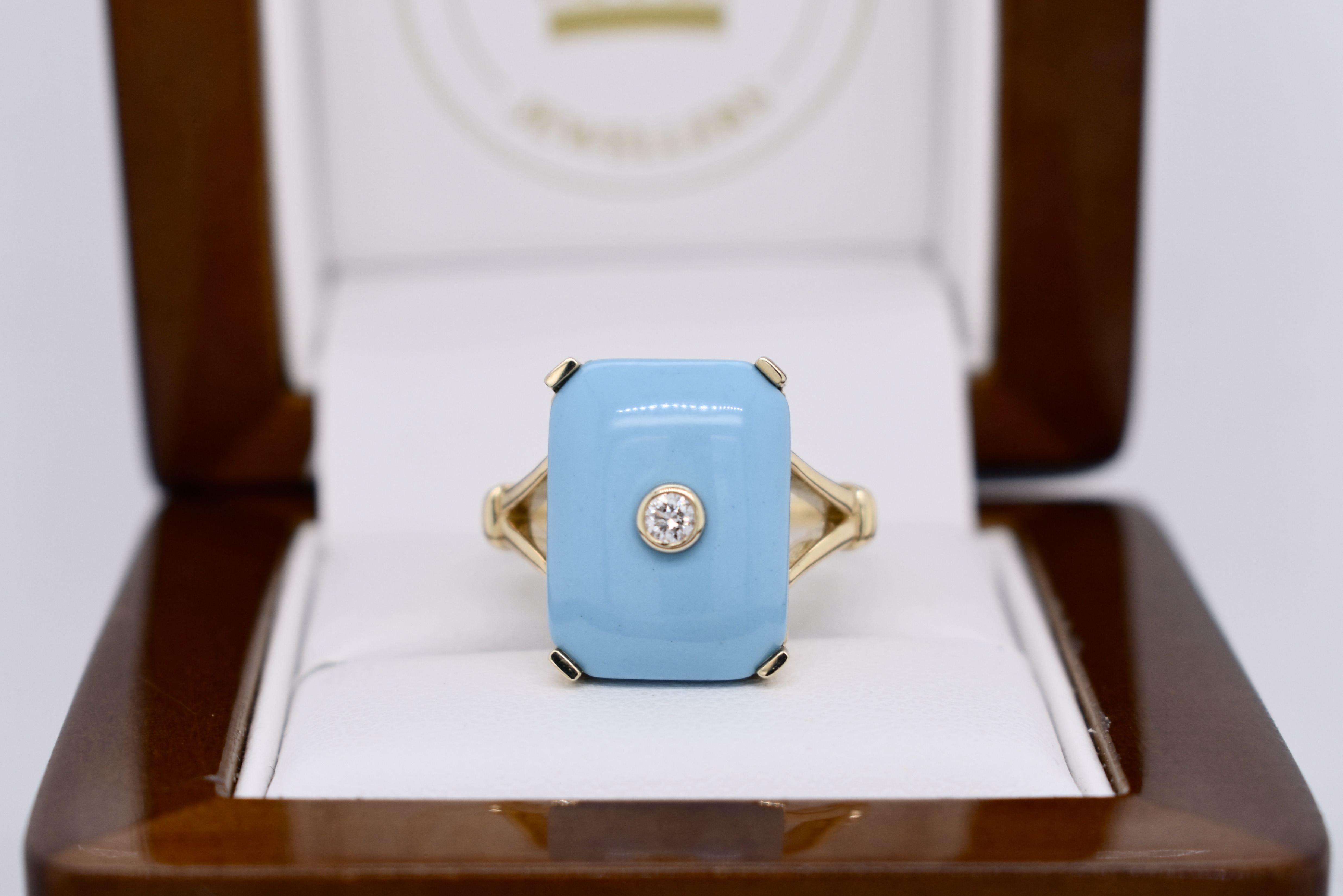 SOLD 9ct Yellow Gold Emerald Cut Turquoise & 0.07ct Diamond Ring (O)