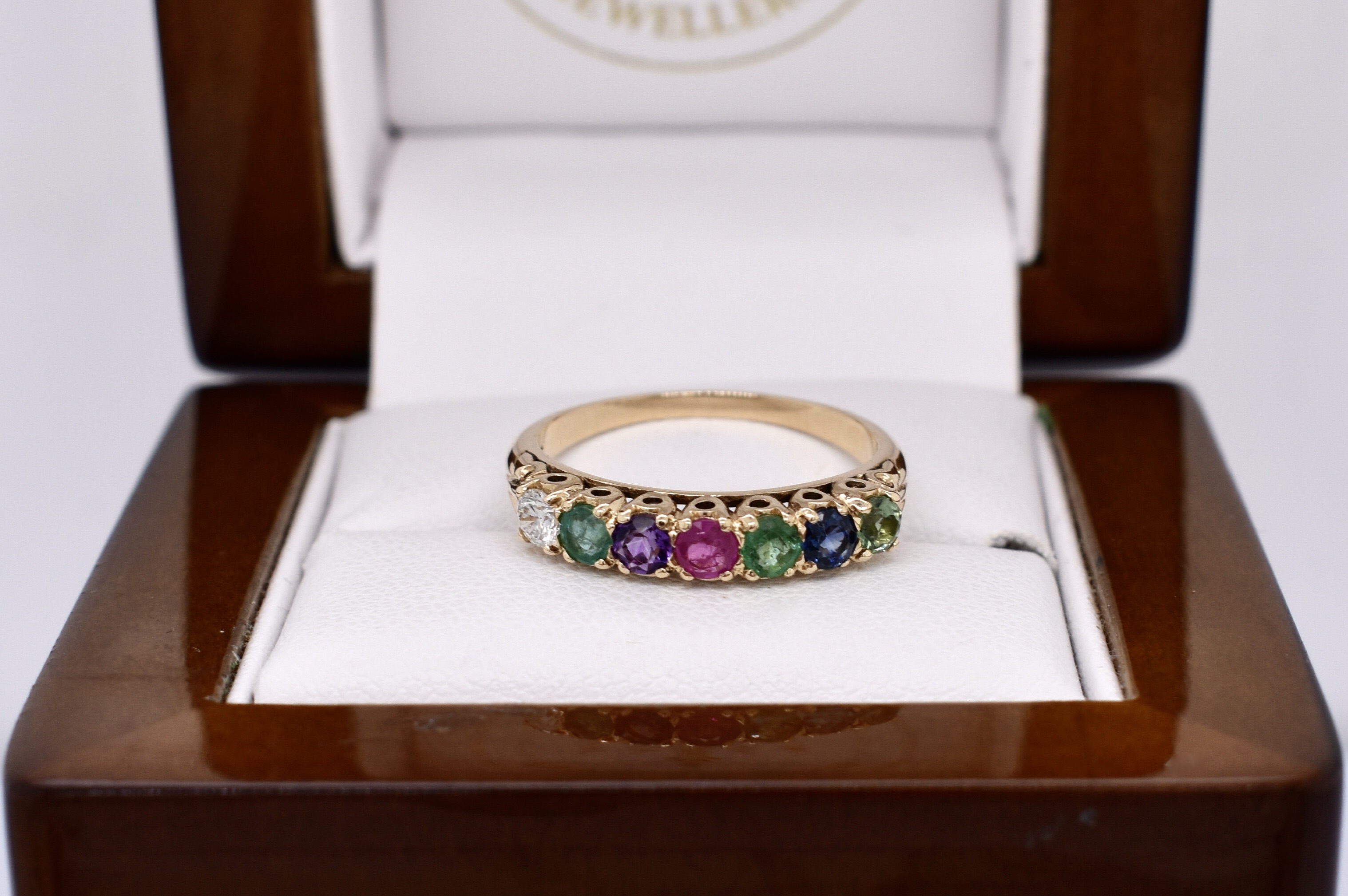 SOLD 9ct Yellow Gold Diamond, Emerald, Amethyst, Ruby, Sapphire & Tourmaline 'Dearest' Ring (N+)