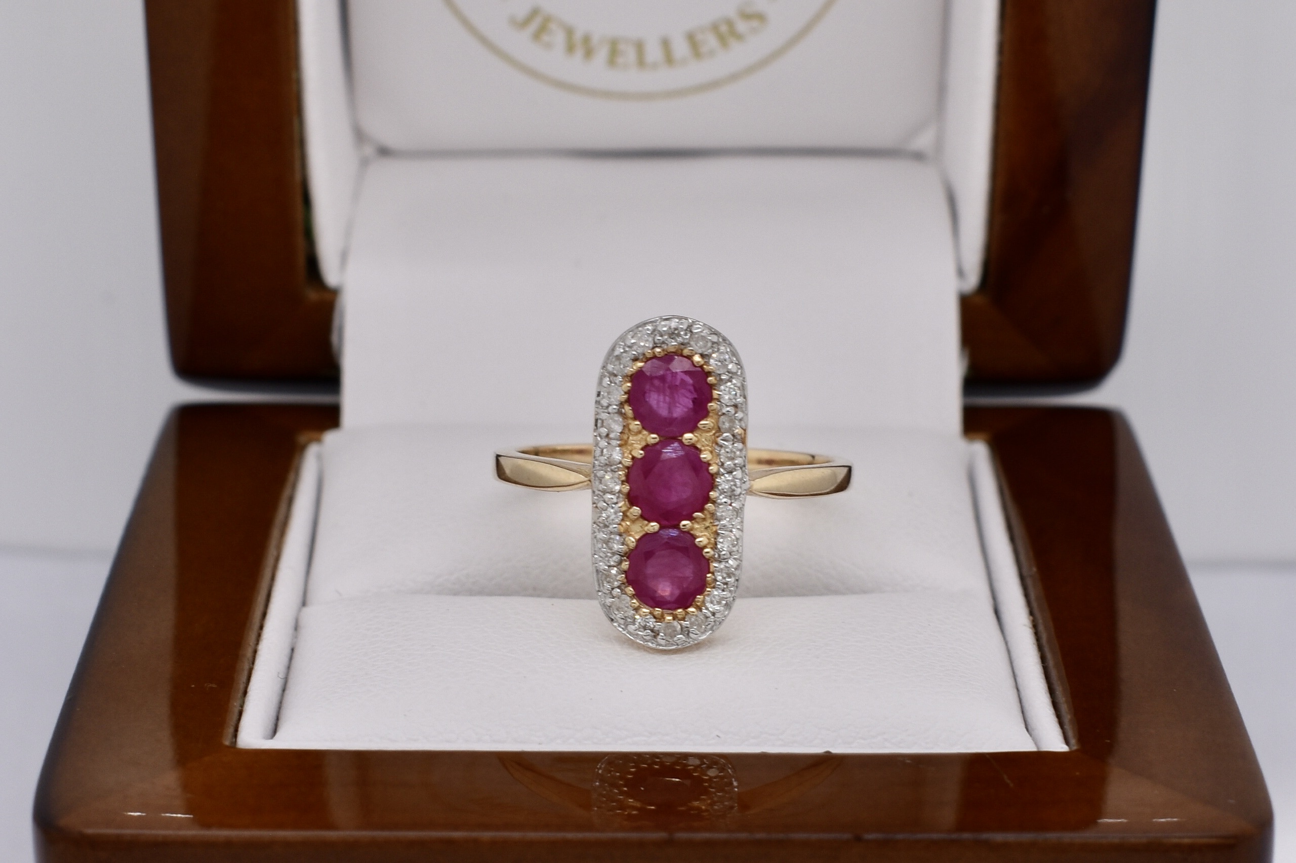 SOLD 9ct Yellow Gold 0.85ct Ruby & 0.12ct Diamond Deco Inspired Ring