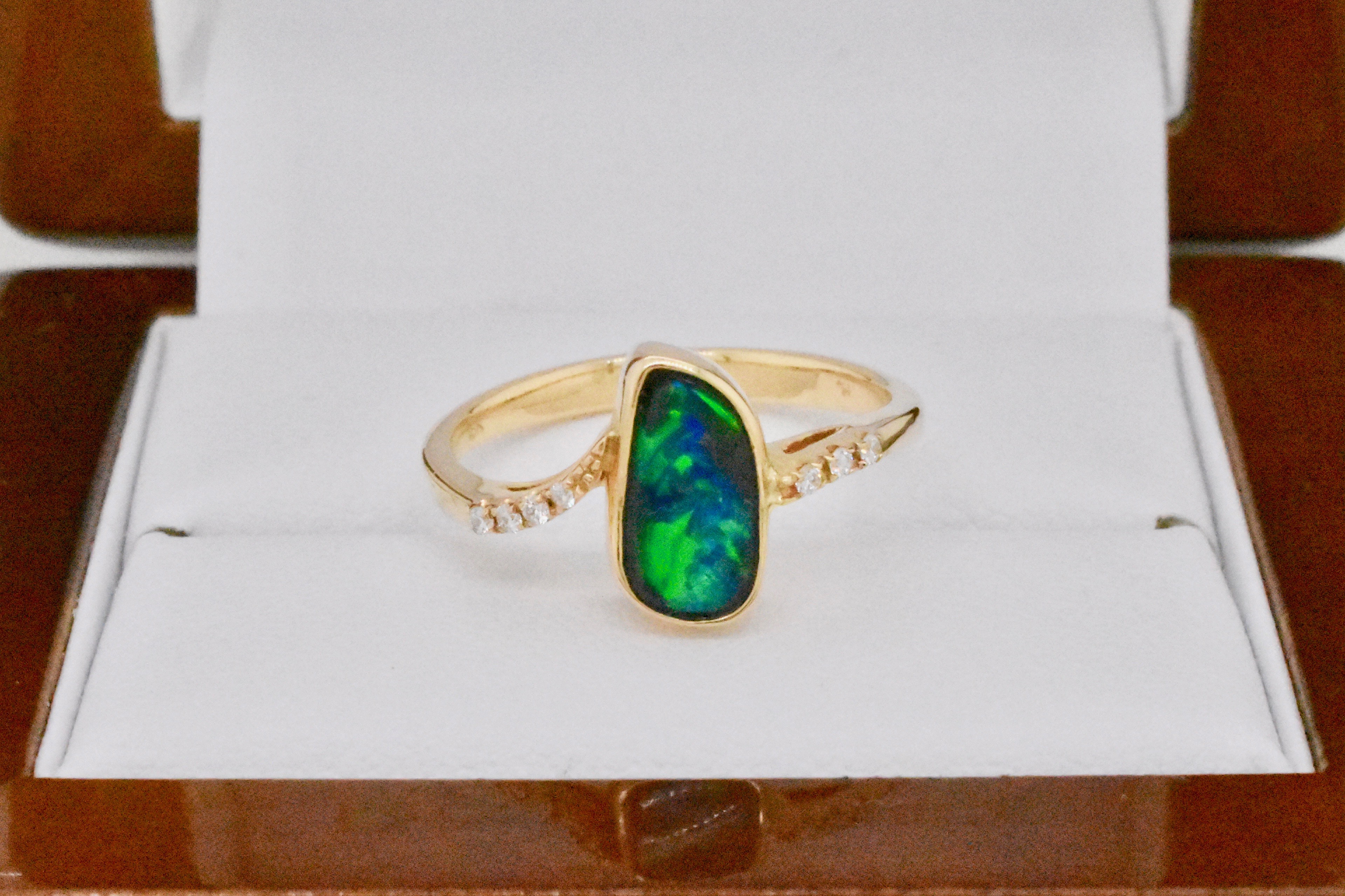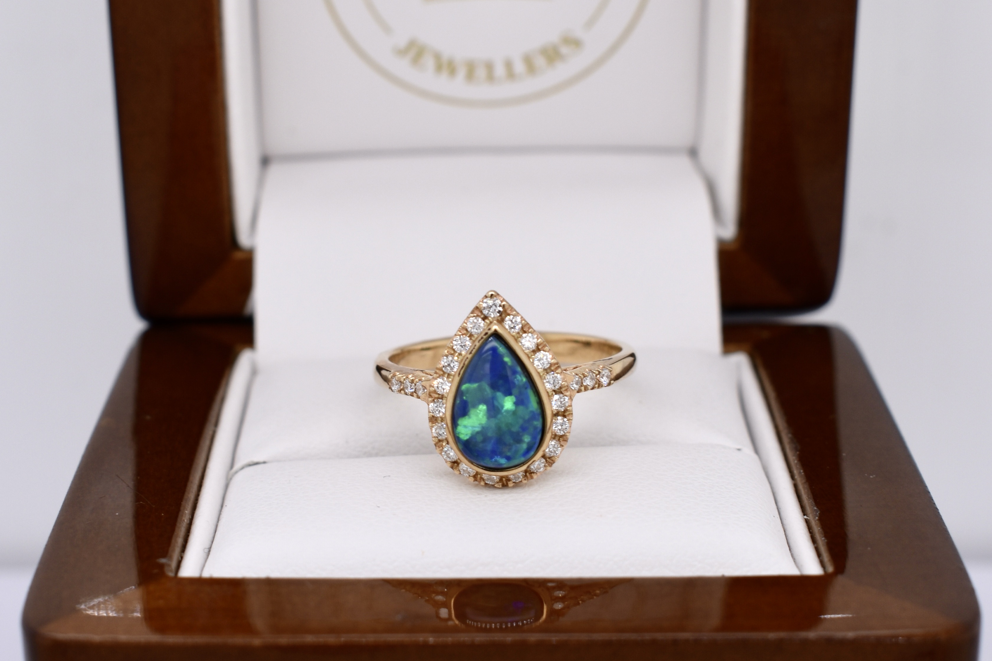 SOLD 9ct Yellow Gold Pear Shaped Opal Doublet & 0.20ct Diamond Ring (M+)