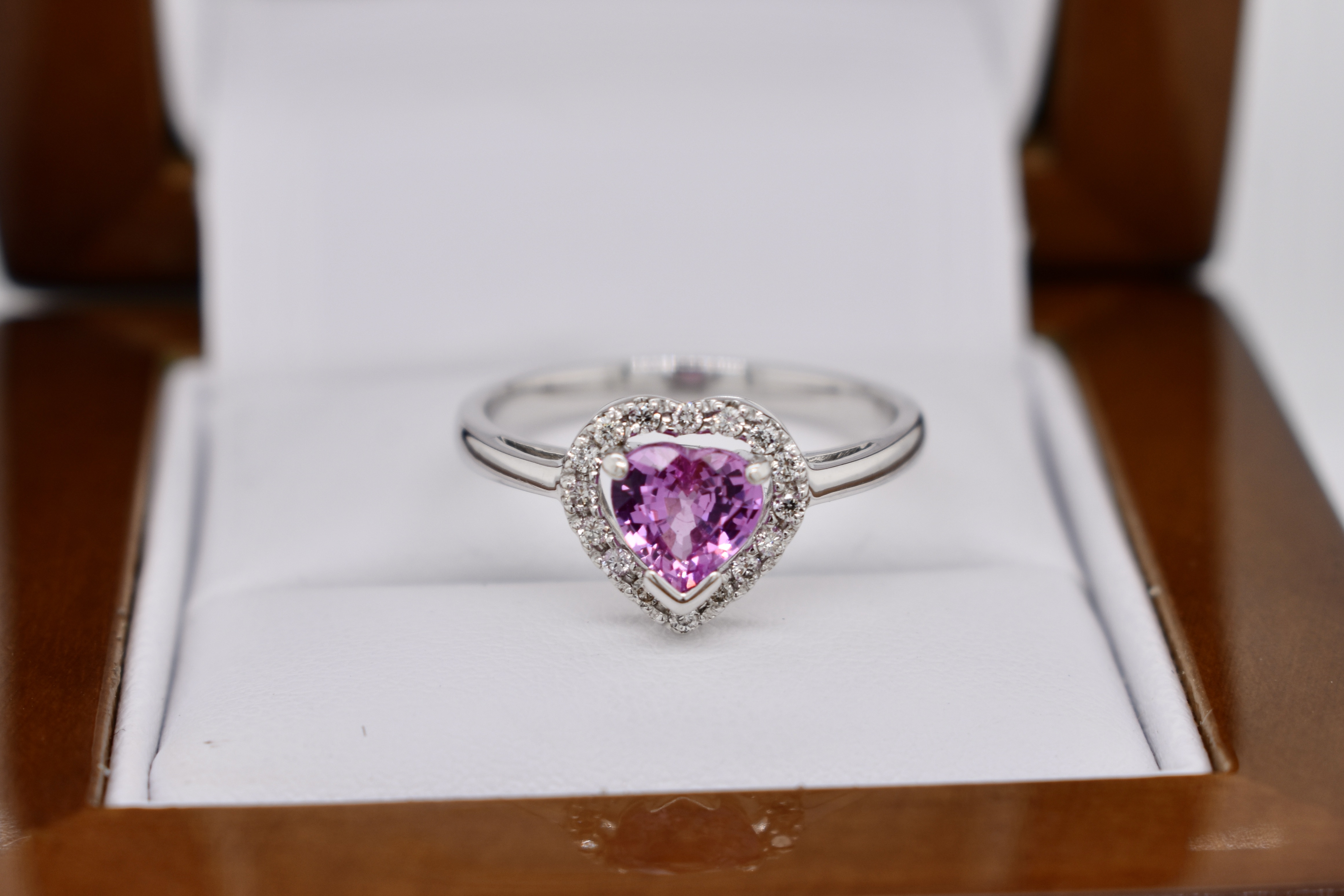 SOLD 9ct White Gold 0.96ct Heart Shape Pink Sapphire & Diamond Halo Ring