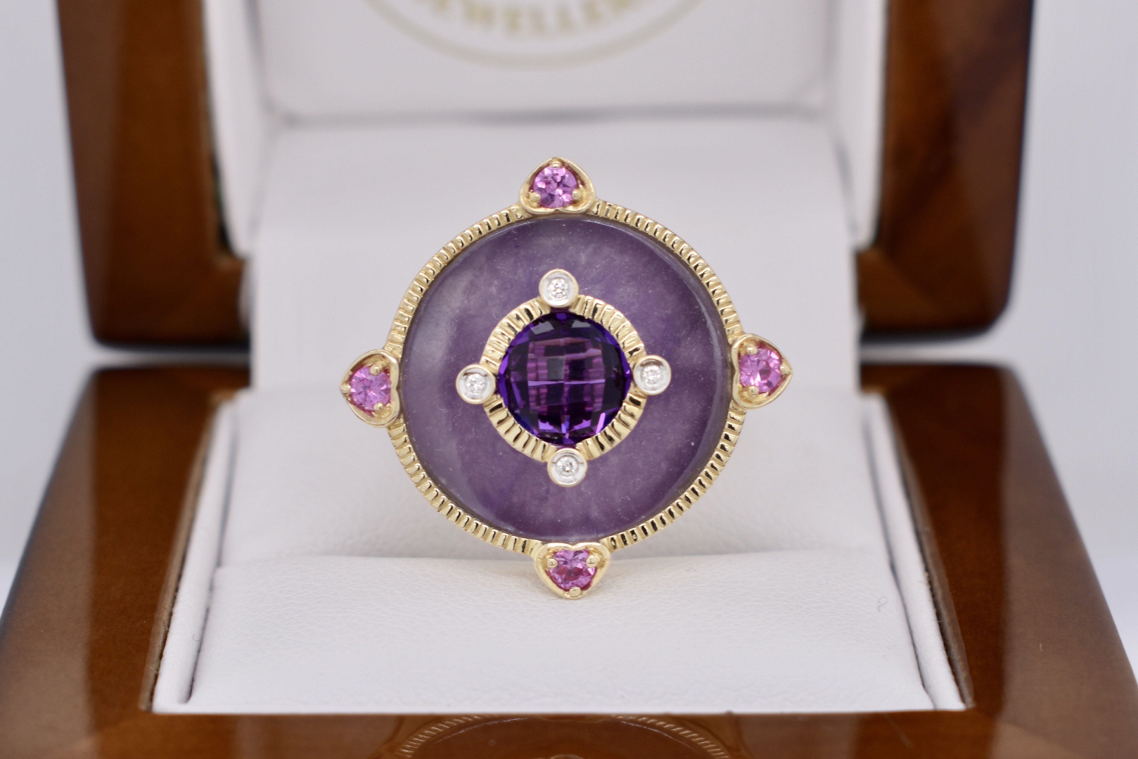 SOLD 9ct Yellow Gold Amethyst, Pink Sapphire, Diamond & Dyed Purple Jade Ring