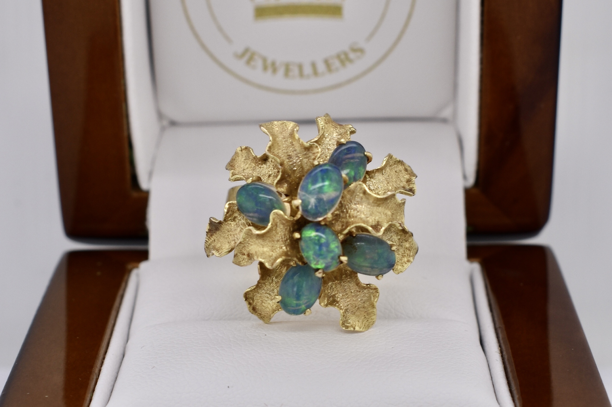 SOLD 14ct Vintage Yellow Gold 1.70ct White Opal Leaf Cluster Design Ring (M)