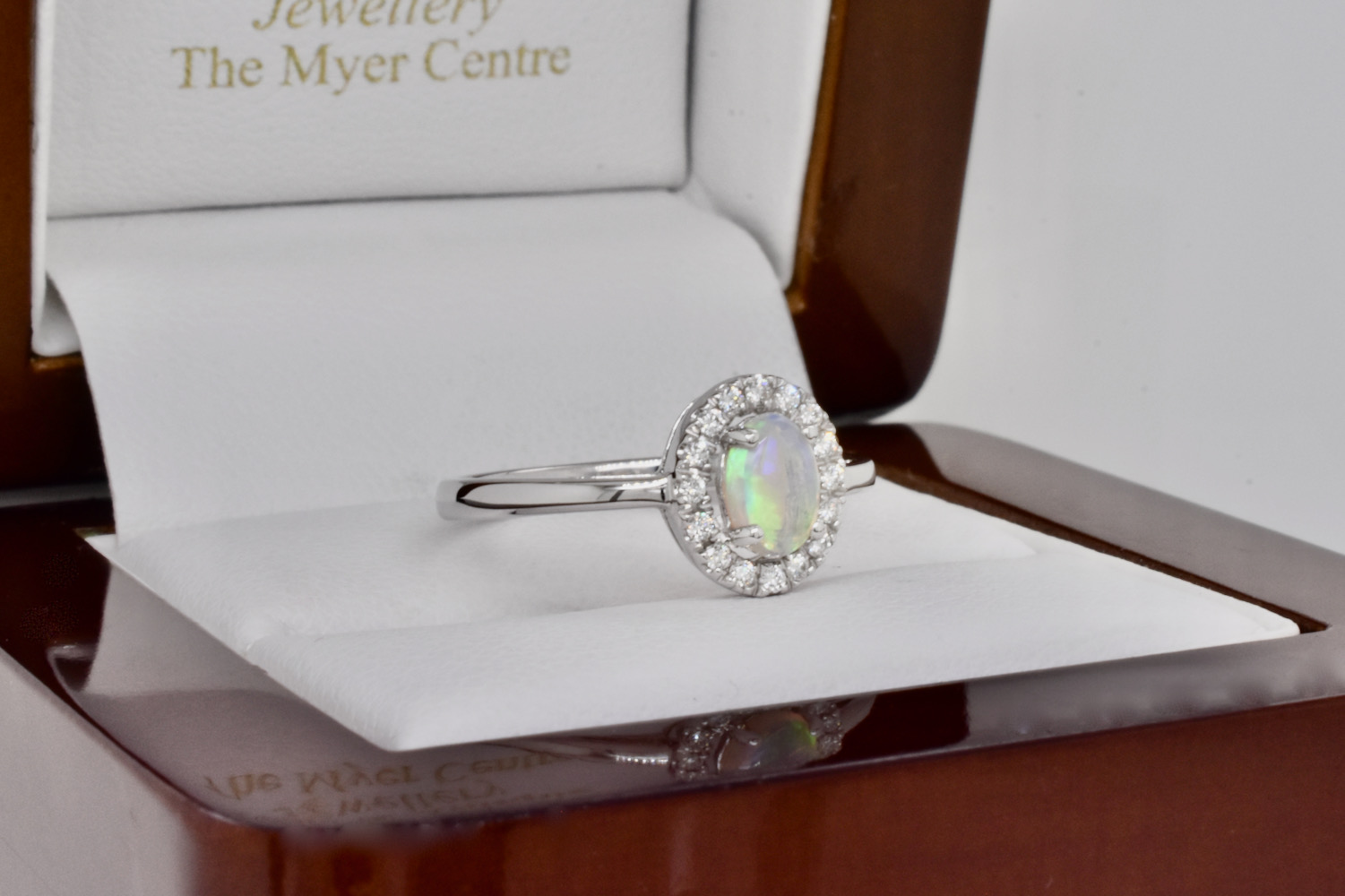 SOLD 9ct White Gold 0.31ct White Opal Crystal & 0.11ct Diamond Halo Ring