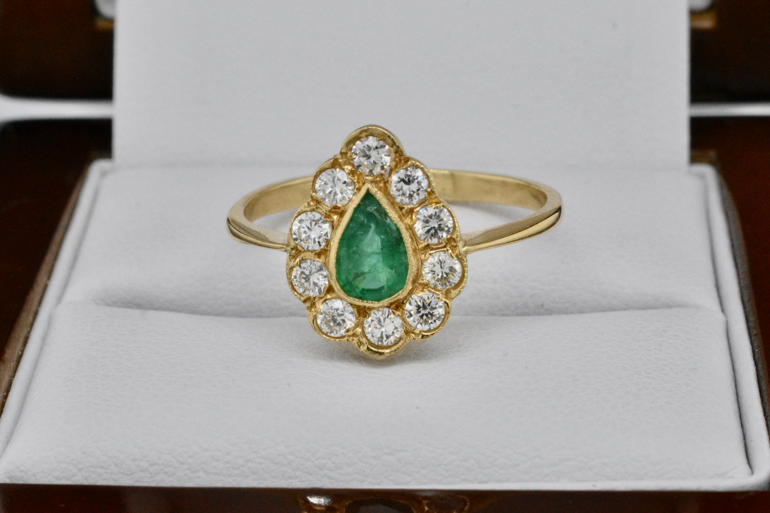SOLD Handmade 18ct Yellow Gold 0.30ct Pearshape Emerald & 0.50ct Diamond Ring