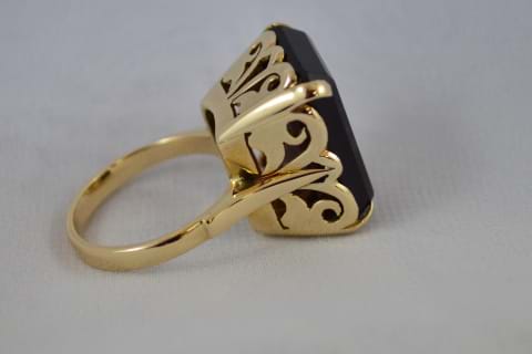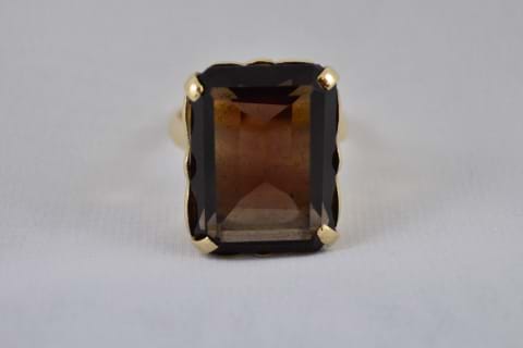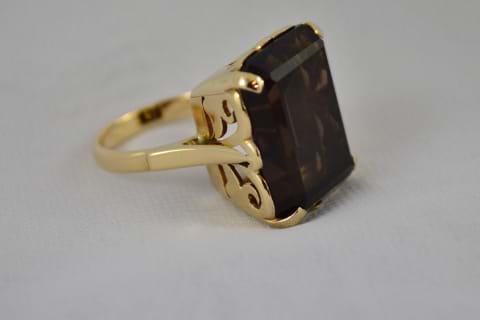 A great vintage find! This 14ct yellow gold cocktail ring features an impressive 17ct emerald cut Smokey Quartz in a decorative scroll design basket. Independent Valuation supplied.