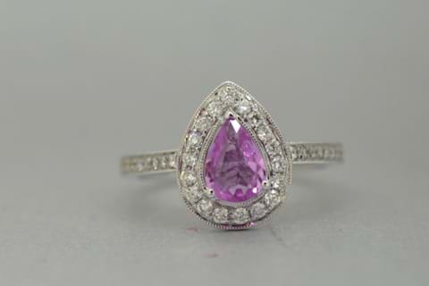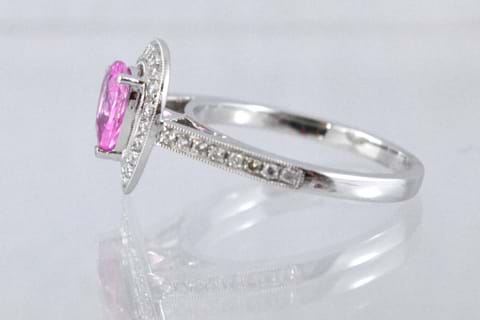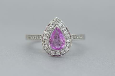 Pretty in pink! This beautifully bright soft-hued pink sapphire has been cut into a stunning 0.77ct pear shape and is the centre piece of an 18ct white gold diamond set halo ring. With 0.31cts of sparkling diamonds this ring is both pretty and practical having been designed to fit a straight wedder underneath, or worn alone as a right hand dress ring. Independent Valuation Supplied