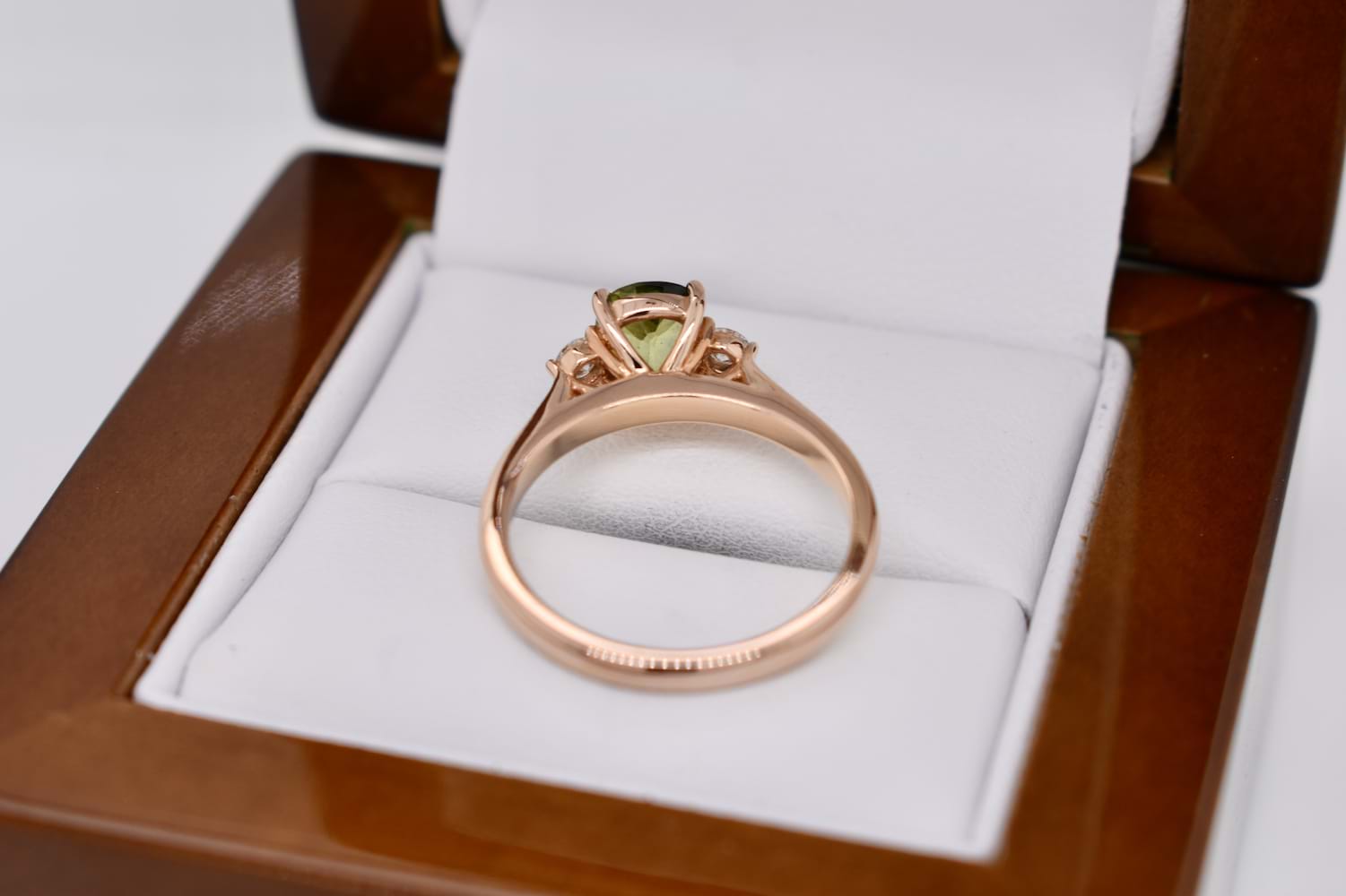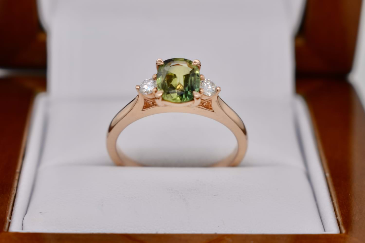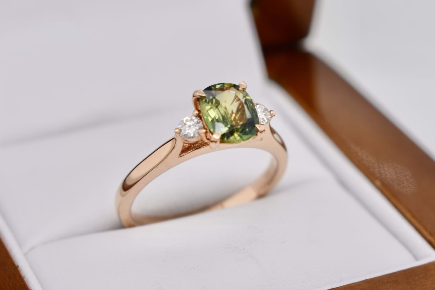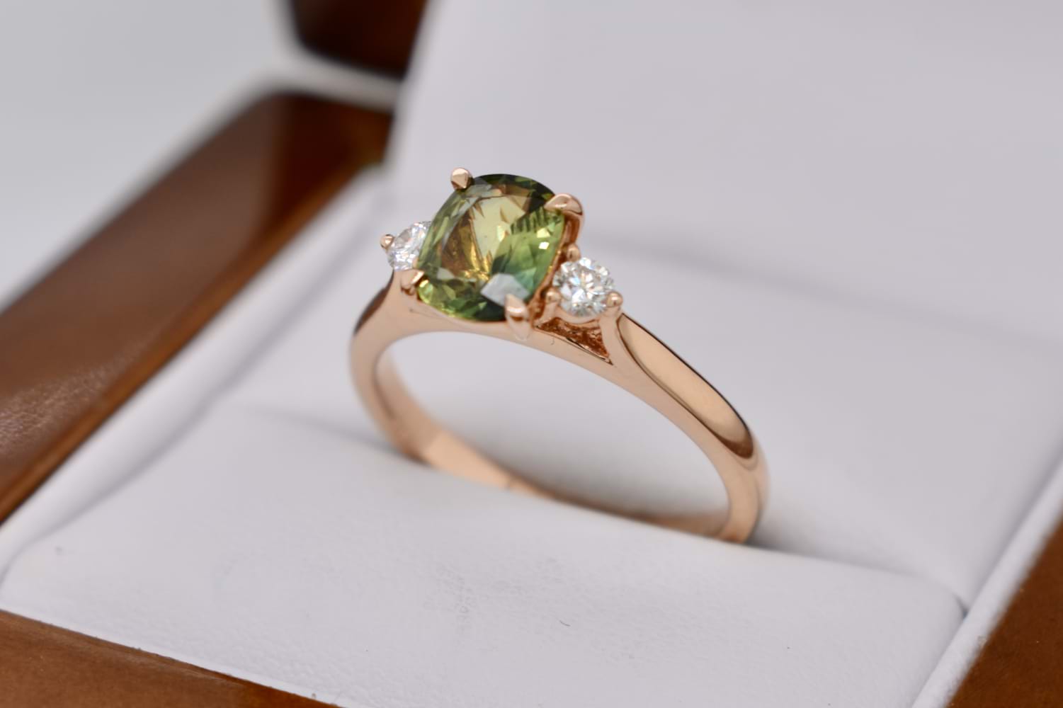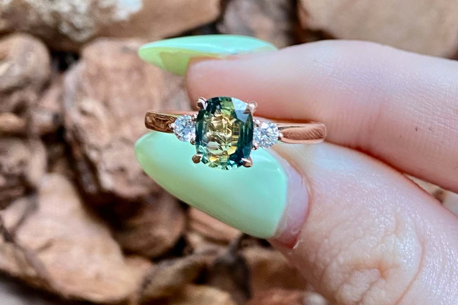 This pretty and dainty ring is crafted in 18ct rose gold and set with a 0.97ct round, Australian parti sapphire with beautiful yellow and green tones in 4 claw settings with a single, sparkling white diamond to either side on a fine tapered band, which has been designed for other bands to sit flush alongside it. Two diamonds equal 0.13ct FG/VS-SI. Finger size M
