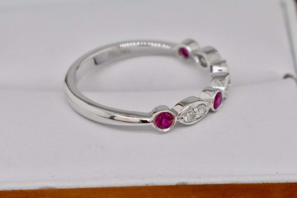 Beautiful 18ct white gold, Art Deco inspired band, featuring six sparkling diamonds set into a marquise shape bezel alternating with pretty rubies set into round bezels. Total diamond content equals 0.10ct and total ruby content equals 0.25cts. Independent Valuation Supplied