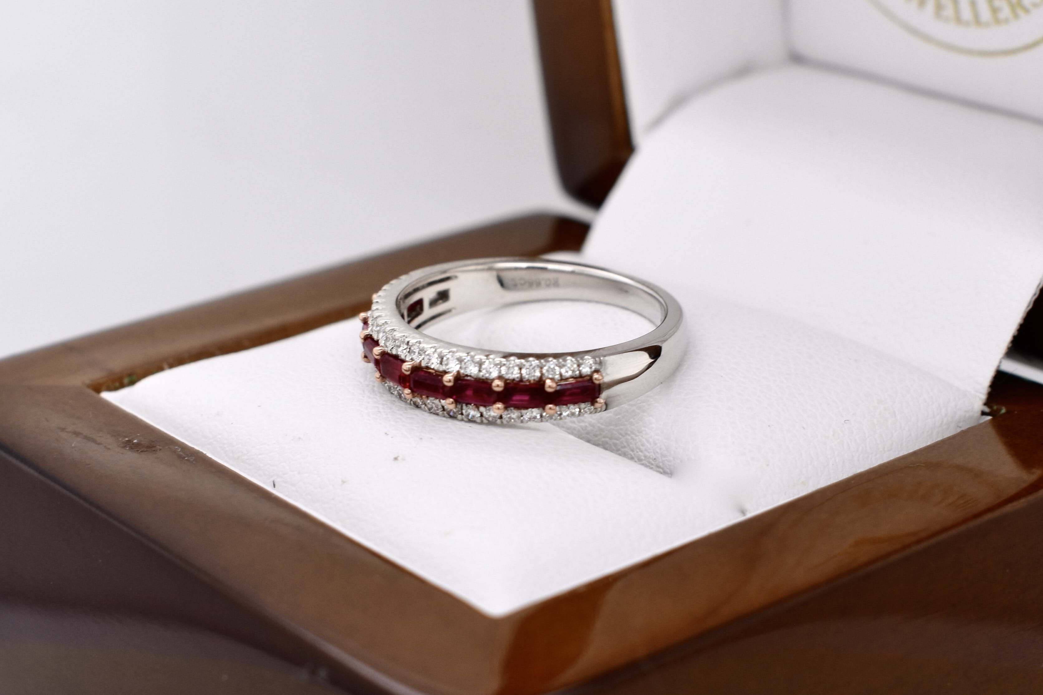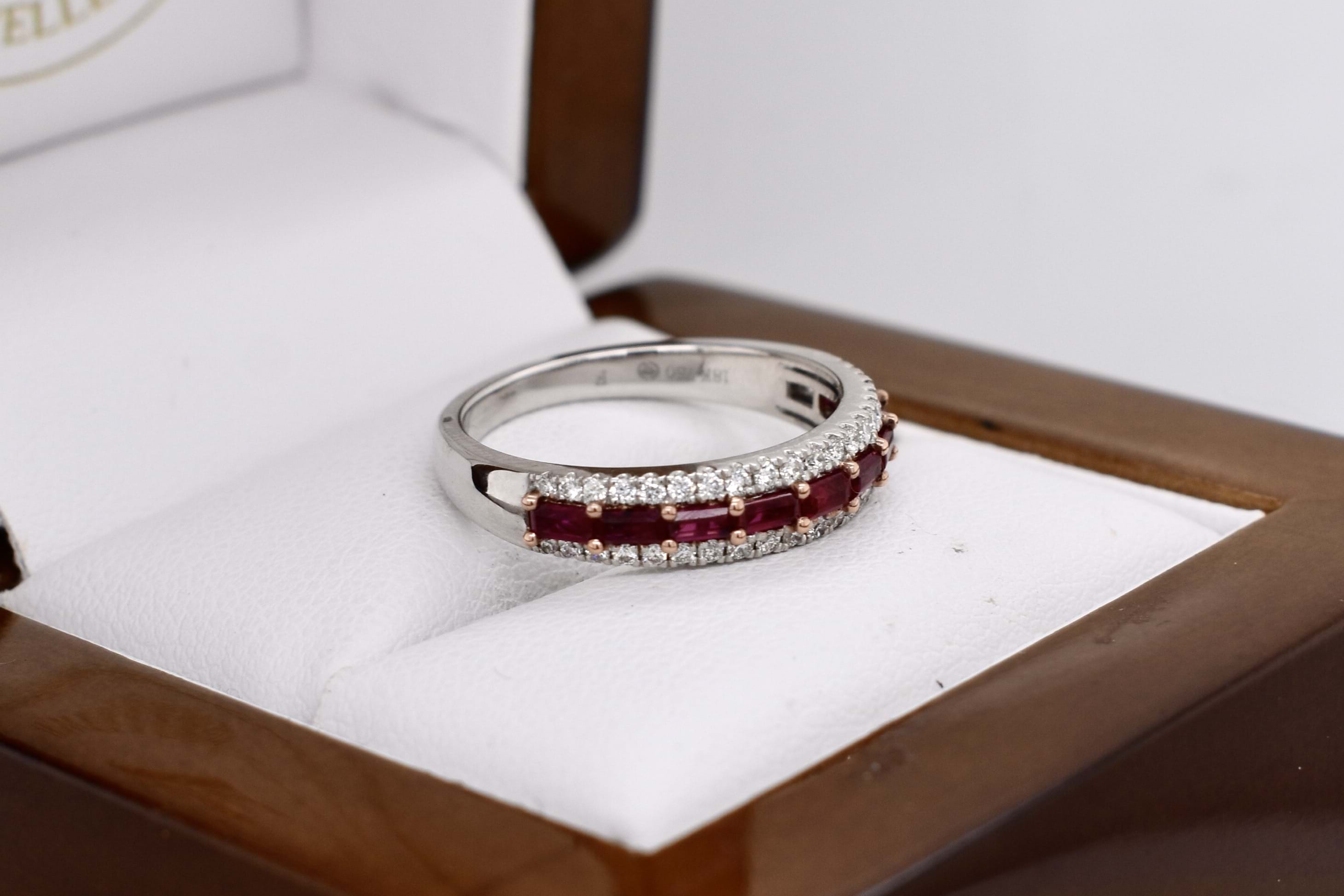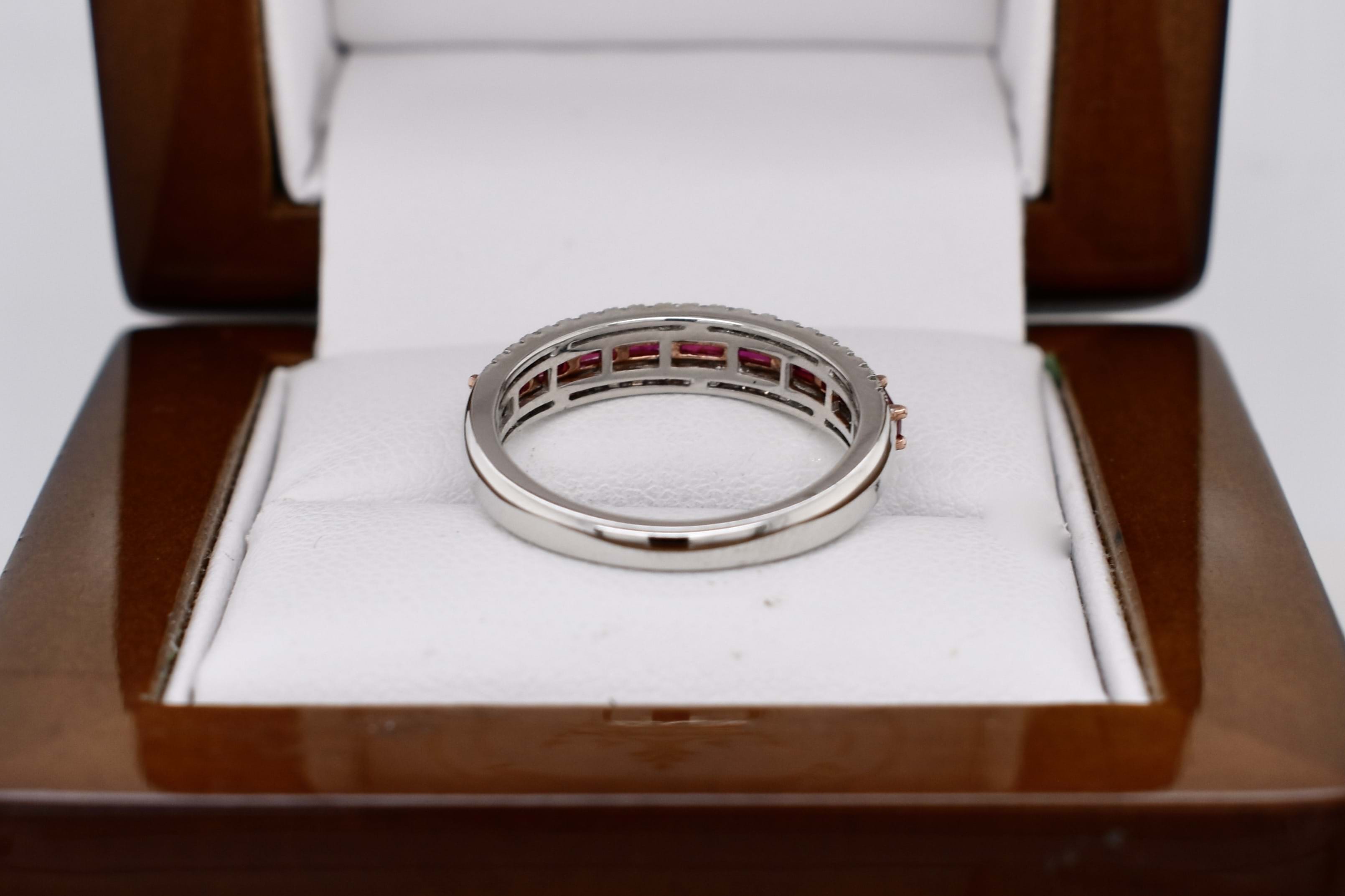 Absolutely stunning, this sweet 18ct white gold band features 9 baguette rubies, measuring 2.9x15-3.3x1.6mm, horizontally shared claw set in a row equalling 0.66ct. With a row of round brilliant cut diamonds set above and below, total of forty-two white diamonds, totalling 0.25ct FG SI. The band tapers from 4.4x2.4mm wide. Finger size M.