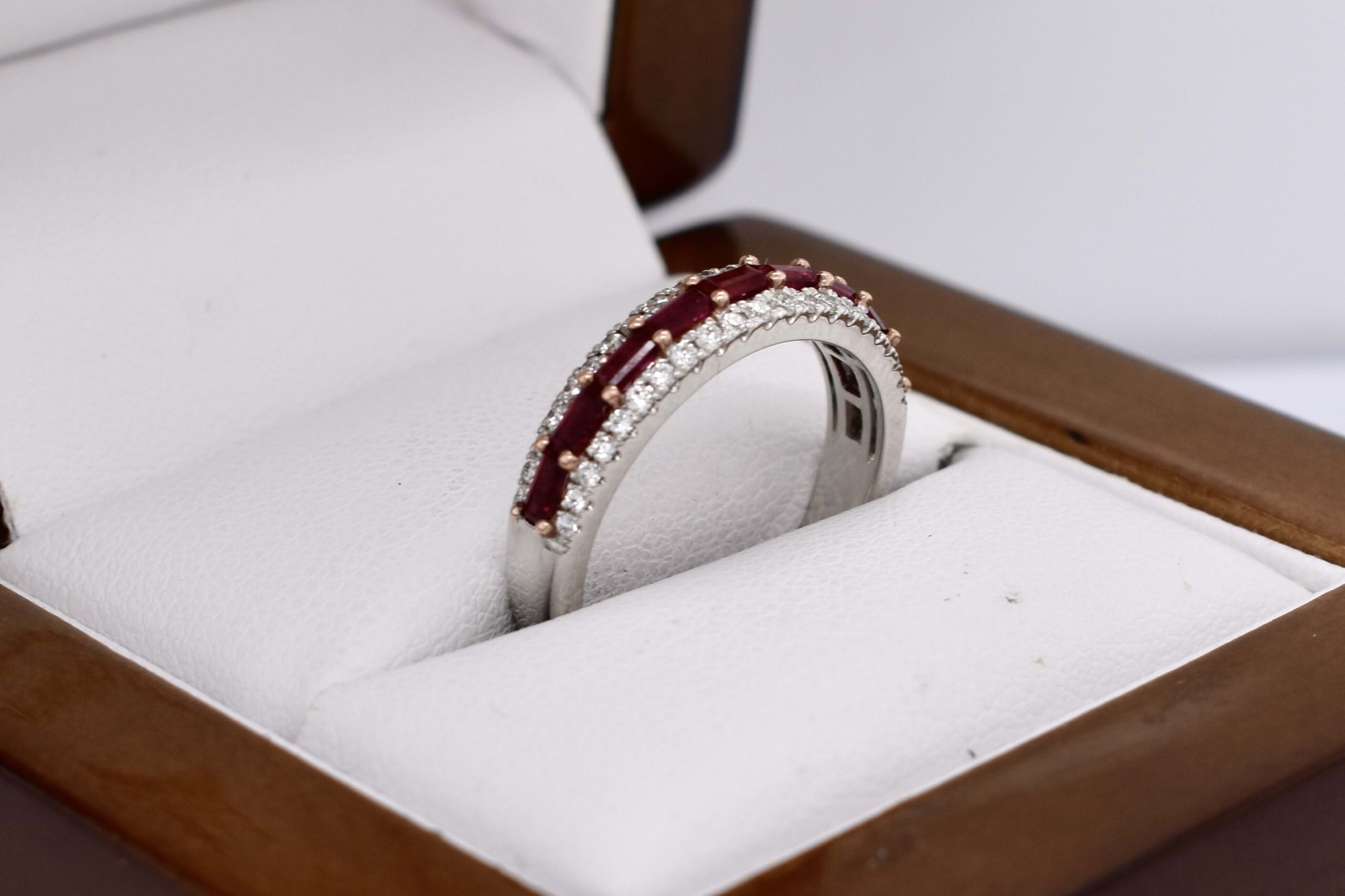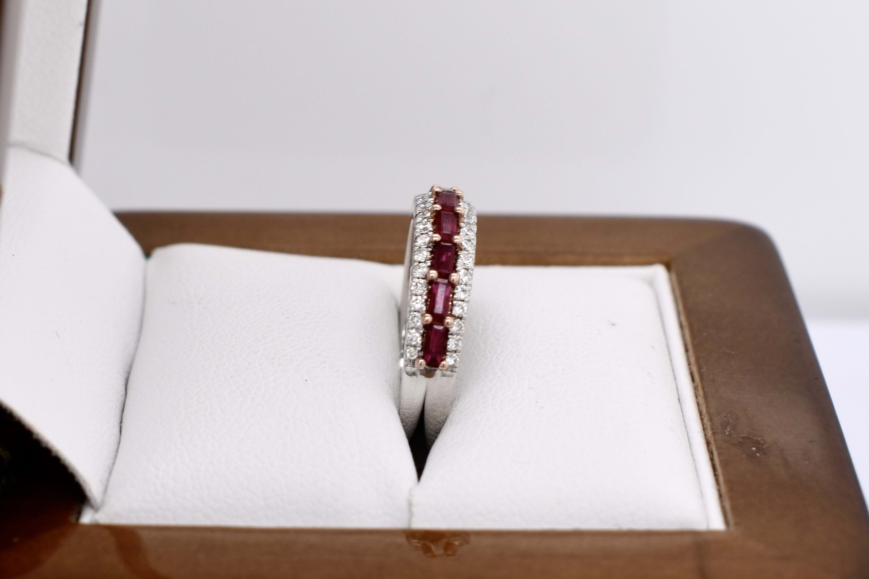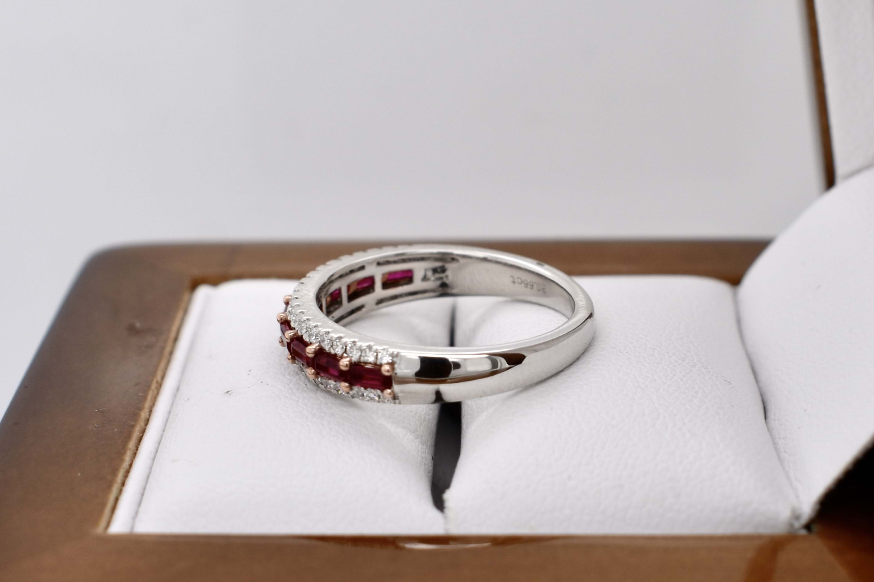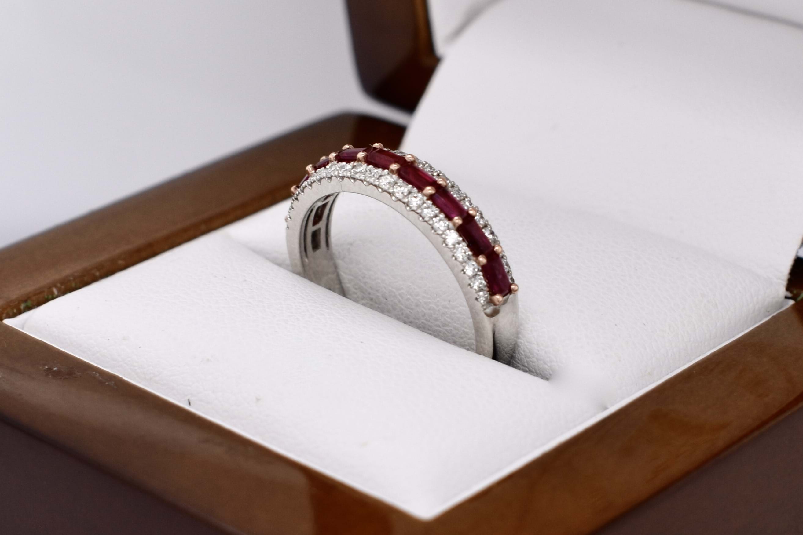 Absolutely stunning, this sweet 18ct white gold band features 9 baguette rubies, measuring 2.9x15-3.3x1.6mm, horizontally shared claw set in a row equalling 0.66ct. With a row of round brilliant cut diamonds set above and below, total of forty-two white diamonds, totalling 0.25ct FG SI. The band tapers from 4.4x2.4mm wide. Finger size M.