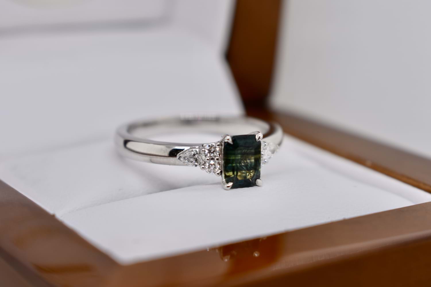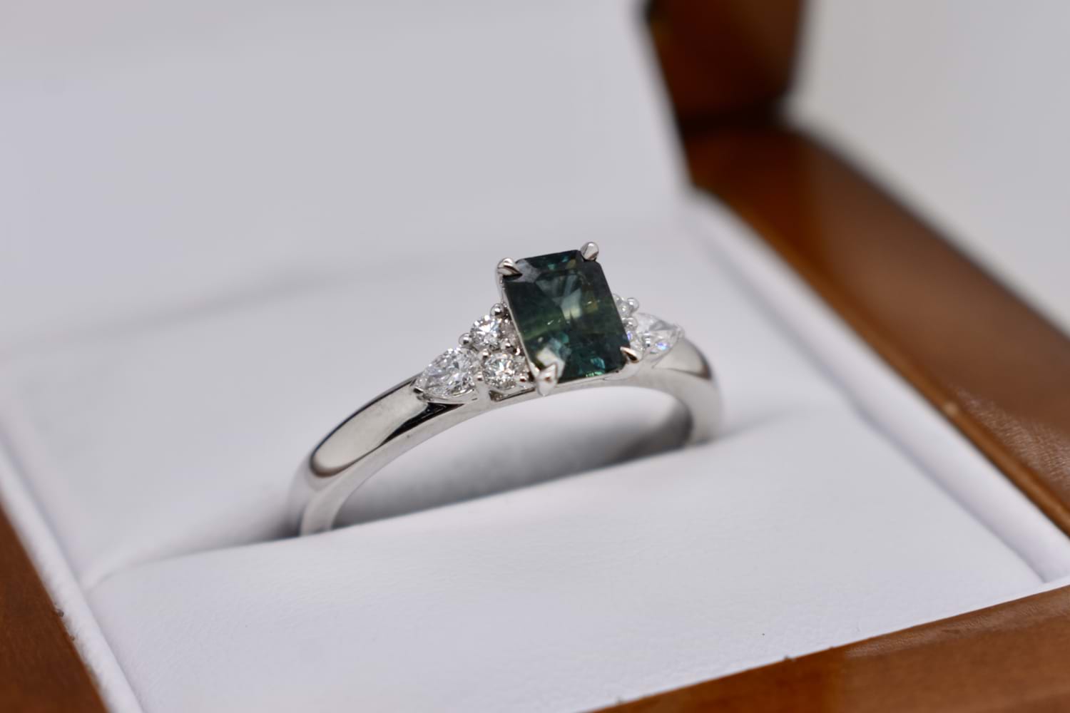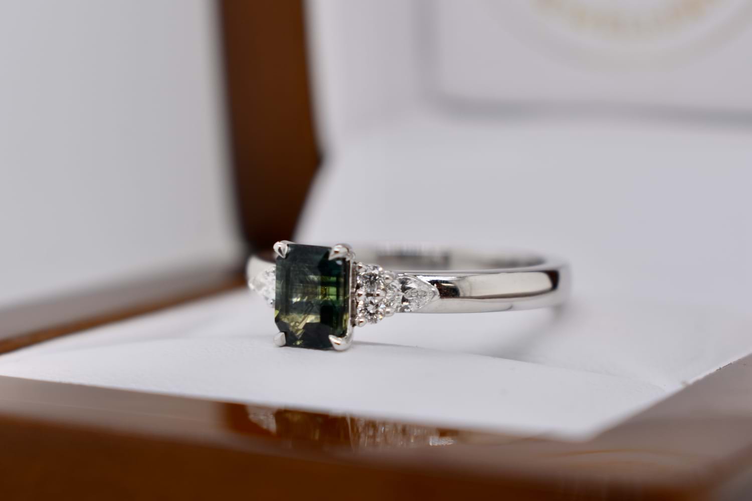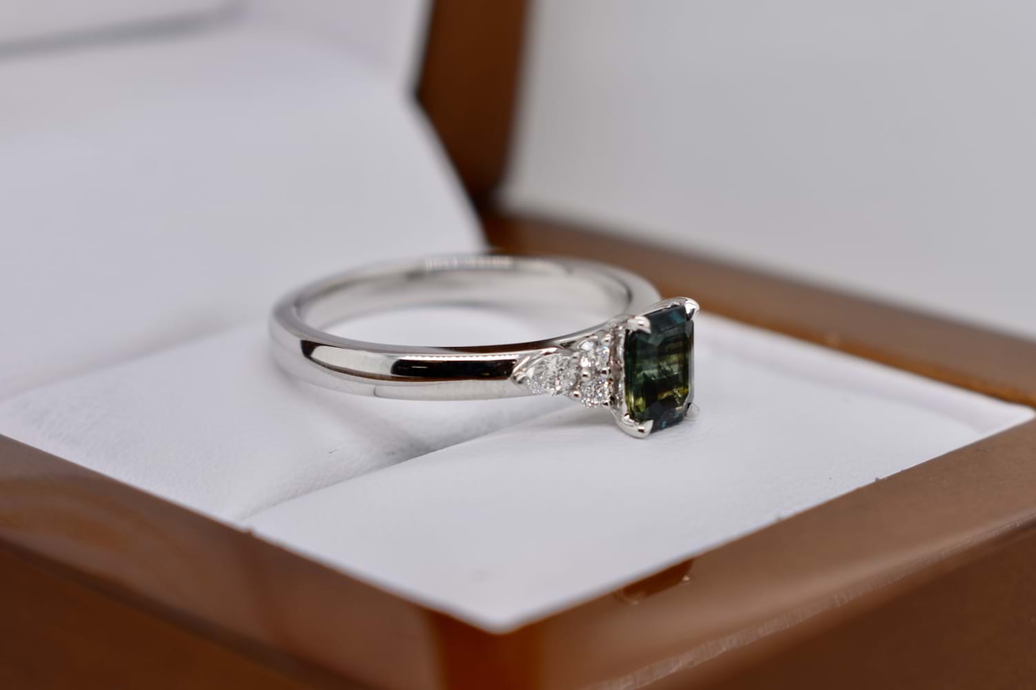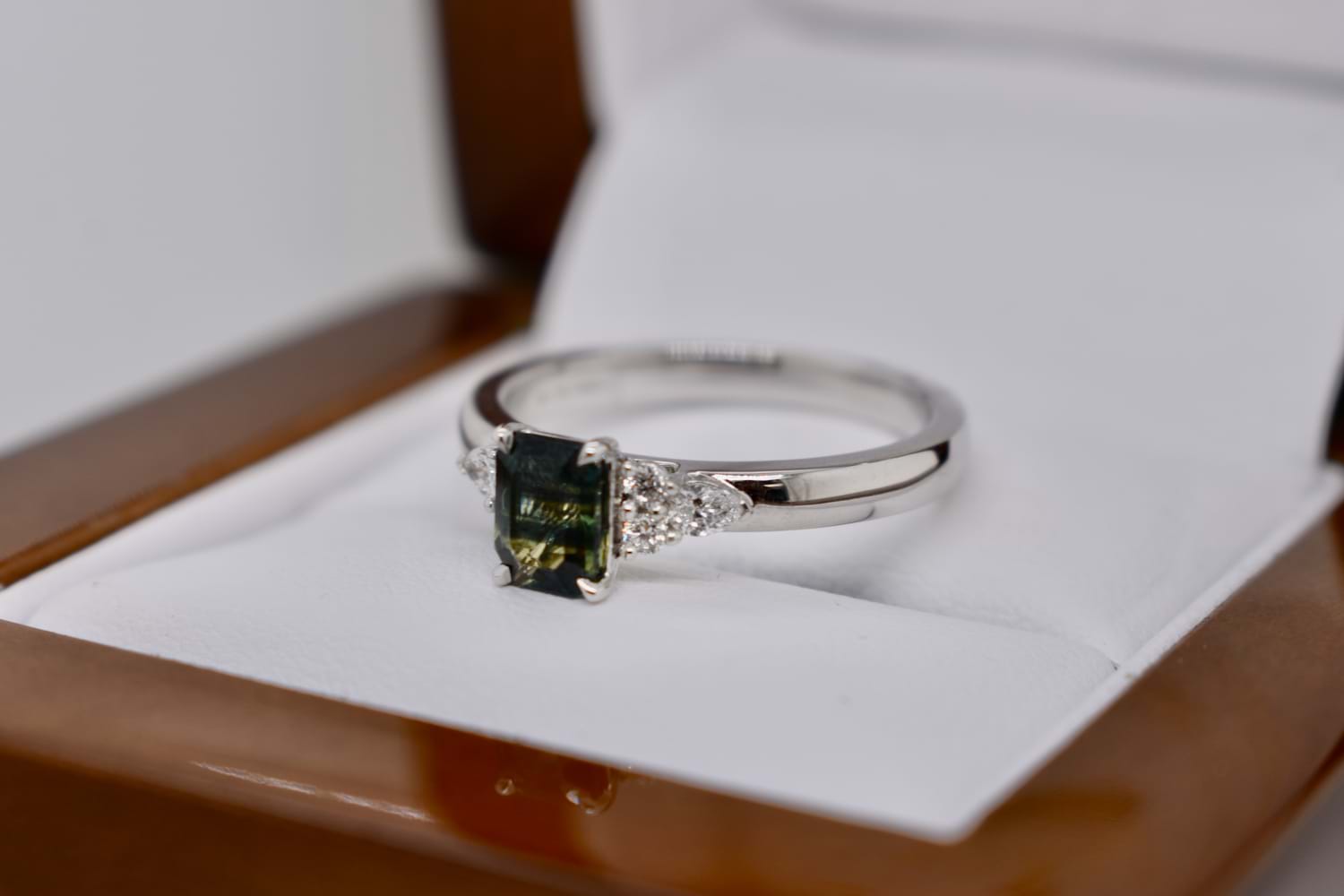 A gorgeous, feminine ring set in 18ct white gold and featuring a 0.78ct emerald cut greenish blue Australian parti sapphire, tapered 4 claw set and with a dainty complement of one marquise and two RBC shimmering white FG/VS-SI diamonds to each shoulder. Total diamond weight equals 0.17ct. This ring has been designed to either wear alone or sit flush next to additional bands. Finger size N