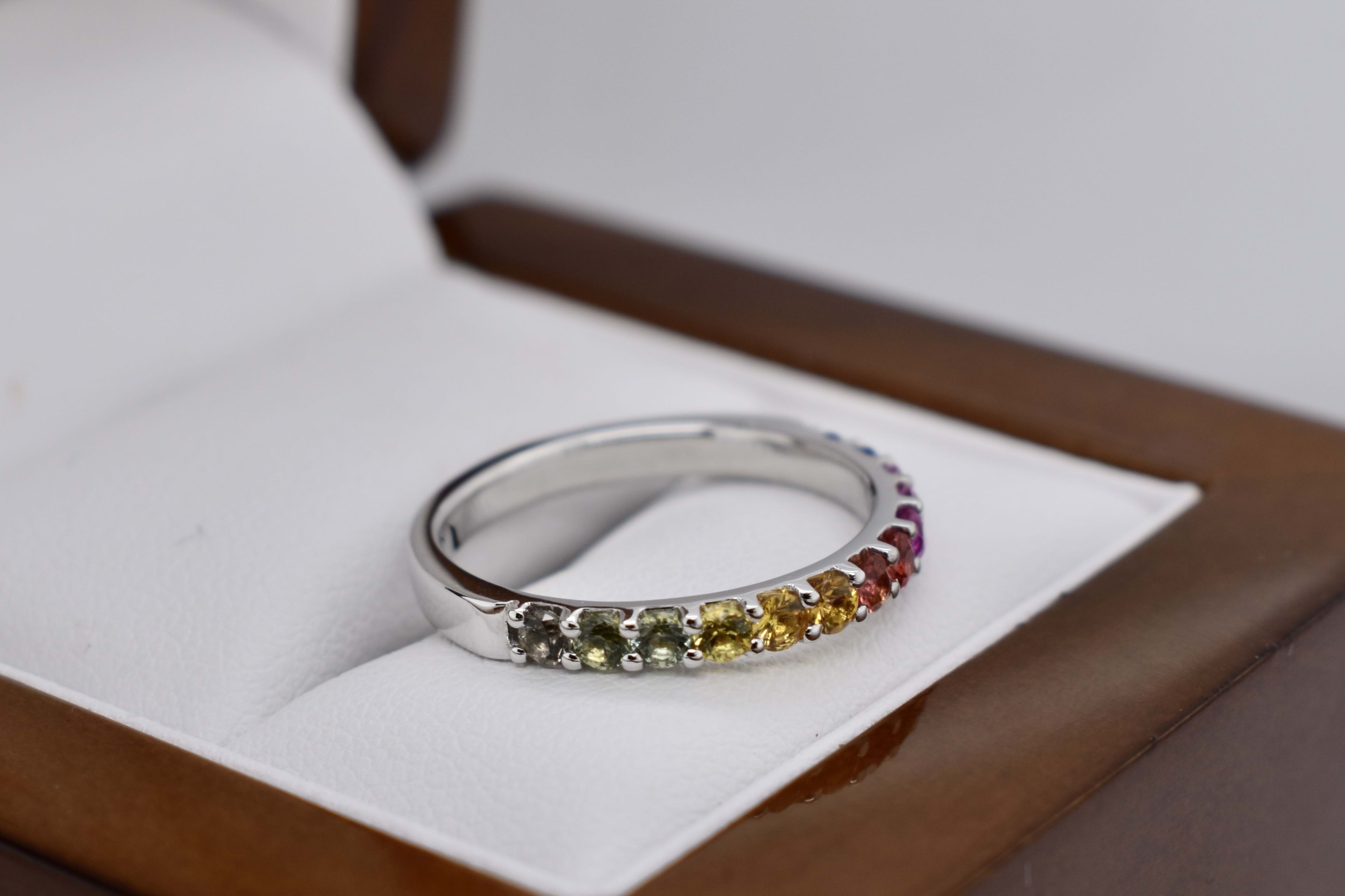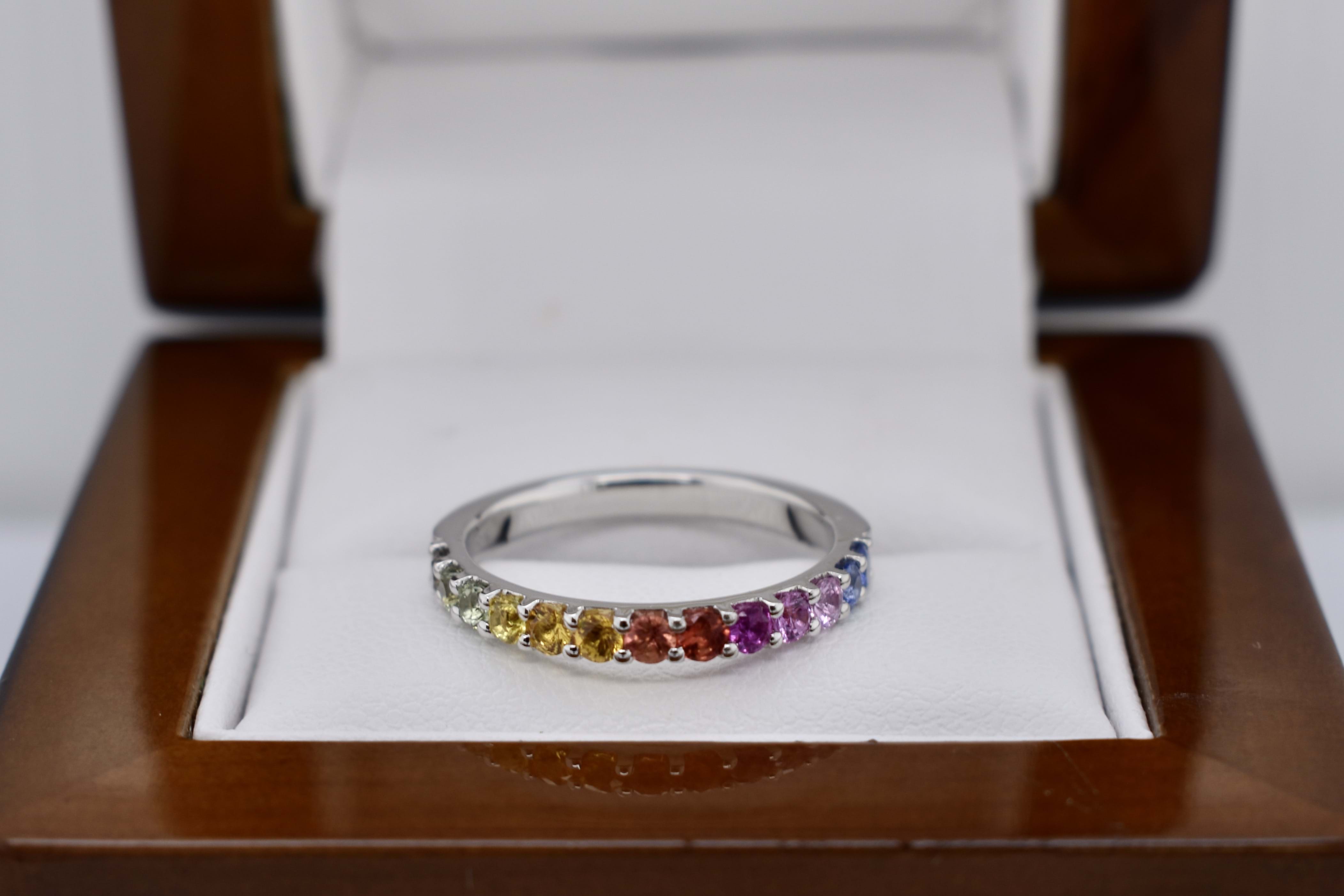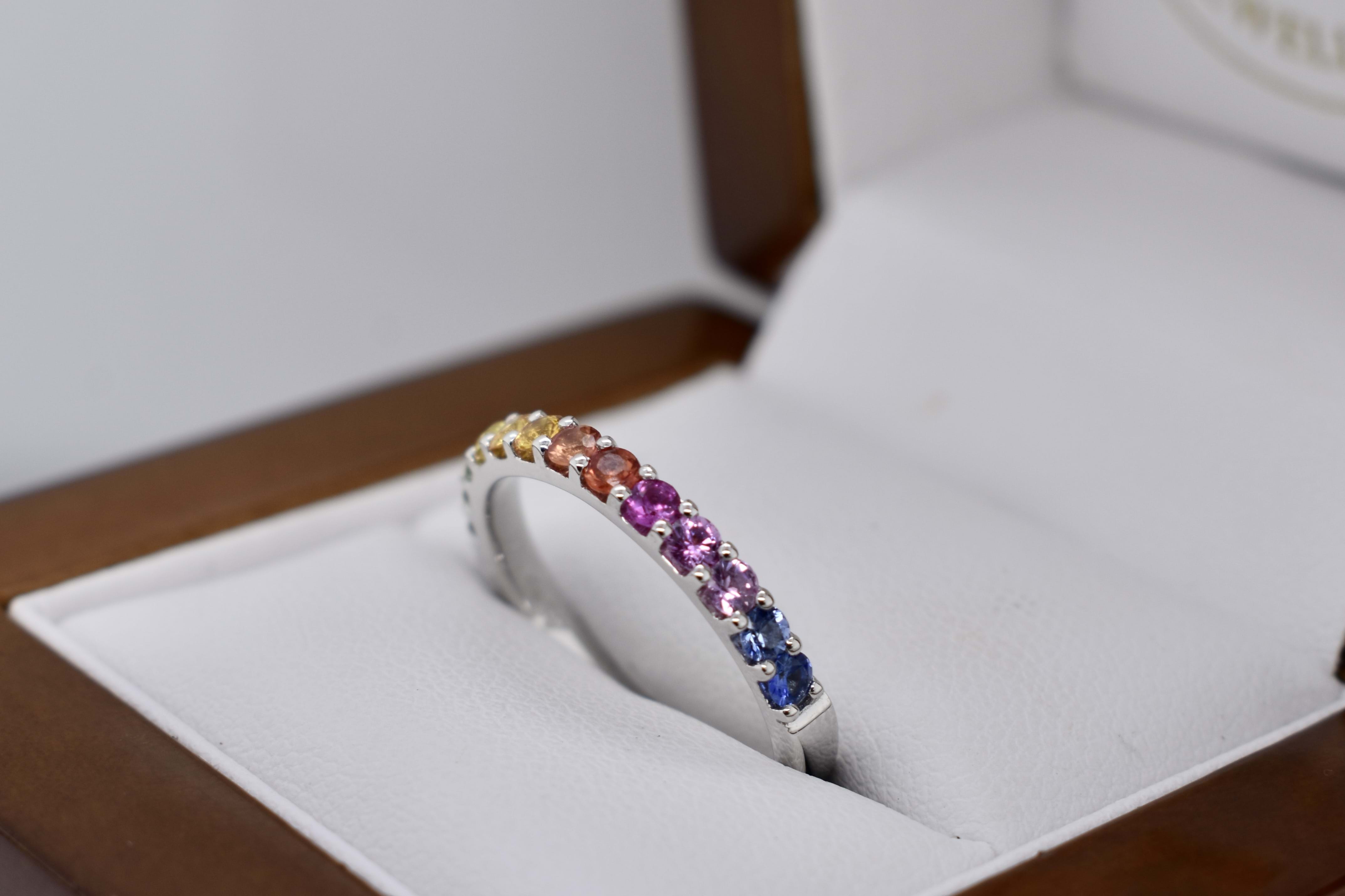 Crafted in 18ct white gold this pretty band features 13 rainbow sapphires totalling 0.80cts in a shared four claw setting. The sapphires range on colour from light blue, dark-light pink, dark-mid orange, dark-mid yellow and light green. Finger size M+ Independent Valuation Supplied