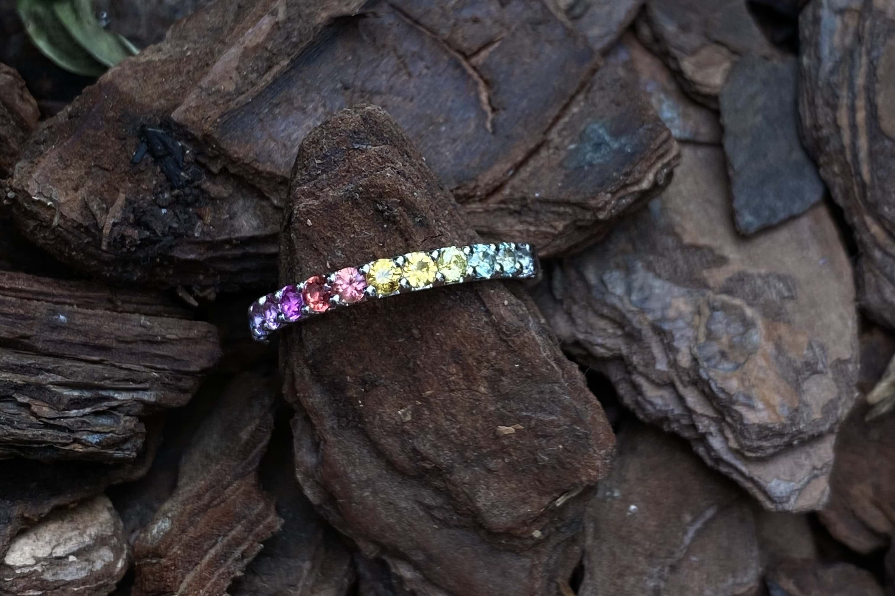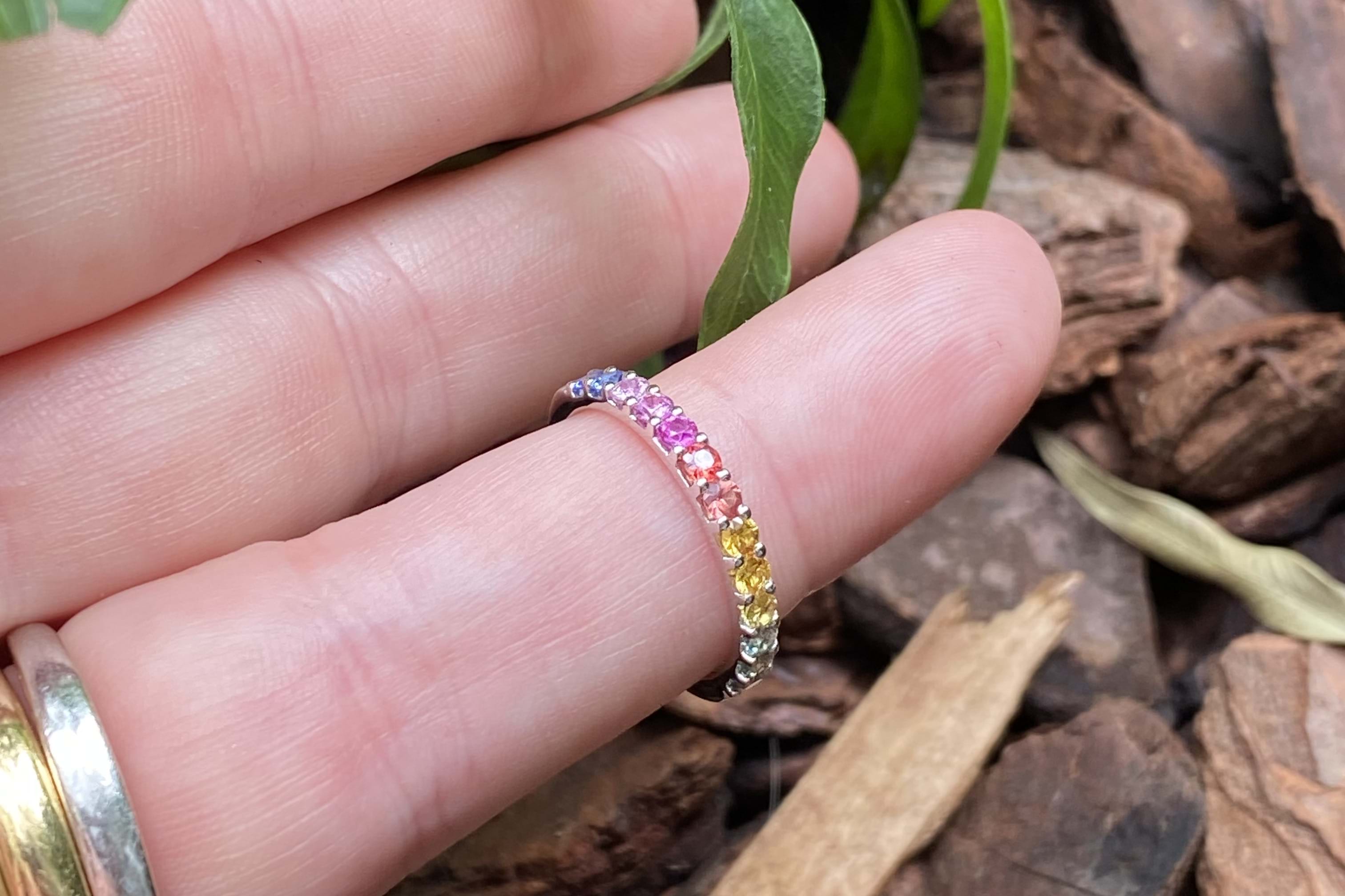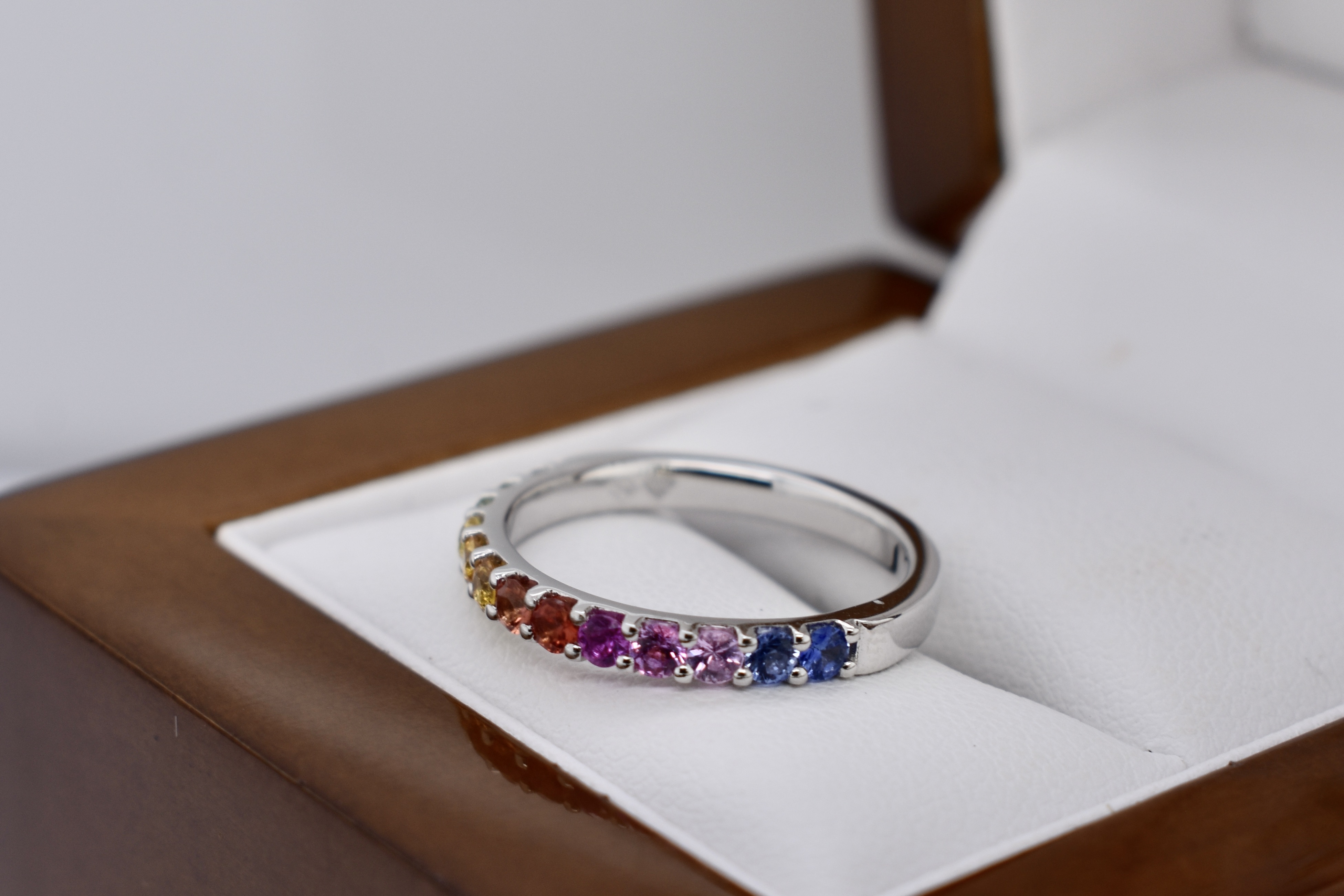 Crafted in 18ct white gold this pretty band features 13 rainbow sapphires totalling 0.80cts in a shared four claw setting. The sapphires range on colour from light blue, dark-light pink, dark-mid orange, dark-mid yellow and light green. Finger size M+ Independent Valuation Supplied