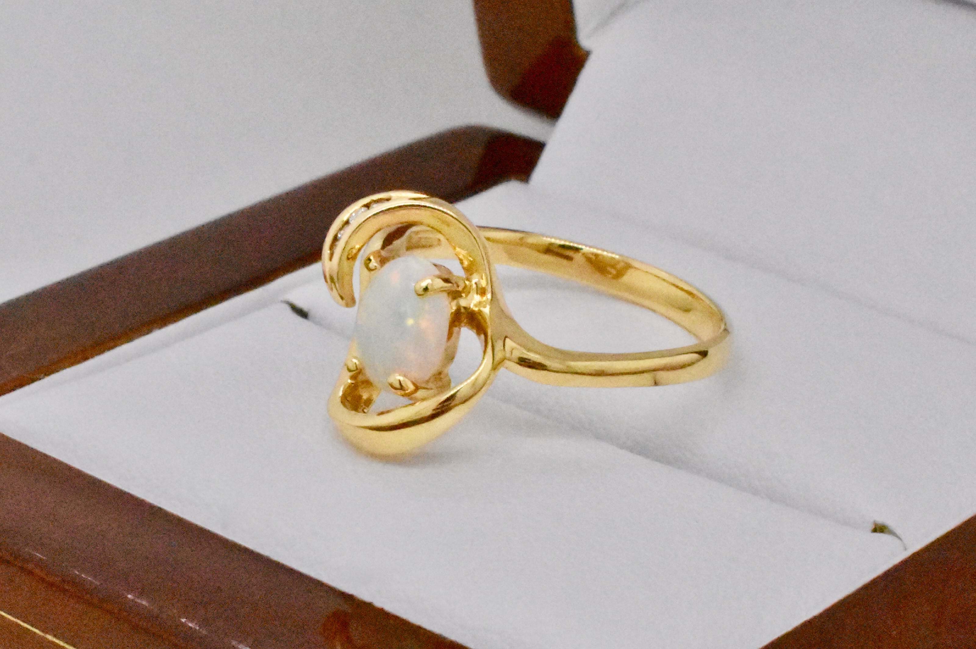 An oval white opal crystal of 0.50cts with orange, pink, blue and green flashes four claw set into the centre of a free flowing design in 18ct yellow gold with a compliment of four round brilliant cut diamonds totalling 0.02cts (H/SI). Independent Valuation Supplied. Finger Size M1/2