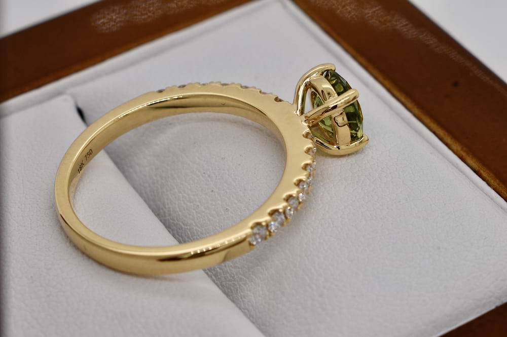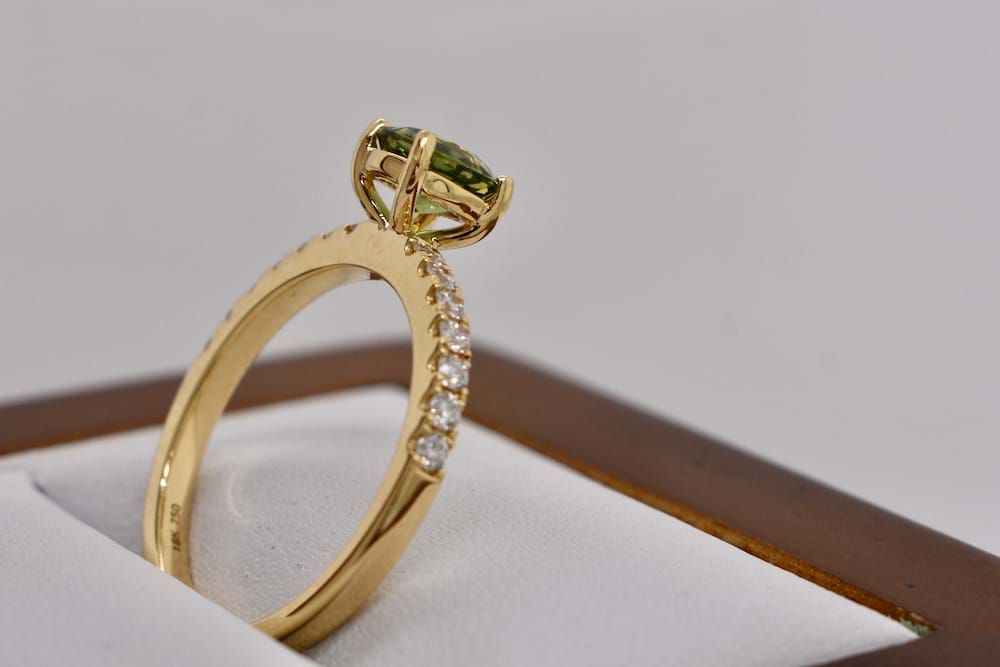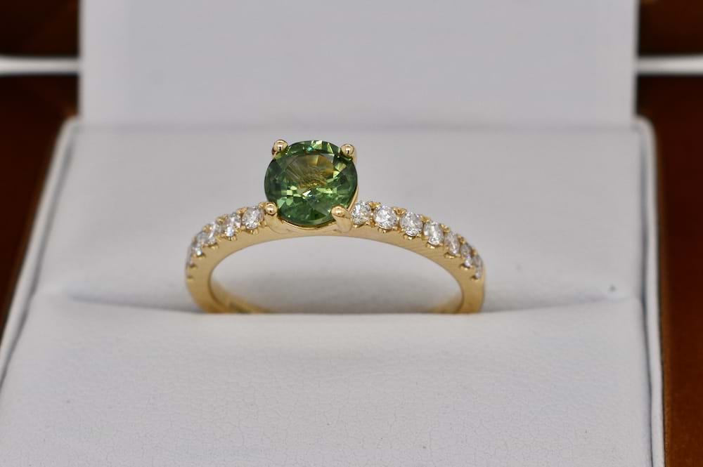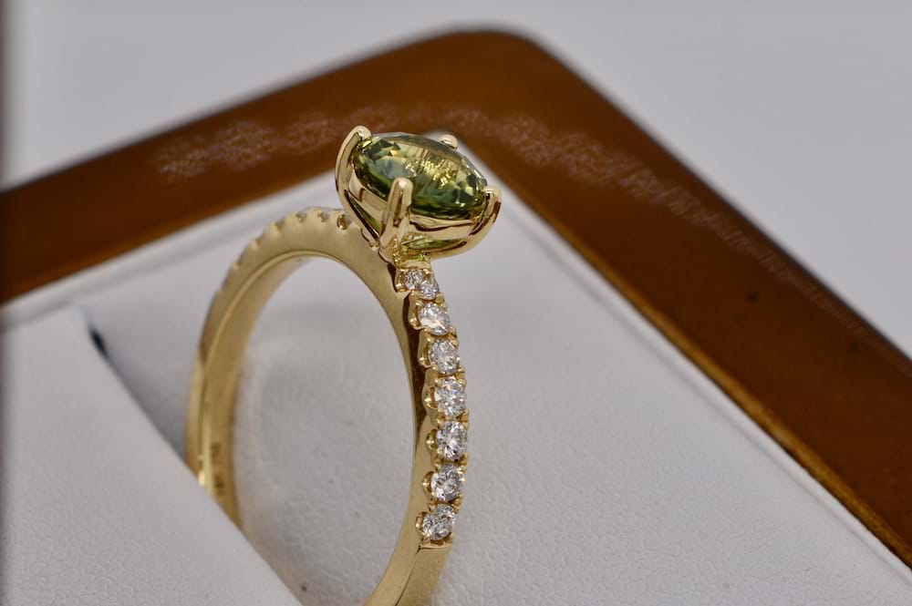 Stunning hand chosen Australian sapphire of 1.10cts with a yellow/bluish/green colour four claw set into an 18ct yellow gold ring with 14 sparkling round brilliant cut diamonds totalling 0.29ct GVS/SI. Designed to sit perfectly with wedding bands this makes a stunning engagement ring for a girl who wants something personalised and unique! Independent Valuation Supplied. Finger size N