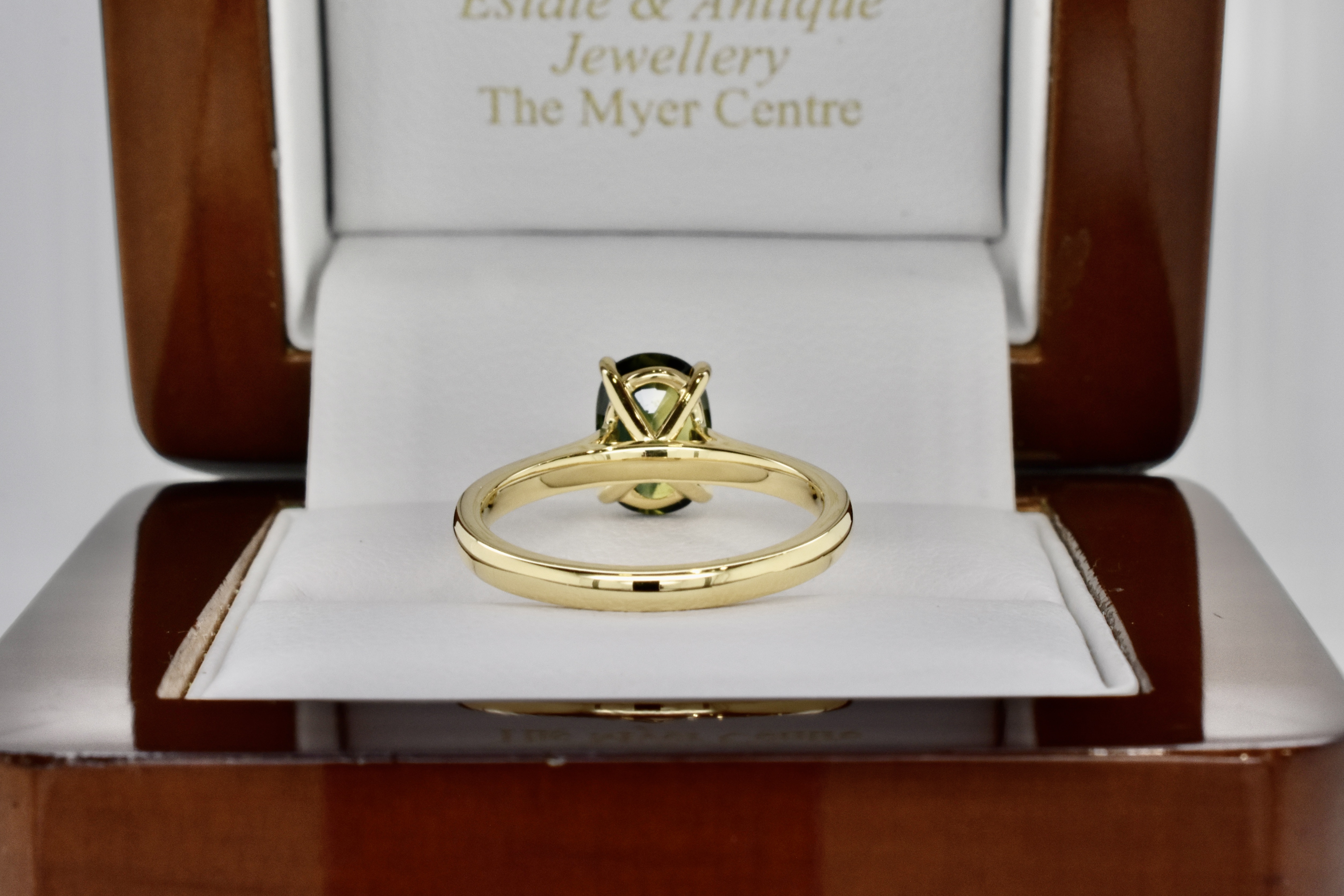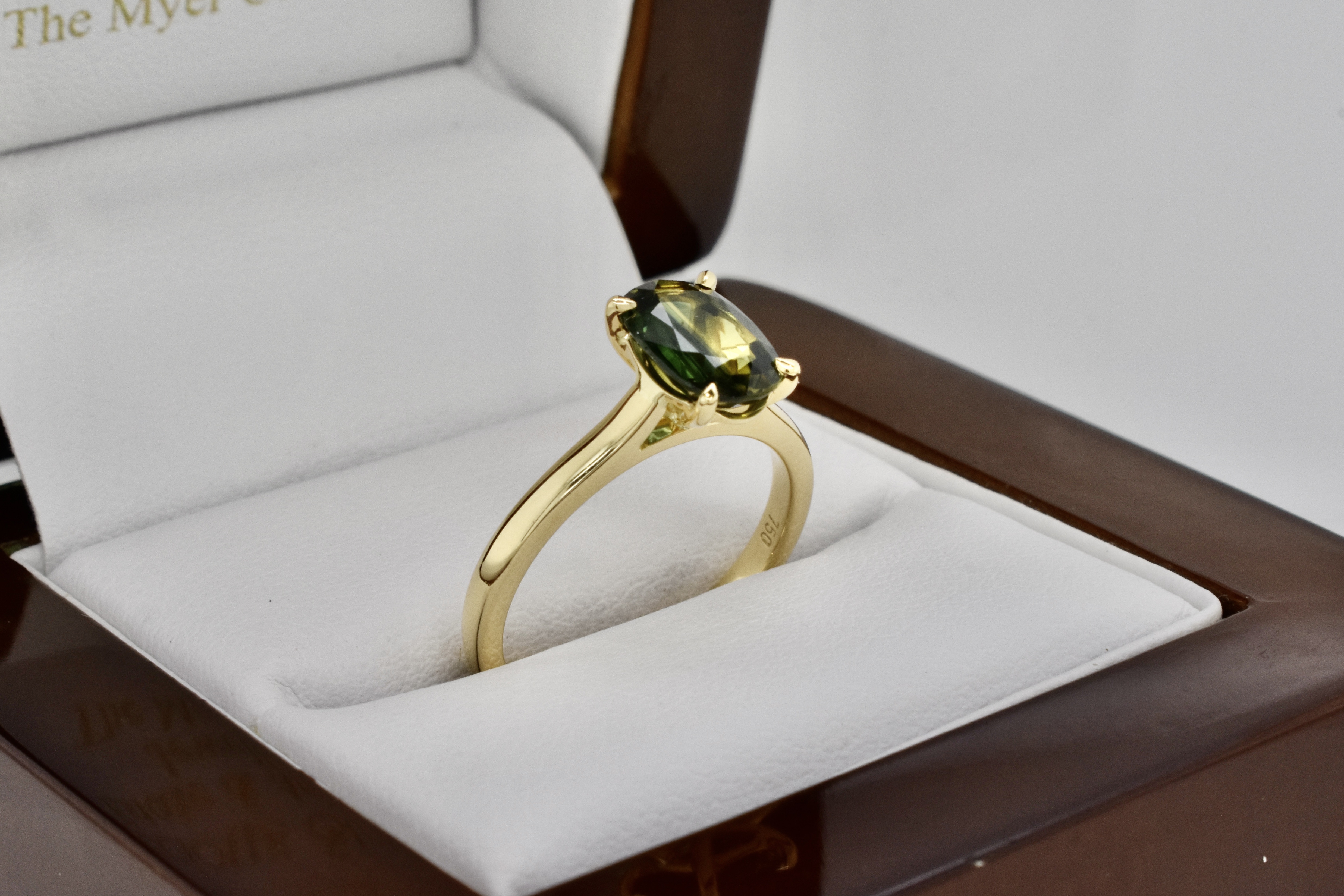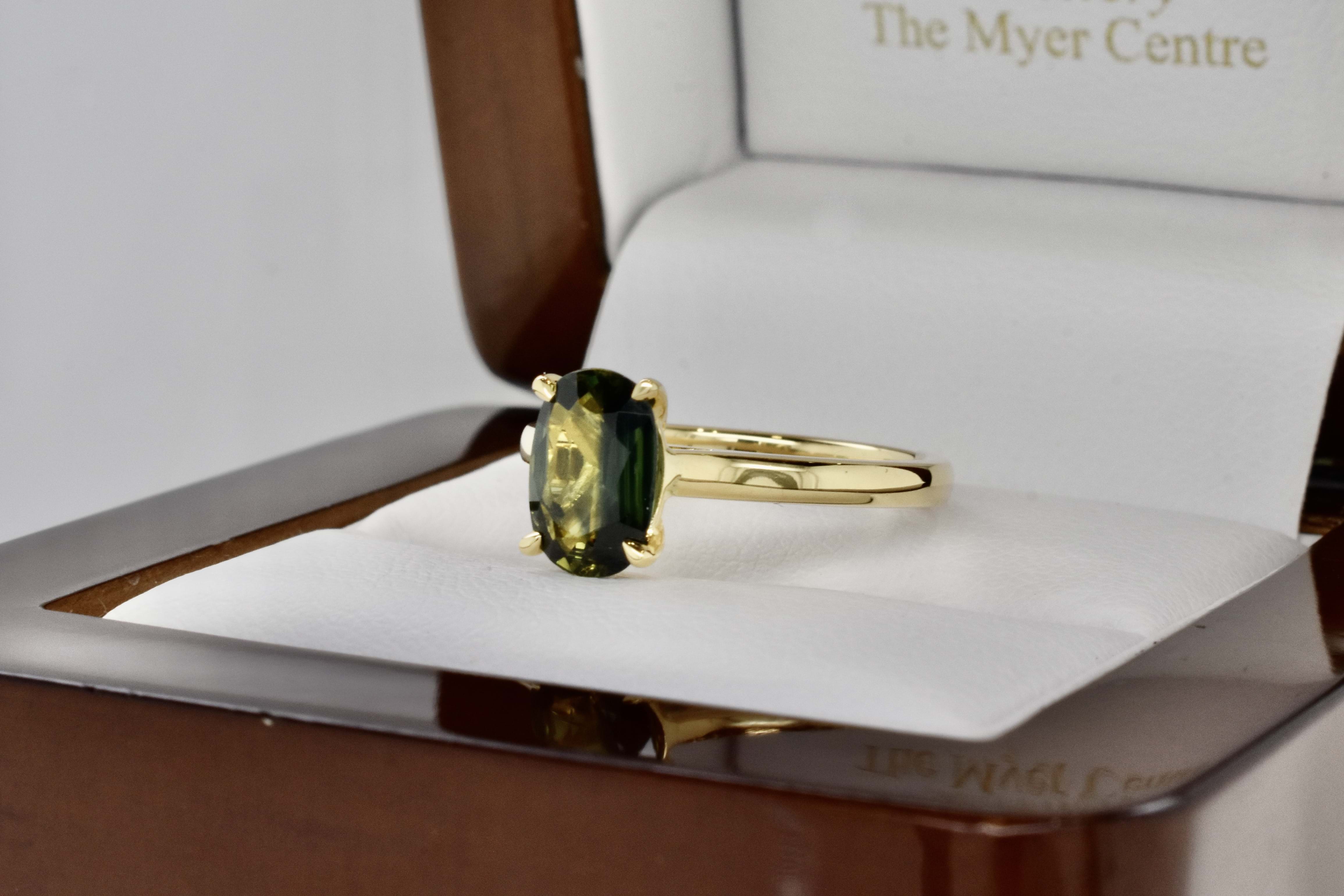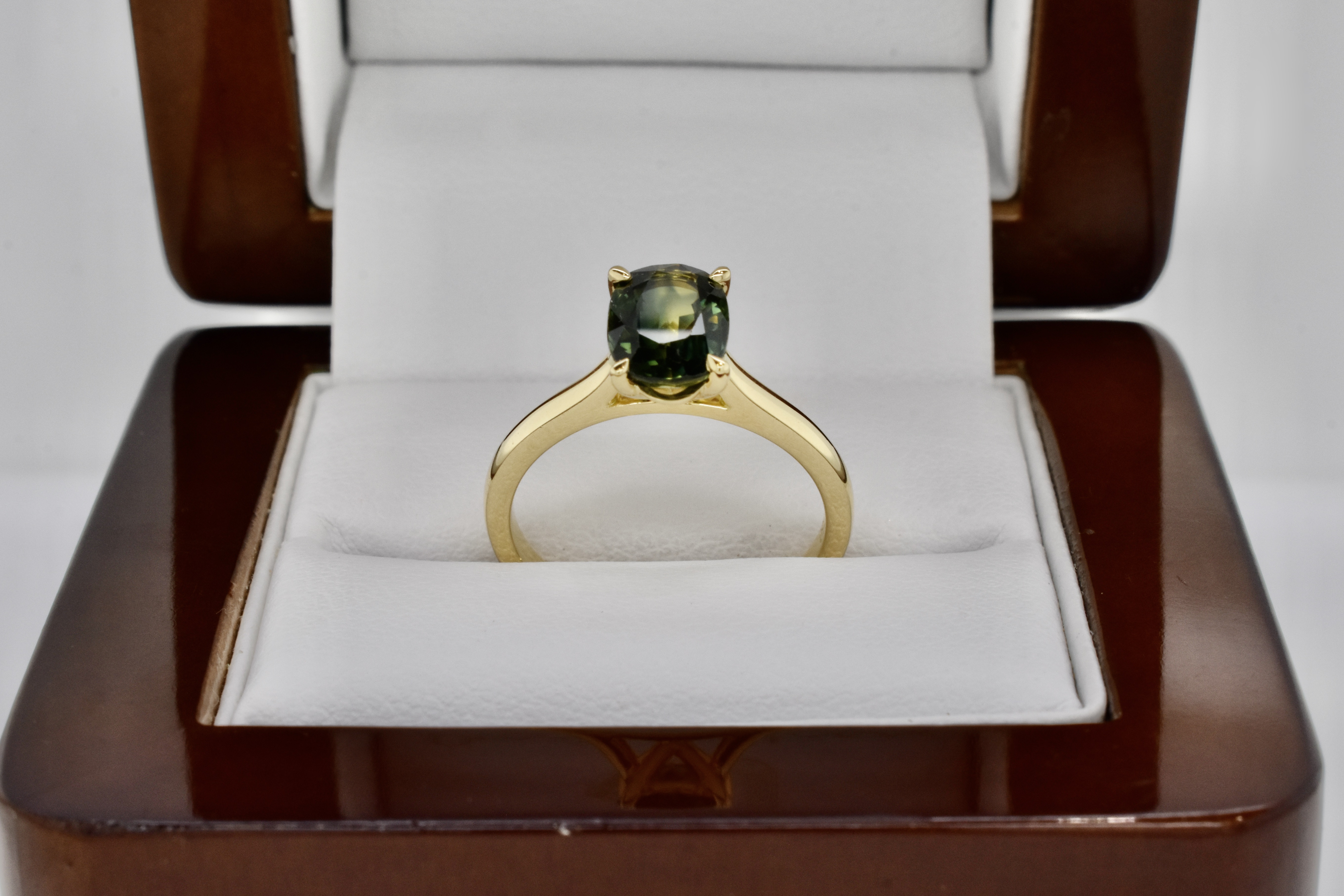 A simple and contemporary solitaire engagement ring expertly crafted in our workshop in 18ct yellow gold and featuring this unique and one of a kind 1.57ct oval Australian parti sapphire. The oval sapphire features cool colour merges and flashes of mid-dark blue/yellow. This ring will sit beautifully with wedding bands of your choice. Finger size K. Independent Valuation Supplied